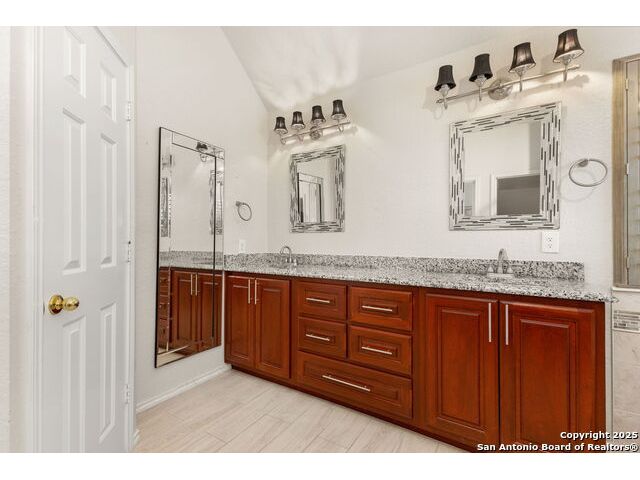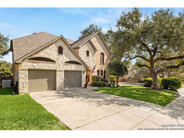 Welcome to Woodbridge in Schertz, TX! Where timeless craftsmanship meets modern elegance. Situated on a desirable corner lot, this beautifully maintained two-story home is surrounded by immaculate landscaping, majestic oak trees, and striking curb appeal. This spacious former model home features 5 bedrooms and 3.5 baths, showcasing an open floor plan, extraordinary attention to detail, and exceptional custom upgrades throughout. Enjoy soaring 20-ft ceilings and a cozy stone fireplace that seamlessly connects the main living area, gourmet kitchen, and breakfast nook. The chef's kitchen features granite countertops, solid wood cabinetry, stainless steel appliances, a custom wine rack, and a convenient study nook, perfect for work, homework, or meal planning. The downstairs guest suite with a private bath is ideal for guests or multi-generational living. Luxurious primary suite offers a serene retreat with a beautiful bay window, freestanding soaking tub, custom walk-in shower, and an elegantly designed double vanity. Step outside to your private backyard oasis, complete with two outdoor living areas, a spacious wood deck with storage, shaded pergola with cooling ceiling fans, and a separate double patio. Ideal for entertaining or relaxing while enjoying peaceful views with no backyard neighbors for added privacy! Additional highlights include a sprinkler system, new water heaters, and energy-efficient construction for long-term comfort and savings. Located in the highly sought-after Woodbridge community of Schertz, this home offers convenient access to top-rated schools, premier shopping, and quick commutes to Randolph AFB, Fort Sam Houston, and San Antonio. The perfect blend of Luxury, Location, and Lifestyle!