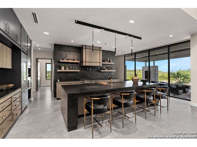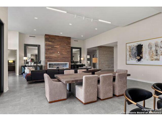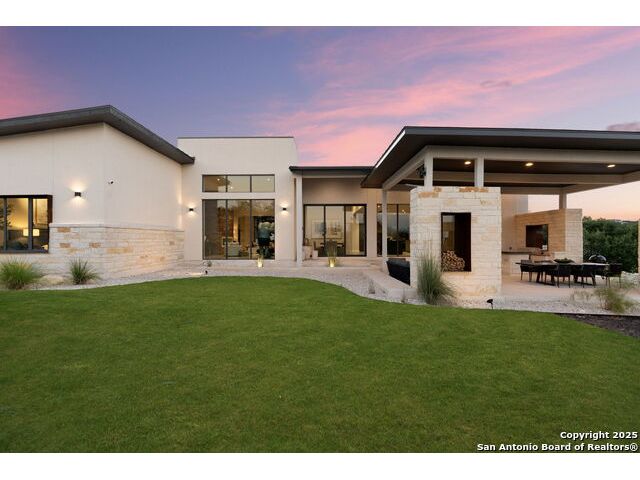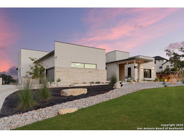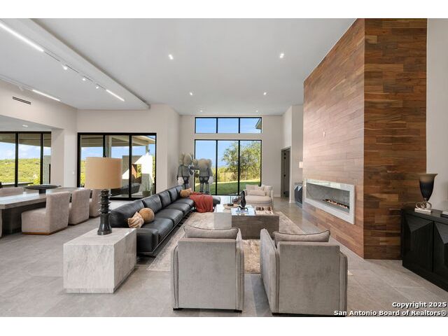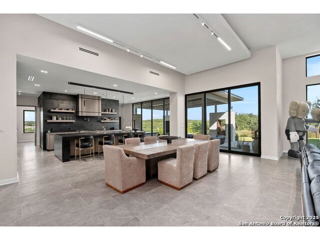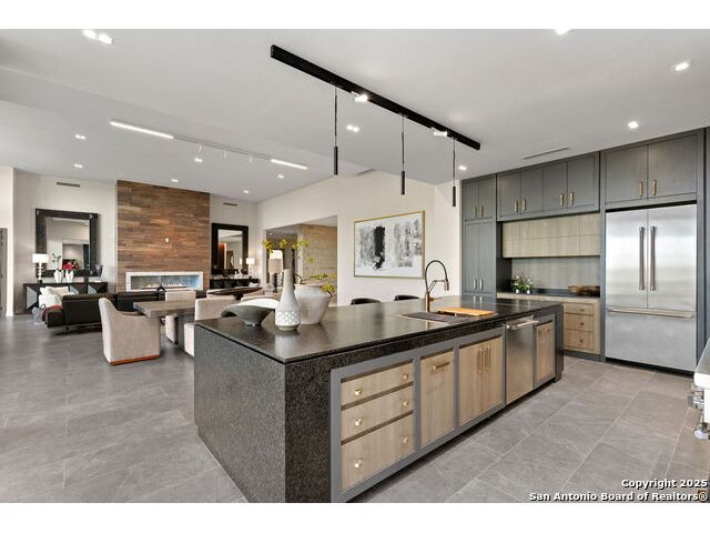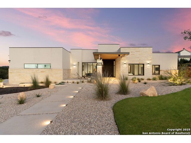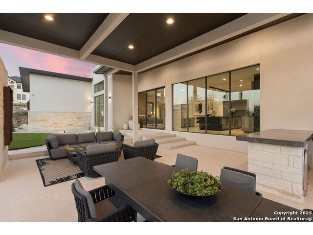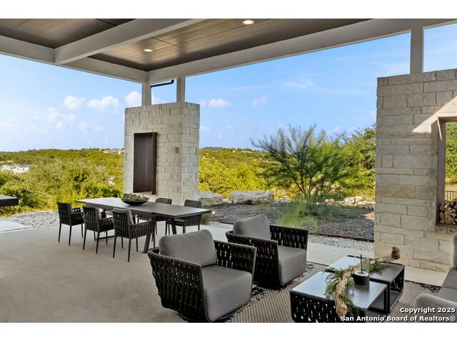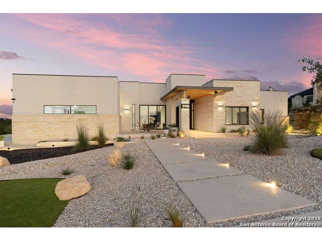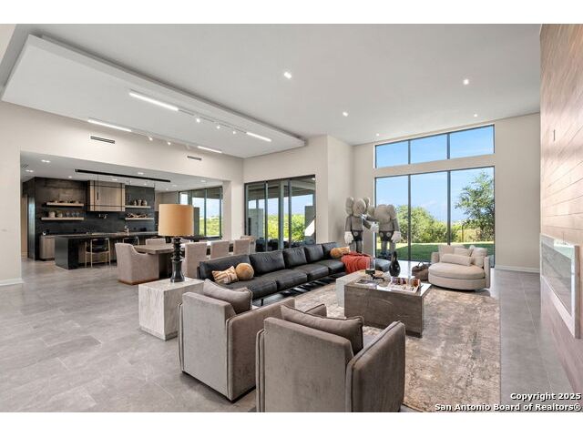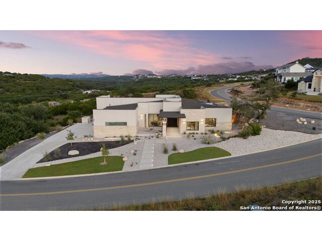 Welcome to a refined contemporary residence that perfectly blends modern elegance with timeless materials. Nestled on an elevated lot, this stunning home offers exceptional privacy and breathtaking extended views. From the moment you arrive, a private drive leads to a discreet side-entry three-car garage, setting the tone for the home's clean architectural lines, smooth stucco finish, and sophisticated limestone accents. Inside, the open-concept layout is flooded with natural light, thanks to soaring ceilings and expansive windows that frame every space. A striking natural wood-accented fireplace wall serves as the focal point of the living area, where large-format tile flooring flows seamlessly throughout. The chef-inspired kitchen is a true showpiece, anchored by a sleek granite island and enhanced with matte black and warm wood cabinetry, open shelving, and full-height pantry storage. Premium Thermador appliances include a commercial-style gas range, wall-mounted microwave, integrated refrigeration, and a convenient pot filler. A deep, modern sink with designer fixtures and under-cabinet lighting complete this high-performance space. Oversized sliding glass doors connect the main living areas to a covered outdoor patio-perfect for al fresco dining or relaxed entertaining. Framed by elegant stone columns and recessed lighting, the outdoor space is surrounded by thoughtfully landscaped grounds. The serene primary suite offers a generous layout and is thoughtfully designed for both comfort and flexibility. The spa-style en-suite bathroom is a private retreat, featuring a floating dual vanity, a freestanding soaking tub, and a frameless walk-in shower with a rainfall fixture, all wrapped in luxurious large-format tile. This home masterfully balances comfort, style, and functionality-delivering a lifestyle of understated luxury in one of San Antonio's most desirable neighborhoods.