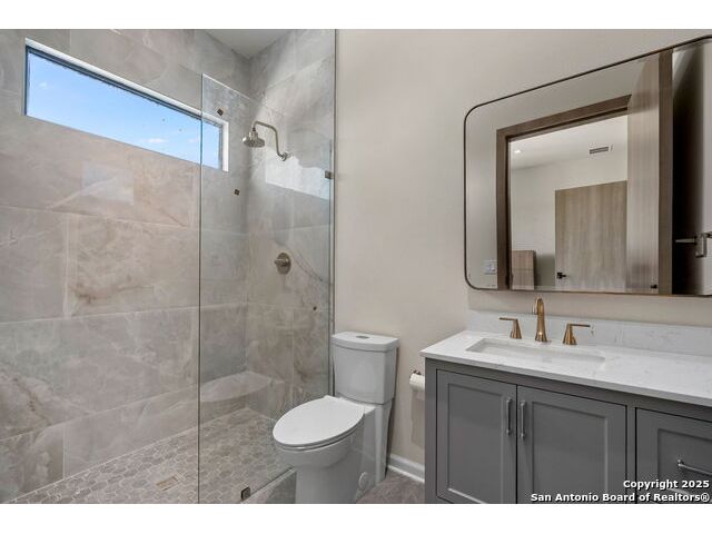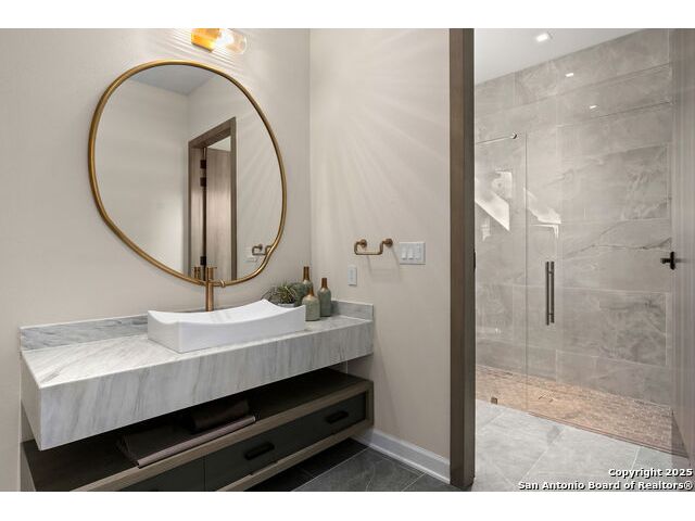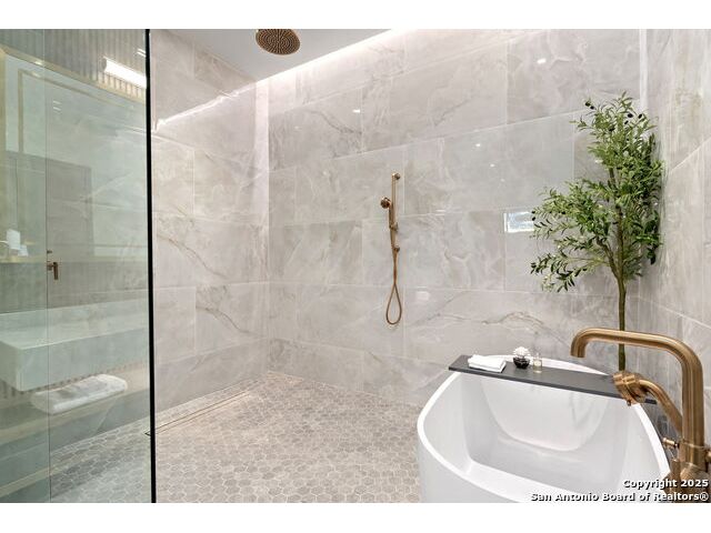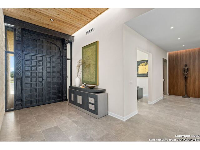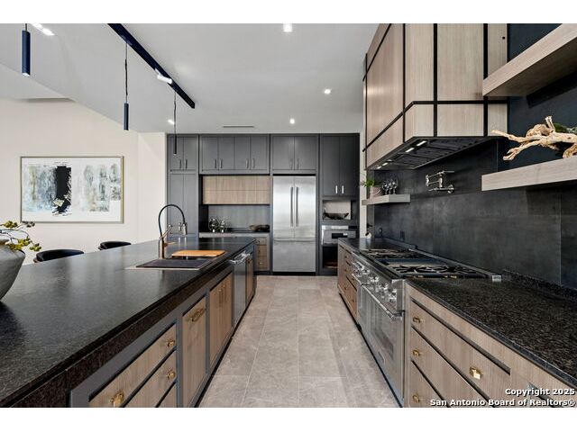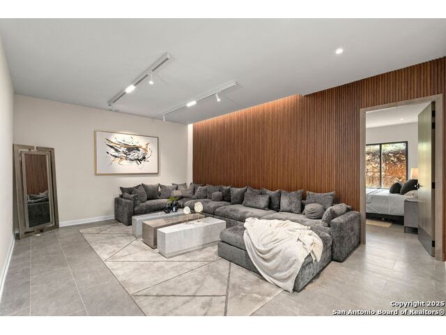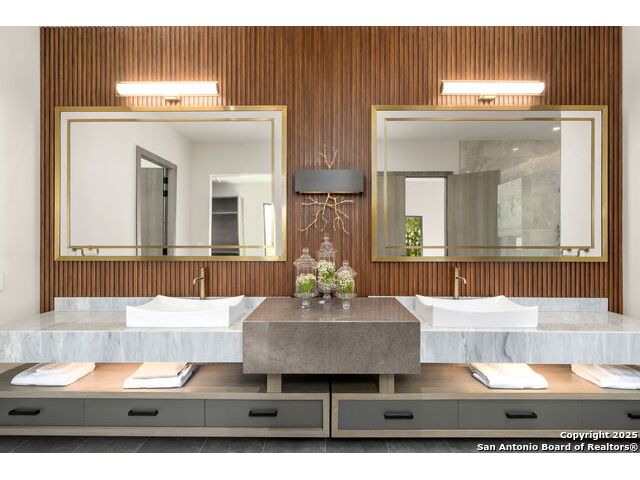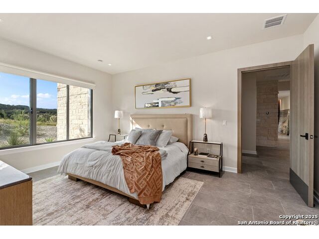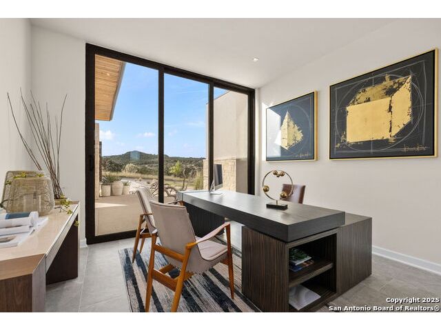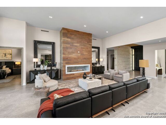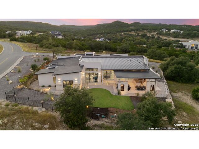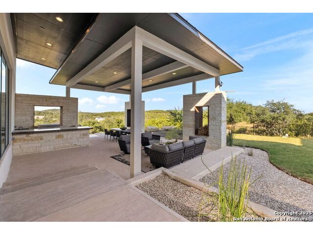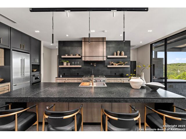 Welcome to a refined contemporary residence that perfectly blends modern elegance with timeless materials. Nestled on an elevated lot, this stunning home offers exceptional privacy and breathtaking extended views. From the moment you arrive, a private drive leads to a discreet side-entry three-car garage, setting the tone for the home's clean architectural lines, smooth stucco finish, and sophisticated limestone accents. Inside, the open-concept layout is flooded with natural light, thanks to soaring ceilings and expansive windows that frame every space. A striking natural wood-accented fireplace wall serves as the focal point of the living area, where large-format tile flooring flows seamlessly throughout. The chef-inspired kitchen is a true showpiece, anchored by a sleek granite island and enhanced with matte black and warm wood cabinetry, open shelving, and full-height pantry storage. Premium Thermador appliances include a commercial-style gas range, wall-mounted microwave, integrated refrigeration, and a convenient pot filler. A deep, modern sink with designer fixtures and under-cabinet lighting complete this high-performance space. Oversized sliding glass doors connect the main living areas to a covered outdoor patio-perfect for al fresco dining or relaxed entertaining. Framed by elegant stone columns and recessed lighting, the outdoor space is surrounded by thoughtfully landscaped grounds. The serene primary suite offers a generous layout and is thoughtfully designed for both comfort and flexibility. The spa-style en-suite bathroom is a private retreat, featuring a floating dual vanity, a freestanding soaking tub, and a frameless walk-in shower with a rainfall fixture, all wrapped in luxurious large-format tile. This home masterfully balances comfort, style, and functionality-delivering a lifestyle of understated luxury in one of San Antonio's most desirable neighborhoods.