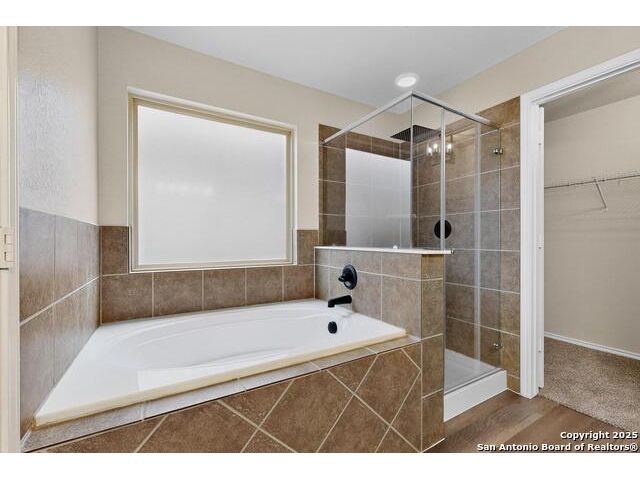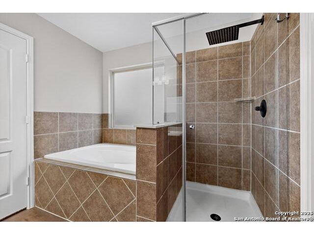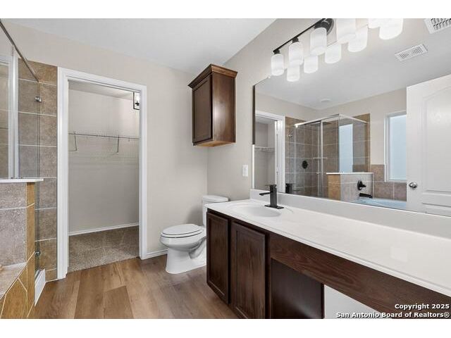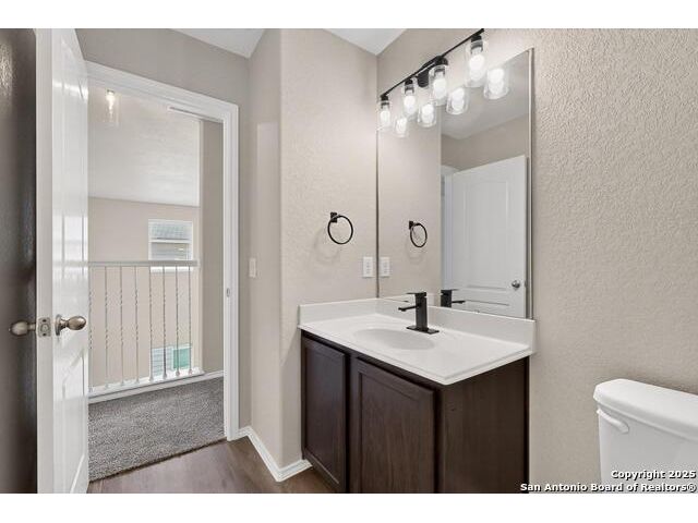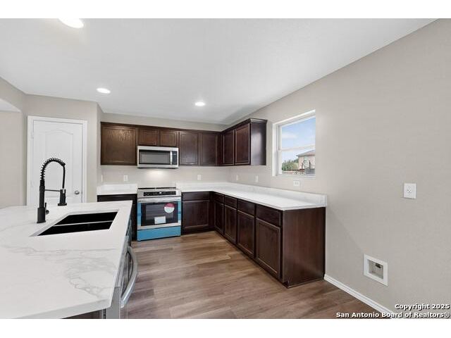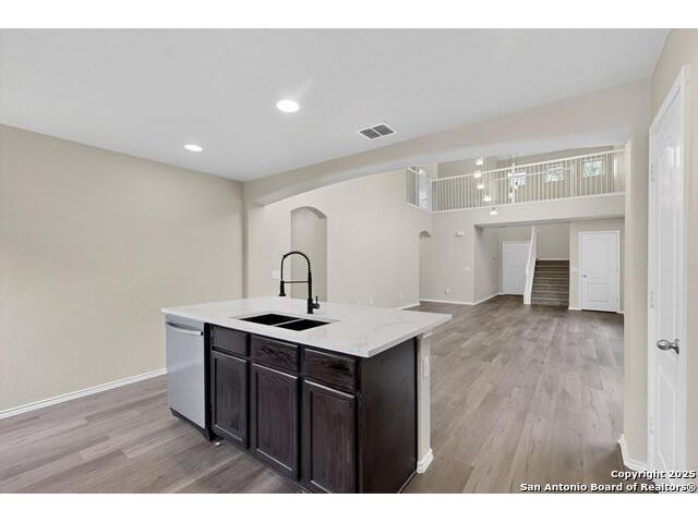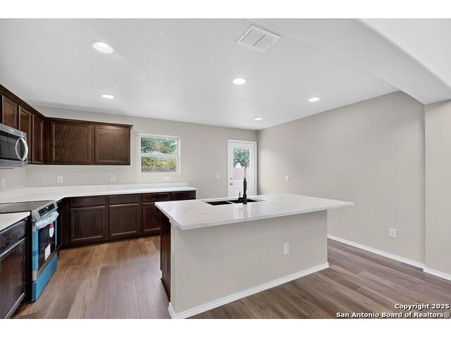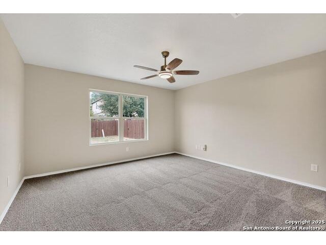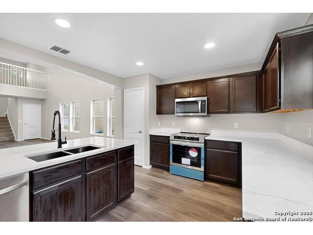 This stunning two-story home features 4 bedrooms, 2.5 bathrooms, and is completely move-in ready, offering the perfect combination of comfort and convenience. The thoughtfully designed layout includes a spacious primary suite on the main level, while the secondary bedrooms and a versatile loft are upstairs, providing plenty of room for everyone. The open floor plan is filled with natural light from large windows and boasts soaring ceilings, creating a bright and inviting atmosphere. The kitchen is a chef's dream, featuring a large island, quartz countertops, and stainless steel appliances-perfect for cooking and entertaining. Recent updates include new luxury vinyl plank and carpet, new light and plumbing fixtures, new door hardware, recent paint, and finished garage flooring. Step outside nice sized yard ideal for relaxing or hosting gatherings in the backyard with recently stained fence. Conveniently located near Joint Base San Antonio, Sea World, and an array of shopping and dining options, this home truly has it all. Don't miss your chance to see it!
