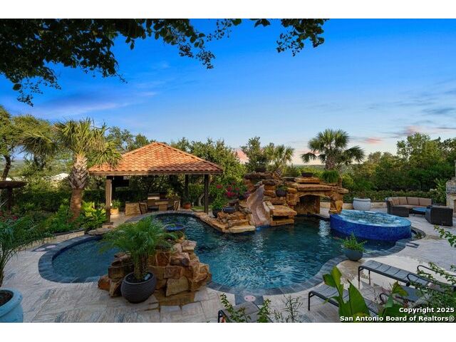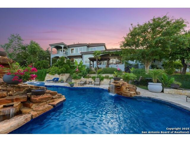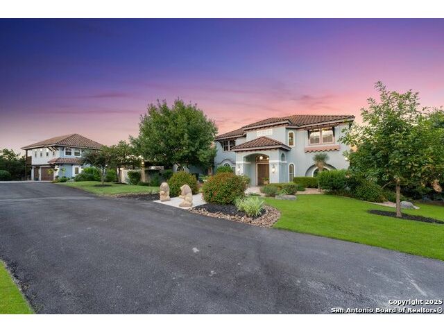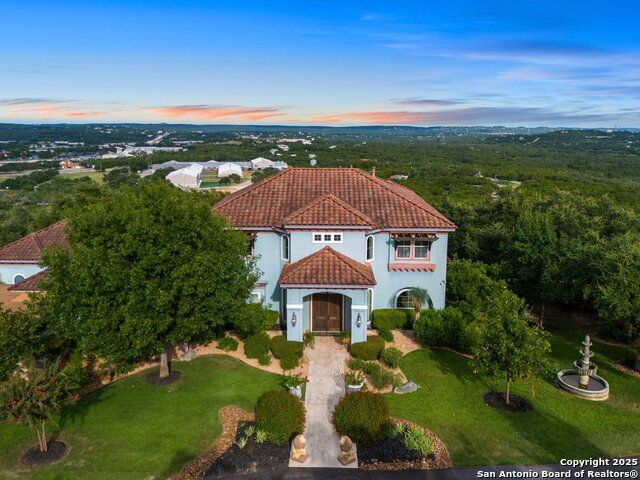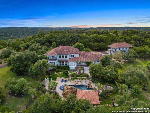 UNRESTRICTED 8.64 ACRES! NO HOA! PANORAMIC VIEWS! The ultimate Hill Country retreat, this private Mediterranean estate is nestled hilltop, in the highly coveted Bulverde, Texas. Boasting a luxurious blend of comfort, elegance and modern chic, this property is everything you've ever wanted in a home! As you travel up the private drive you are greeted with meticulously manicured grounds. As you step inside this exquisite estate, you'll be drawn to the stunning foyer showcasing the grandeur of the property. The open concept main floor features state-of-the-art finishes including a breathtaking chef's kitchen with an oversized island, stainless steel appliances, Bertazzoni Stove and double oven imported from Italy, built-in refrigerator, a wine fridge and a Bosch espresso station. The large living room is perfect for entertaining guests or relaxing with family, while the separate dining area is perfect for hosting dinner parties. The lavish primary suite is located on the main level and boasts a spacious walk-in closet, a spa-like en-suite bathroom with a deep soaker tub, double sinks and glass enclosed shower. Entertainment is made easy with a home theater and multiple living areas. One of the standout features of this property is the incredible outdoor living space complete with Keith Zars heated pool and spa with beach entry, waterfalls, slide, rock cove and VIEWS!! Separate living quarters about the 3-car detached garage offers 1 bedroom, 1 full bathroom, kitchenette, living room and walkout balcony. HORSES ALLOWED! This is truly a one-of-a-kind property! Your own private resort at home! Flexible use! Award winning Comal Schools! Smithson Valley High School! Convenient to Canyon Lake, restaurants, shopping and The San Antonio Airport. You do not want to miss this amazing opportunity!