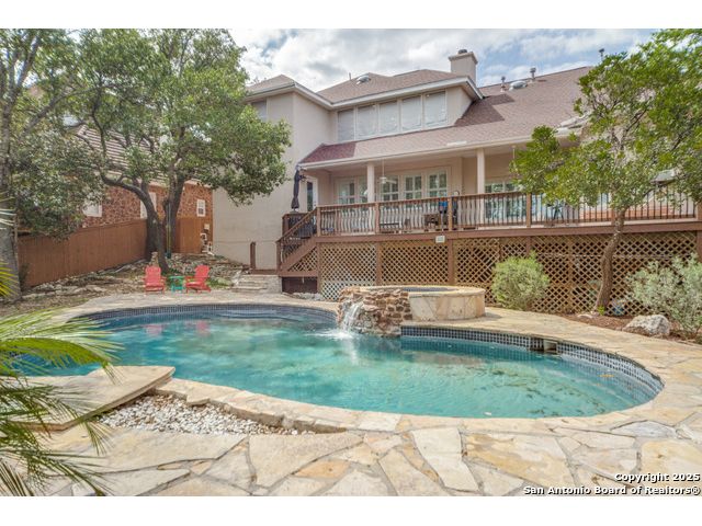 Welcome to this beautifully maintained custom home located in the premier subdivision GREYSTONE COUNTRY STATES, in the Stone Oak area. This home allows living in a guard-gated community with multimillion-dollar homes, and also enjoying walking distance to The Vineyard Shopping Center and easy access to Hwy 1604. This stunning residence offers modern upgrades and thoughtful features that make it truly one of a kind . Step inside to an open floor plan filled with abundant natural light and high ceilings, featuring Master Bedroom and guest bedroom with full remodeled bathroom on the main floor. This home features expansive living spaces, including home office, formal living and dining room for entertaining, and a fireside family room and a breakfast nook for your private enjoy. The oversized kitchen island, ample cabinetry, updated backsplash, built-in KitchenAid microwave and new extractor hood, make the kitchen both stylish and functional. Laundry room conveniently located in this main floor. Enjoy scratch-resistant, waterproof wood-look tile flooring throughout the main level and second floor common areas . Upstairs you will find an spacious game room that could serve as a 5th bedroom, and 2 bedrooms, featuring walking closets and their own private toilet and vanity, sharing remodeled shower area . Unique 200 sq ft bonus room accessed through one of the bedroom's closet, not included in the tax record square footage (SQF)-currently used as a home gym. In-ground pool with brand new high efficiency variable speed pump and extensive driveway with parking area for a 3rd car. Five chandeliers installed on the main floor and updated fans and light fixtures through out the house This home is truly a rare find, offering modern upgrades, comfort, and an unbeatable location all in one, ready to move in. Don't miss out-schedule your private tour today! washer and dryer machines are included.