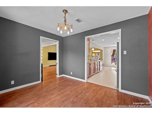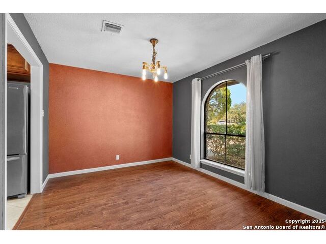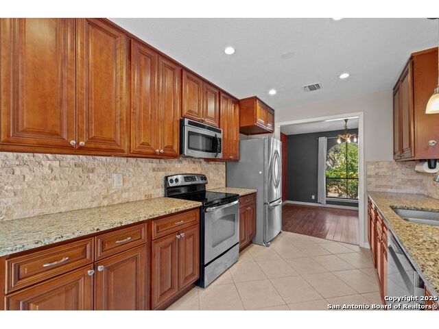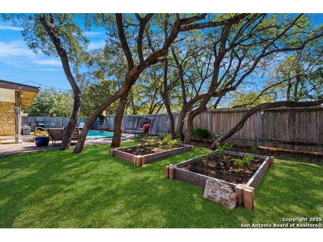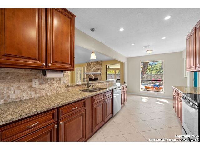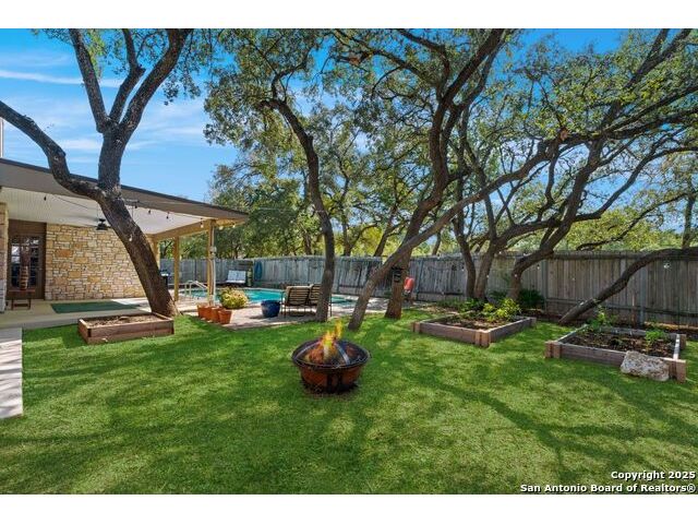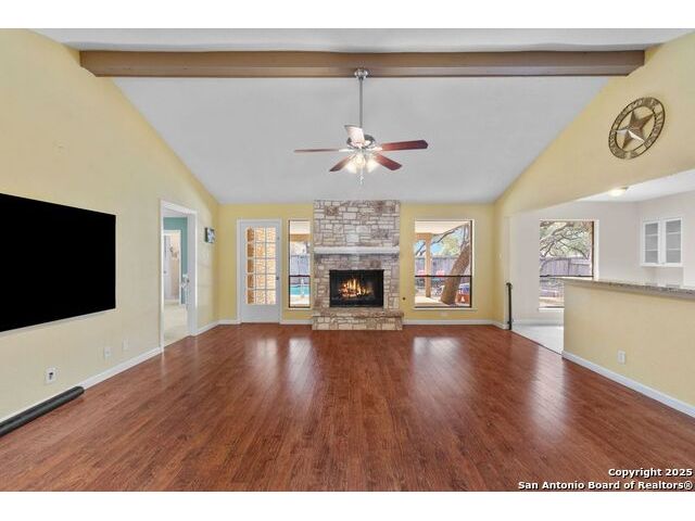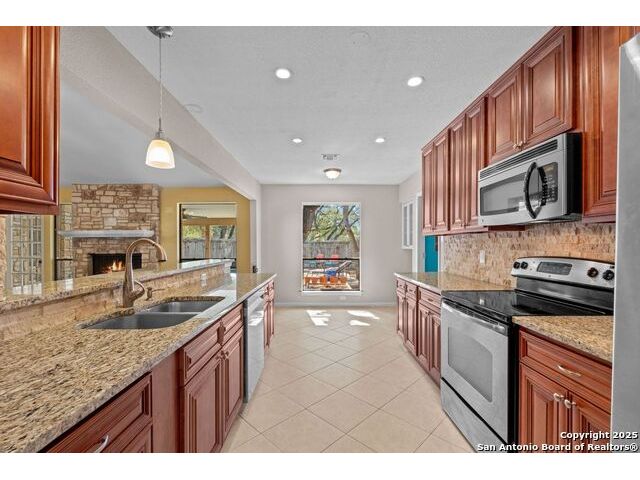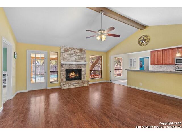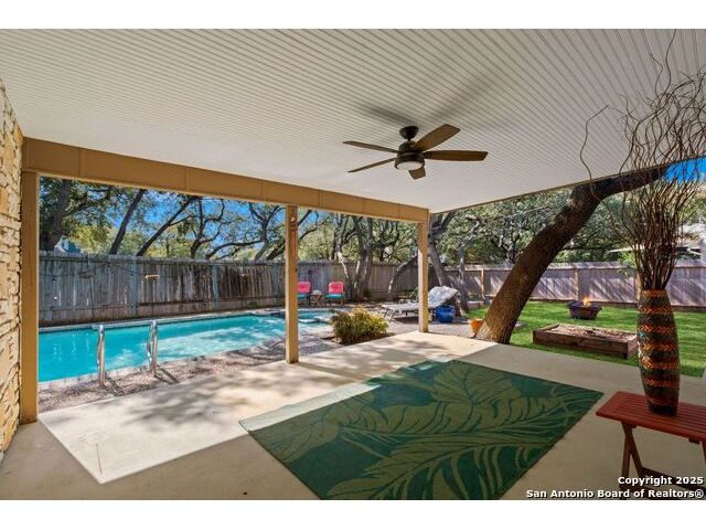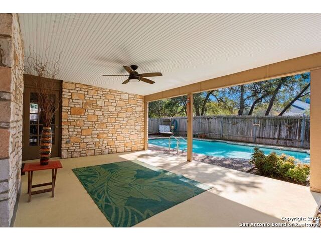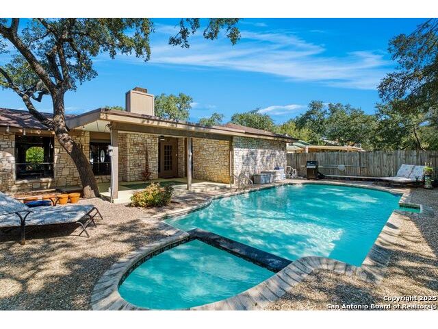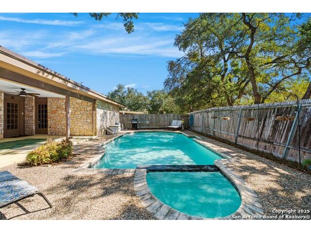 Welcome to this inviting 3-bedroom, 2-bathroom home tucked away in the desirable Woods of Shavano neighborhood. This single-story residence blends comfort and style with spacious living areas, and abundant natural light. The living and dining areas feature high ceilings and a cozy fireplace, creating a warm and welcoming atmosphere. The kitchen offers ample storage, a breakfast nook, and a view of the backyard. Many updates were made to the home such as wood flooring, stainless steel appliances, granite countertops, and others that are still timeless today. Step outside to a private backyard designed for relaxation - complete with a small pool perfect for cooling off on warm Texas days and a patio ideal for outdoor dining or entertaining. Nestled on a quiet, tree-lined street, this home offers easy access to top-rated schools, shopping, and dining, plus quick routes to major highways. Experience the charm, convenience, and comfort that make The Woods of Shavano one of San Antonio's most sought-after neighborhoods.