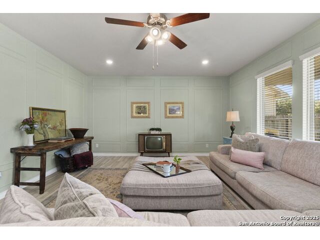 Welcome to this beautifully designed two-story home featuring 5 bedrooms, 4 full baths, and 2,767 sq ft of bright, modern living space. Built in 2020, this residence combines modern finishes with a thoughtful floor plan ideal for families and guests. The main level offers an inviting open-concept layout with a spacious living room, dining area, and a stylish kitchen boasting granite countertops, stainless-steel appliances, a large center island, and abundant cabinet space. A guest suite with a full bath on the first floor provides privacy and flexibility for visitors, multigenerational living, or a home office. Upstairs you'll find four generously sized bedrooms, including the luxurious primary suite with a spa-inspired bath, dual vanities, and a walk-in closet. A versatile game room or loft offers additional space for family activities or relaxation including a 2nd floor Juliet balcony. Outside, enjoy a covered patio and a private backyard, complete with a green space that's perfect for entertaining or unwinding at the end of the day. Situated in a friendly, amenity-rich community within top-rated Comal ISD, this home offers convenient access to schools, shopping, dining, and major commuter routes.