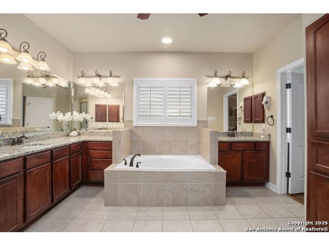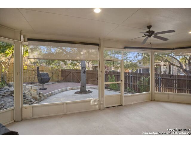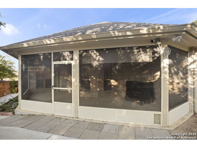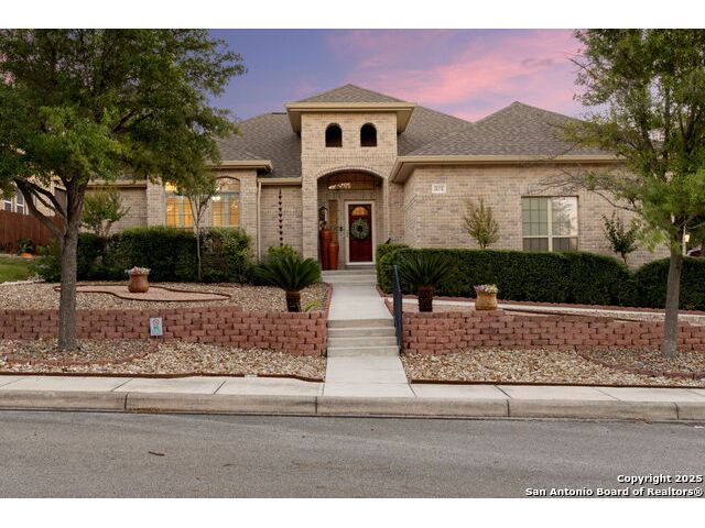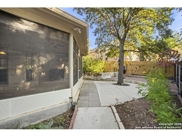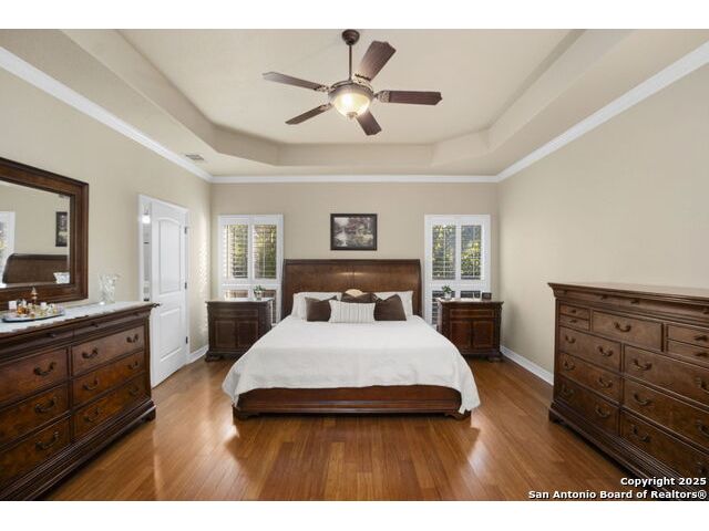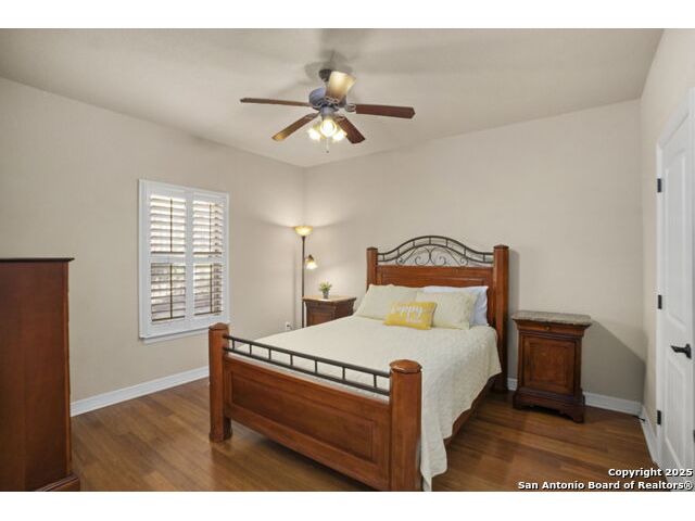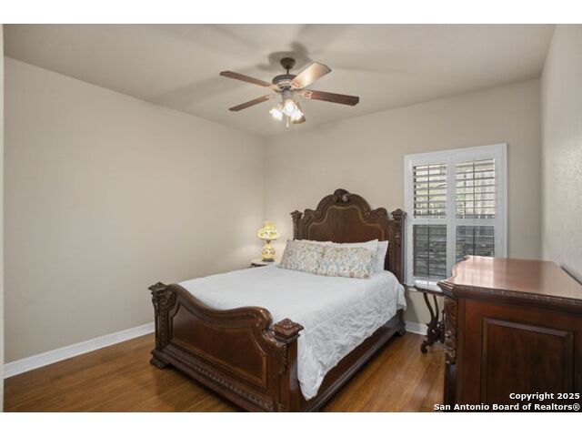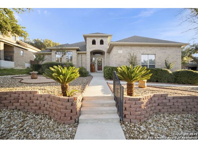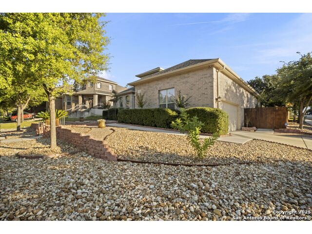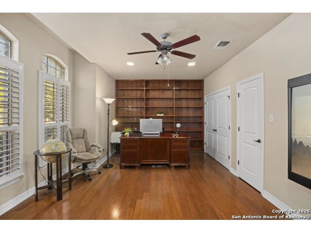 Welcome to 13058 Gordons Mott, a beautifully maintained one-story home showcasing true pride of ownership by its original owners. This thoughtfully designed residence offers 4 bedrooms and 3.5 bathrooms, with three bedrooms featuring ensuite baths-ideal for multigenerational living or hosting guests in comfort. Inside, elegant details abound including crown molding, plantation shutters throughout, bamboo hardwood flooring, and tile in all wet areas. The fourth bedroom functions perfectly as an office or library, complete with walls of custom shelving and two closets, offering great flexibility for your lifestyle. The open living spaces flow seamlessly to a screened-in back patio, creating an inviting spot for morning coffee or evening relaxation. The professionally xeriscaped yard-front and back- showcases Texas-friendly beauty with fruit trees, mountain laurels, crape myrtles, and drought-tolerant flowering shrubs. A rare find, the oversized garage features a custom-built mezzanine deck for additional storage or workshop space-an impressive, must-see feature. Every inch of this property reflects careful maintenance and pride, making it truly move-in ready.