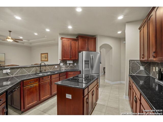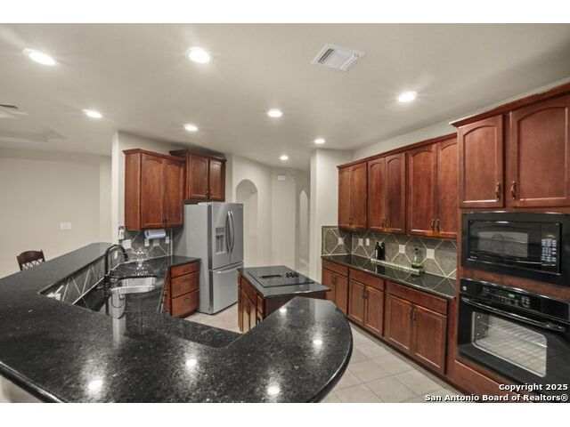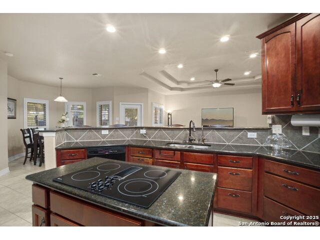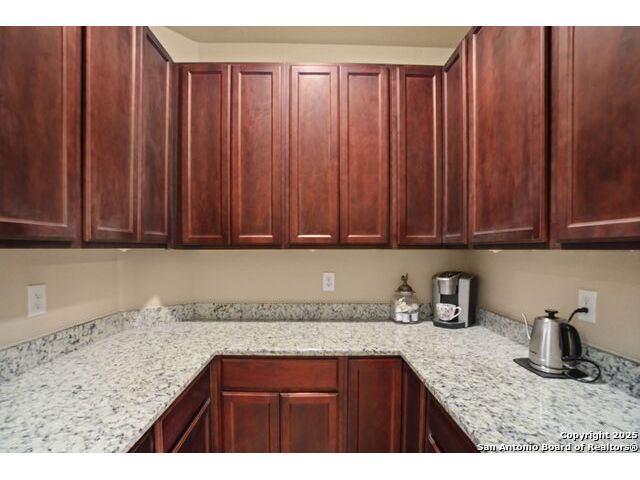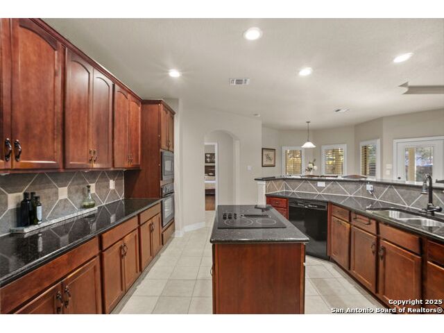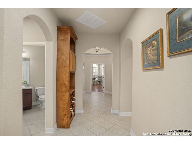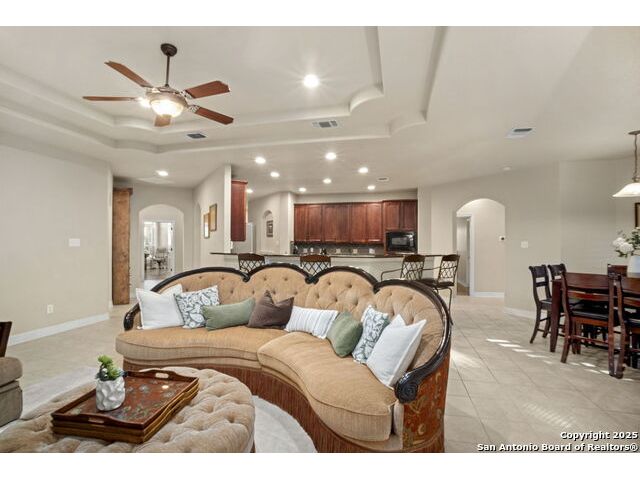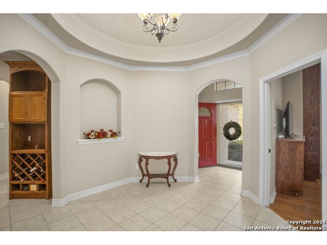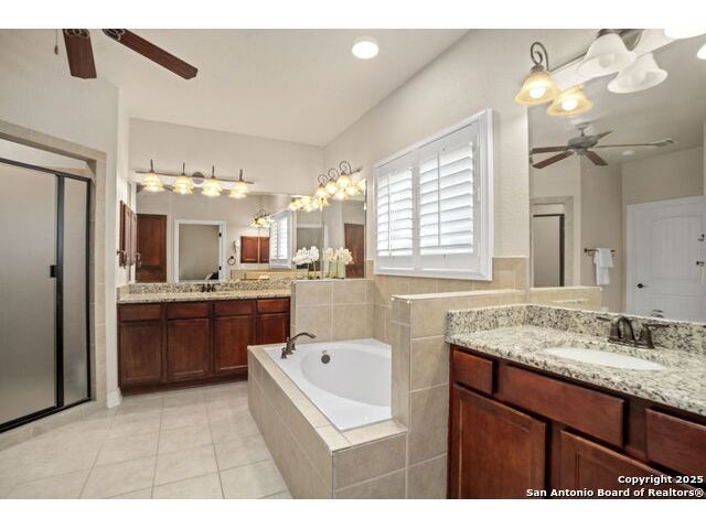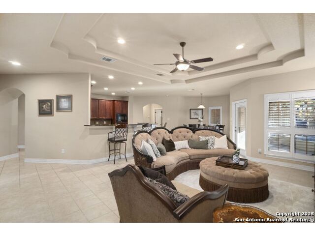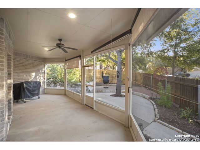 Welcome to 13058 Gordons Mott, a beautifully maintained one-story home showcasing true pride of ownership by its original owners. This thoughtfully designed residence offers 4 bedrooms and 3.5 bathrooms, with three bedrooms featuring ensuite baths-ideal for multigenerational living or hosting guests in comfort. Inside, elegant details abound including crown molding, plantation shutters throughout, bamboo hardwood flooring, and tile in all wet areas. The fourth bedroom functions perfectly as an office or library, complete with walls of custom shelving and two closets, offering great flexibility for your lifestyle. The open living spaces flow seamlessly to a screened-in back patio, creating an inviting spot for morning coffee or evening relaxation. The professionally xeriscaped yard-front and back- showcases Texas-friendly beauty with fruit trees, mountain laurels, crape myrtles, and drought-tolerant flowering shrubs. A rare find, the oversized garage features a custom-built mezzanine deck for additional storage or workshop space-an impressive, must-see feature. Every inch of this property reflects careful maintenance and pride, making it truly move-in ready.