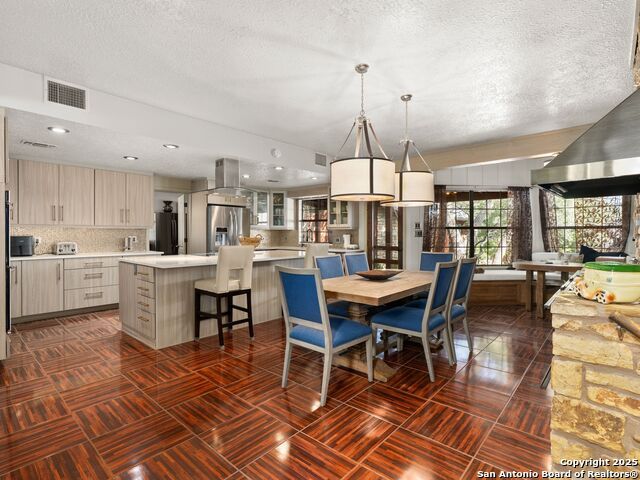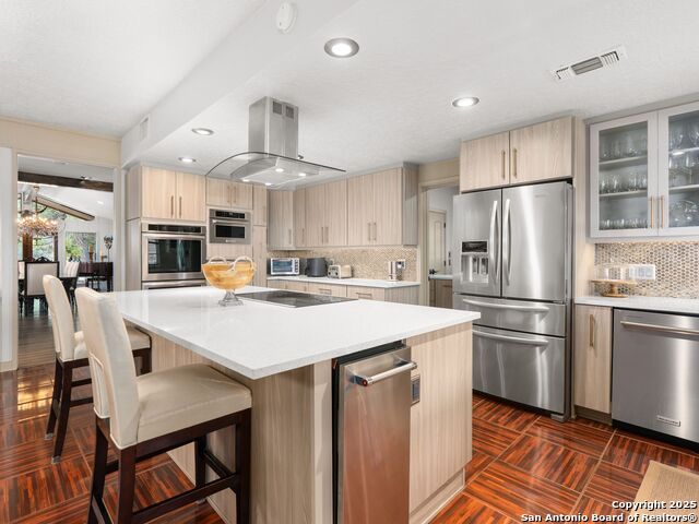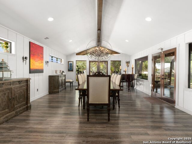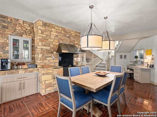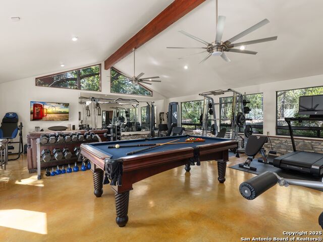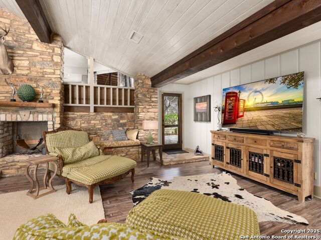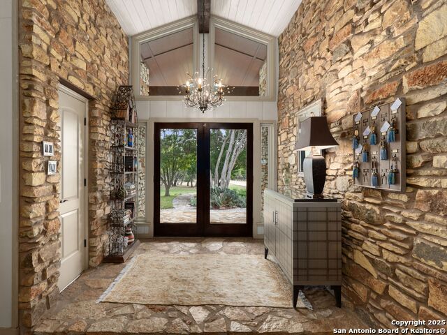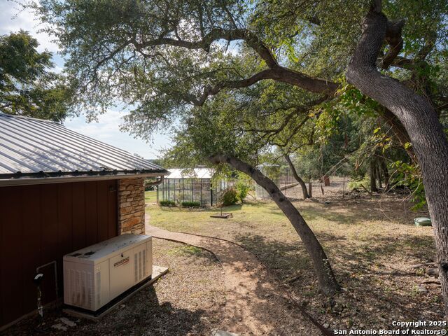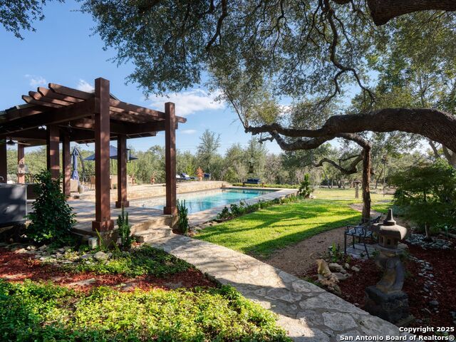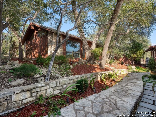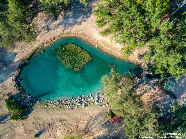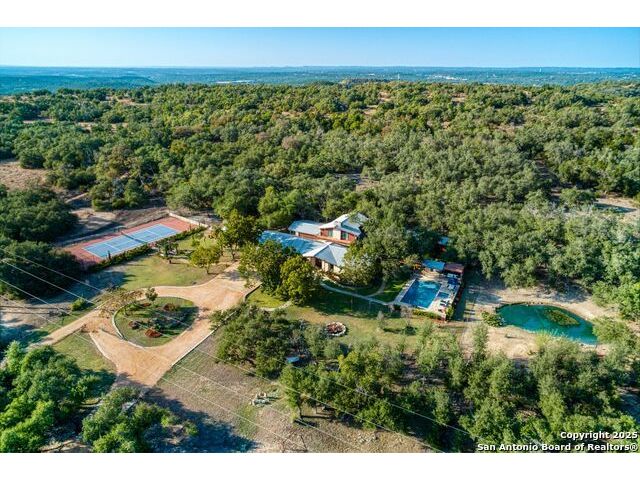Set high along the ridge of the Devil's Backbone, this 31-acre Hill Country estate spans two lots and blends resort-style amenities with timeless stone architecture and thoughtful updates throughout. A private, tree-lined drive leads to the 5,043 sq ft main residence and 1,650 sq ft guest house, totaling 6693 living space, and together offering 6-7 bedrooms, ideal for hosting amazing gatherings of any size. Inside, the main home features vaulted/beamed ceilings, stone walls, and multiple fireplaces that create warmth and ambiance throughout. The chef's kitchen includes dual dishwashers, ovens, and refrigerators, a grand stone fireplace, and a dining area large enough for large gatherings. The spacious primary suite serves as a true retreat with its own fireplace and serene Hill Country views. Outdoors, enjoy a 40'x20' pool with spa, covered outdoor kitchen with lounge, and multiple terraces designed for entertaining. A mile-long walking trail encircles the property and leads to a natural five-room cave recorded with the Texas Spelunking Society. Additional amenities include a tennis court, pond with waterfall, greenhouse, aviary, and a 40x40 barn easily convertible to horse stalls. Recent updates include a full-house generator, new well pump, septic, and sprinkler systems. An adjoining 11 acres is available for purchase, offering the opportunity to expand this exceptional estate into a 42-acre Hill Country retreat.