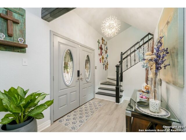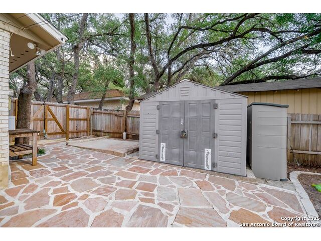 This beautifully updated two-story home is set on a generous 0.31-acre lot in the highly sought-after Castle Hills community. Offering 4 bedrooms and 2.5 baths, this residence blends classic character with thoughtful modern updates throughout. The kitchen has been refreshed with newly painted cabinets and hardware, a new quartz countertop, new sink, stylish backsplash, and an upscale 6-burner gas stove. Walls were opened to create a more open-concept flow between the kitchen and living spaces, perfect for everyday living and entertaining. The main level features luxury vinyl plank flooring, fresh interior paint, updated lighting throughout, and plantation shutters that add timeless charm. The spacious living area centers around an updated fireplace, while the converted garage now serves as a versatile game room or secondary living area. Both the dining room and game room feature beautiful beamed ceilings that enhance the home's warmth and character. The primary bedroom is conveniently located on the first floor, offering privacy and comfort. Upstairs retains its original wood flooring, maintaining a touch of the home's traditional appeal. Outside, the property showcases a beautiful and spacious backyard surrounded by a wooden fence, featuring mature trees, a flagstone patio for entertaining, and multiple seating areas for relaxation. A 10x10 plastic storage shed adds practicality, while the fence was recently replaced approximately 3 years ago. Additional highlights include a new HVAC system installed 6 months ago, plumbing for a water softener, and a 3-year-old roof. Nestled in one of San Antonio's most established neighborhoods, this home combines a prime location, spacious lot, and a wealth of recent upgrades.