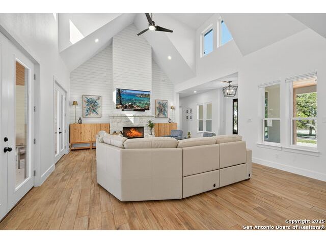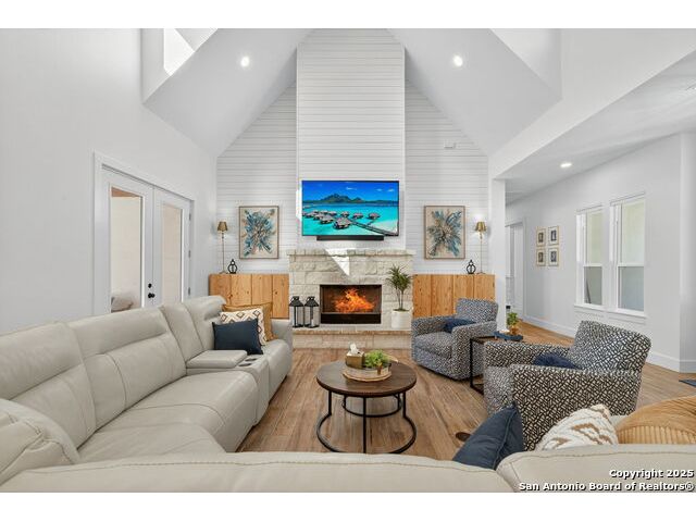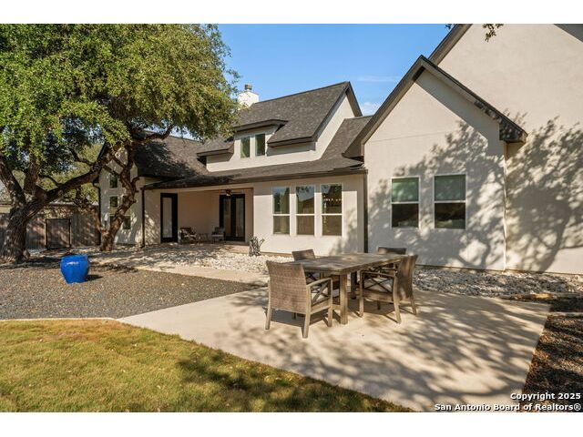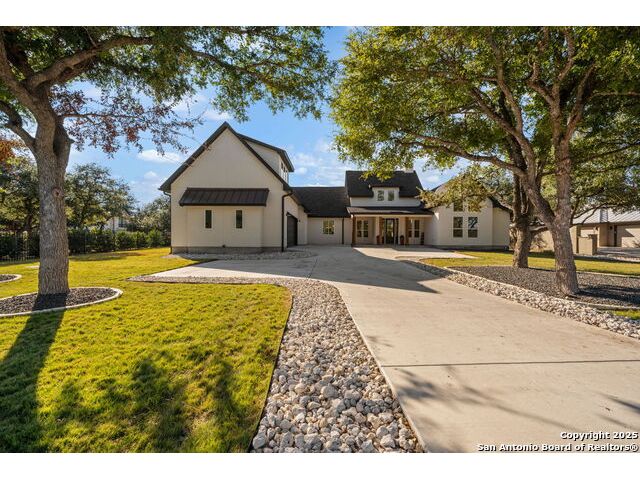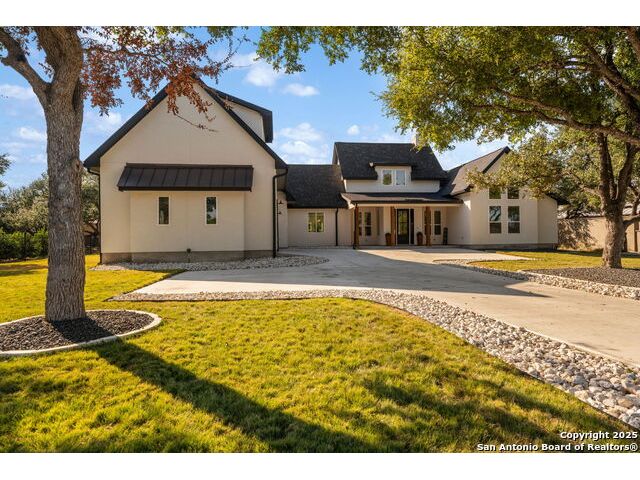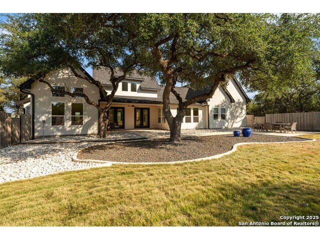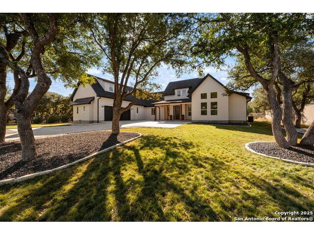 Tucked away in a coveted area of Spring Branch, this stunning Texas Hill Country farmhouse offers a blend of classic charm and modern convenience. 4 bedrooms and 3 full baths are thoughtfully laid out, with all bedrooms on the main floor and an expansive game room and additional flex space upstairs, perfect for work and play. With soaring ceilings and an abundance of natural light, this home feels open and airy throughout. A spacious kitchen is the heart of the home, featuring an elegant gas range and oversized island that flows seamlessly into the window-filled family room, complete with a central stone fireplace. The primary suite offers a peaceful retreat, highlighted by a large shower and stylish, free-standing soaking tub. Step outside to the covered back patio, overlooking a tastefully landscaped one-acre lot with low-maintenance zoysia sod, backing to serene private ranch land. An oversized garage with additional workshop space is perfect for hobbies or storage, while a convenient dog bathing station in the utility room adds a practical touch. Don't miss the multiple spaces that can easily be dedicated to a home office, including a spacious downstairs desk nook, the flex space upstairs, or even bedroom #4, if preferred. Enjoy access to incredible amenities including a gated 15.5-acre property owners park with a pool, pavilion, sports facilities, and scenic walking paths along Spring Creek. Located within popular Comal ISD, this home offers a peaceful retreat with easy access to Hwy. 281 and a relaxed Hill Country lifestyle. Immaculately maintained and ready for new owners-come see it today! (*Note-Property extends beyond back fence line)