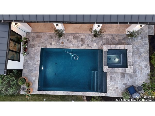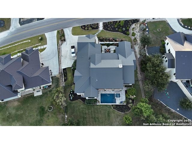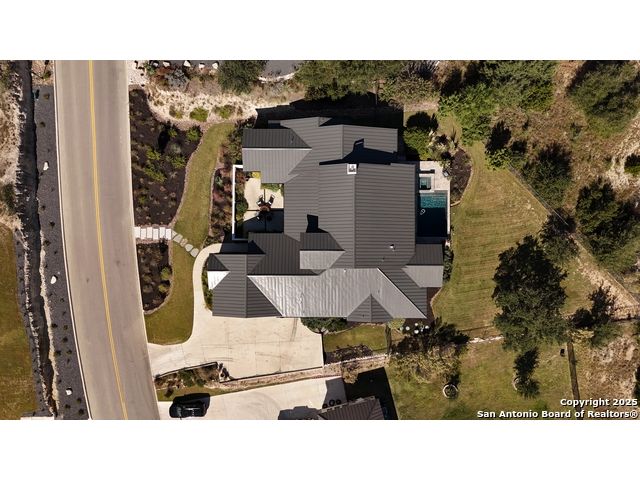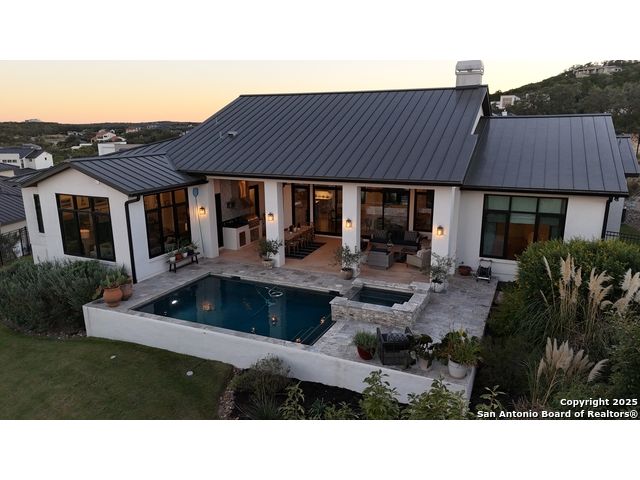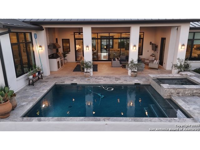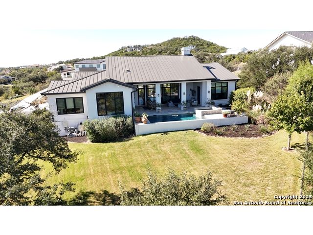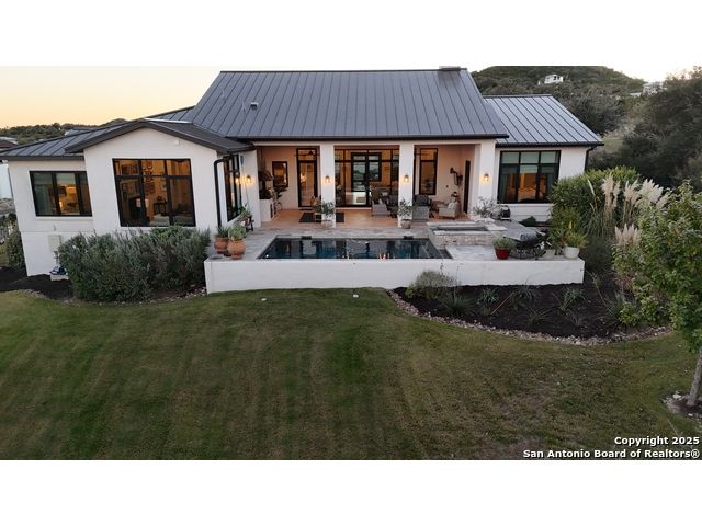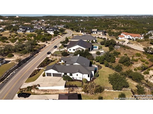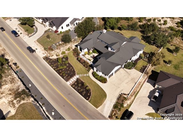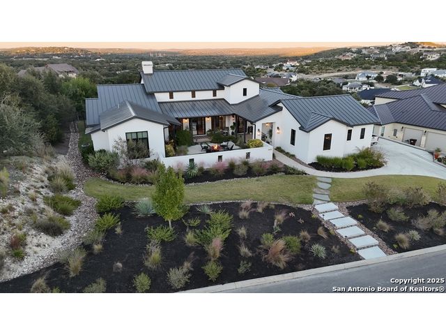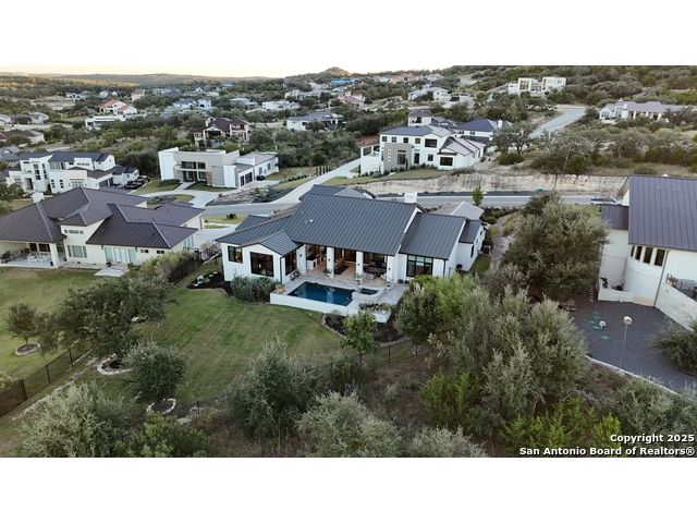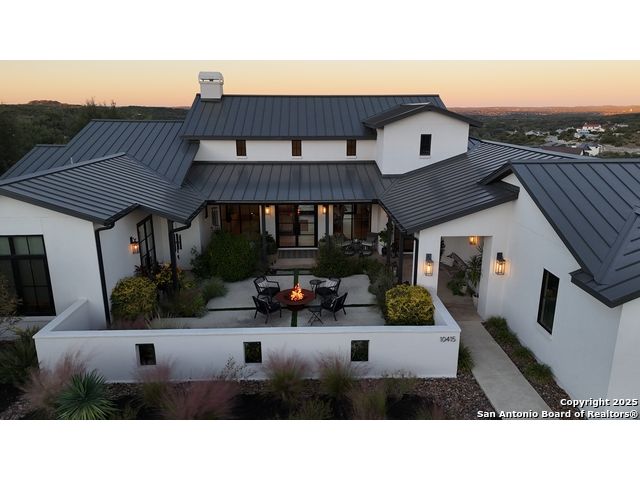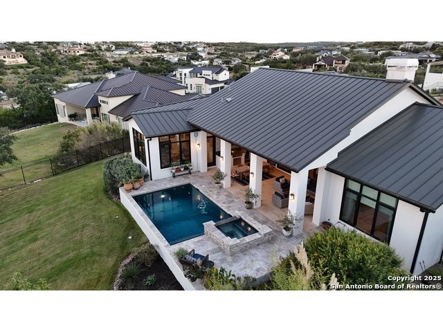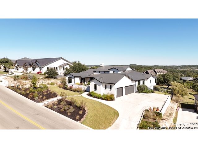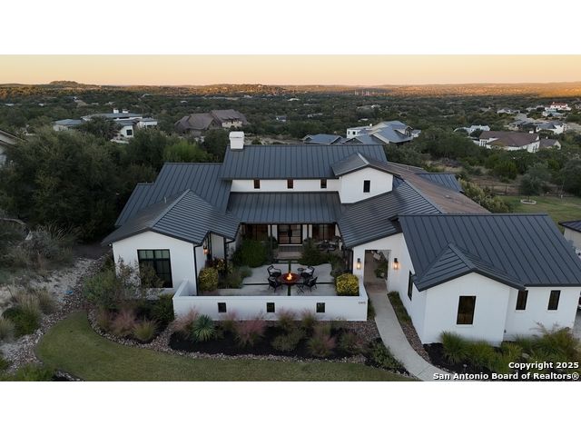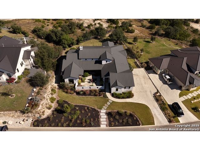 Nestled in the breathtaking Texas Hill Country, this stunning 3,716 sq ft custom home at 10415 Kendall Canyon offers unparalleled luxury, privacy, and PANORAMIC ENDLESS VIEWS that stretch across rolling hills and vibrant sunsets. Perfectly designed for indoor-outdoor living, this 4-bed, 4.5-bath masterpiece blends modern elegance with rustic charm! Step through one of four custom iron doors into a grand entrance framed by a serene front courtyard with a gas fire pit - ideal for evening gatherings under the stars. The open-concept living space soars with 17 foot ceilings and custom wood beams, white oak wood floors, and 8-inch baseboards throughout, creating a warm yet sophisticated ambiance. At the heart of the home, a remote controlled gas fireplace anchors the expansive living room, seamlessly connected to the outdoors via a massive 16-ft bifold slider that floods the space with natural light and opens to resort-style entertaining. The gourmet kitchen is a chef's dream, featuring Jenn Air appliances which include a 48" commercial refrigerator, 48" 6-burner gas range with griddle, double ovens and a one of a kind vent hood. Seamless flow extends to the outdoor kitchen and sparkling pool with spa, where you can host unforgettable poolside dinners while soaking in the infinite Hill Country vistas.