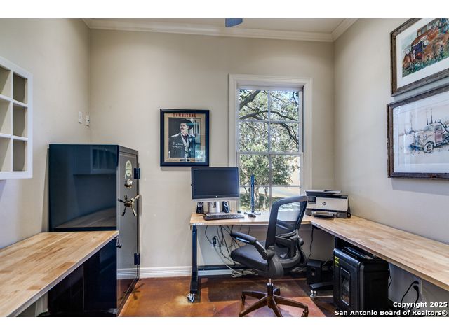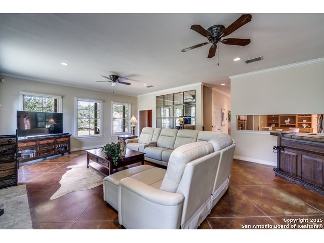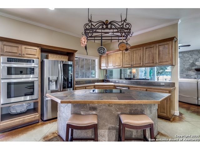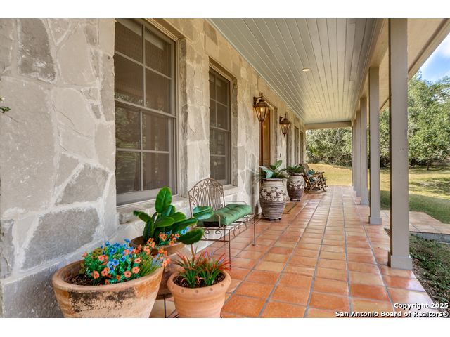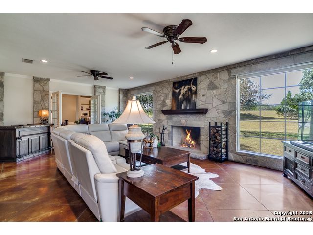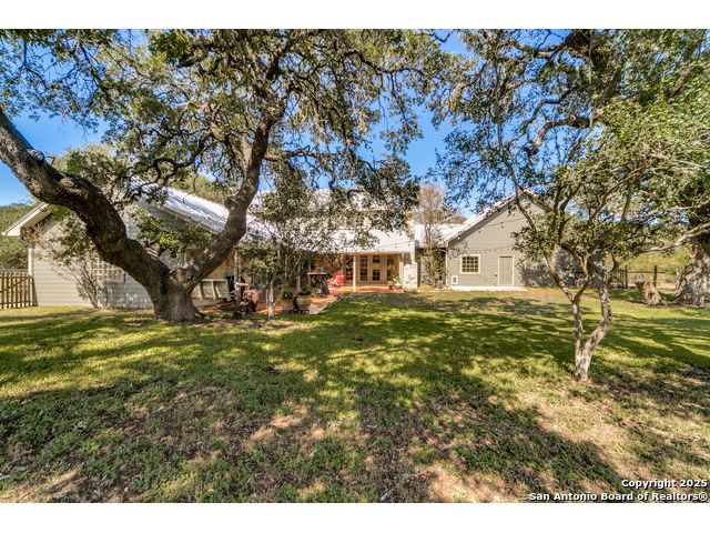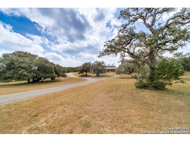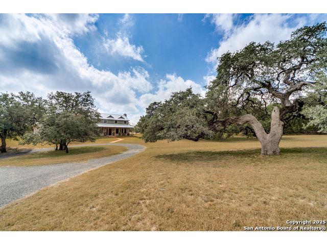 Serenity, comfort, fresh air, seclusion- all surrounded by multiple century oaks. Elegance and comfortable living combine. No detail left undone! Gathering areas abound from the stately stone fireplace in the living room to the large dining room to the outside covered patio with the 2nd fireplace. Incredible primary bedroom on first floor with exterior access, large secondary bedroom up, polished concrete floors in main living areas, pecan cabinets, double oven, stainless refrigerator. Oversized barn/ shop has electricity, water and car lift. Perfect for 4H projects, auto repair and many hobbies and/ or can be used for horses with interior tack room. Exterior is beautiful rolling acres with large century Oaks. A true country paradise.