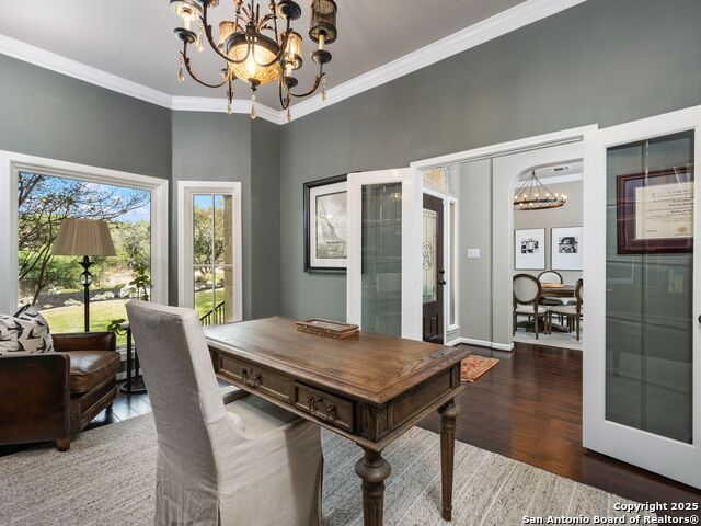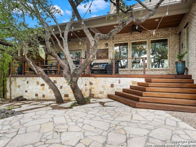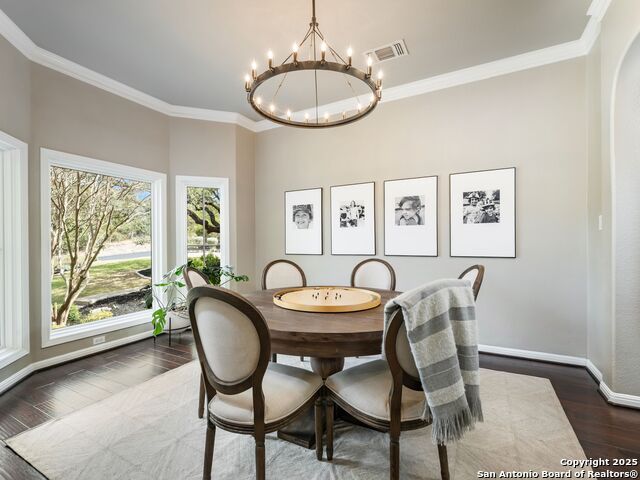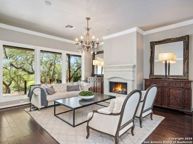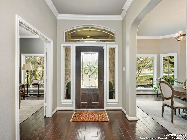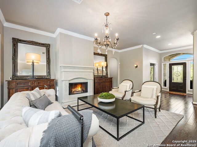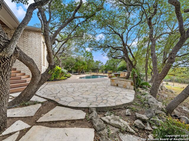 Immaculately crafted, this estate in Fossil Ridge offers a seamless, thoughtfully designed layout that balances luxury with everyday comfort. Refined appointments are immediately evident throughout, including rich hardwood floors, upgraded designer lighting, ample windows throughout providing abundant natural light, decor paint, crown molding, and a gourmet kitchen equipped with professional-grade stainless steel appliances, gas cooking, and bar stool seating. The kitchen opens to an inviting family room centered around a stone fireplace, framed by picture windows capturing calming views of the private outdoor retreat. The primary suite serves as a true sanctuary, featuring a newly redesigned spa-inspired bath with elevated finishes and a serene atmosphere. Three additional guest bedrooms and an oversized game room await upstairs, allowing both privacy and connection across the home. A side-entry three-car garage enhances both convenience and the home's curb appeal. Outdoors, the residence embraces resort-style living with effortless indoor-outdoor flow. A premier pool and spa anchor the backyard, complemented by a spacious covered patio with a stacked brick fireplace and expansive, true park-like property setting that rests against a greenbelt backdrop. With its tranquil bluff views and exceptional livability, this home offers an atmosphere of ease, relaxation, and refined comfort.