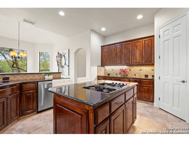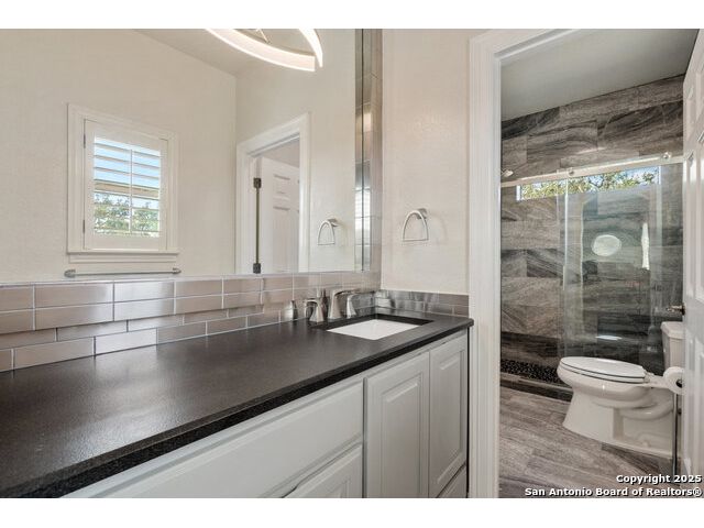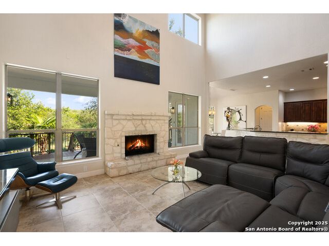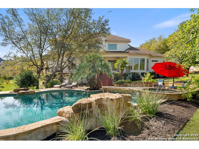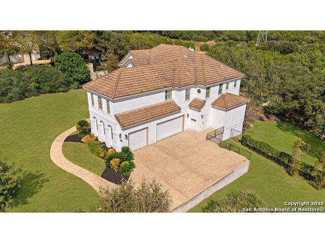 First time on the market! This stunning Mediterranean-Tuscan inspired home in Tuscany Hills is set on a .74-acre wooded greenbelt lot, offering beauty, privacy, and resort-style living. Thoughtfully designed by the original owner, the home spans 4,434 sq. ft. with 5 bedrooms, 4 full baths, and a powder bath. Inside, discover ultra-high ceilings, expansive picture windows, and transitional styling that blends warmth with modern elegance. The floor plan features a secondary bedroom and full bath downstairs, with a spacious game room and flex space upstairs-perfect for today's lifestyle. Step through the impressive custom metal and frosted glass entry door into open, light-filled living spaces that flow seamlessly to the outdoors. The backyard is a true retreat with a Keith Zars pool and spa featuring beach entry and water features, surrounded by lush landscaping, an expansive covered patio, and elevated deck-ideal for entertaining or quiet relaxation. Additional highlights include a three-car garage, generous storage, and a premier location in one of North San Antonio's most desirable gated communities.