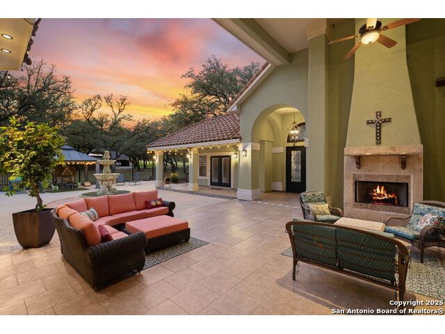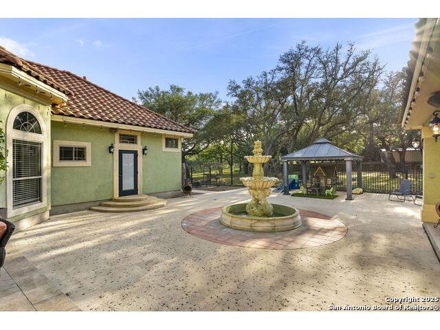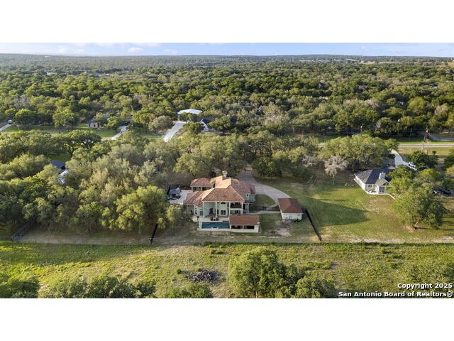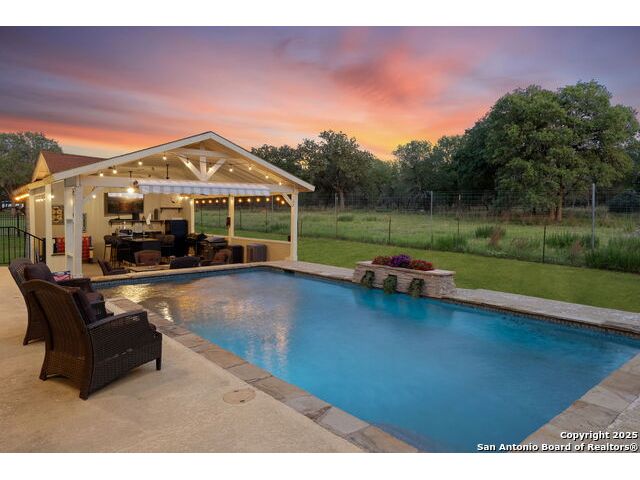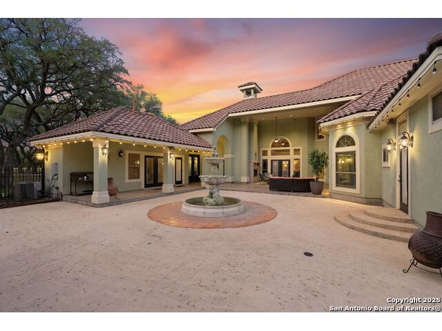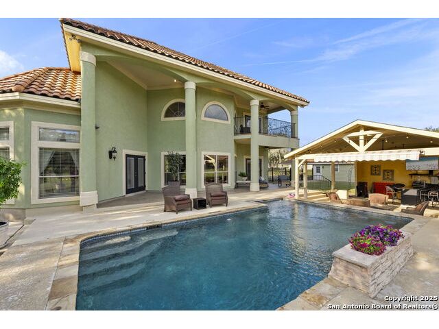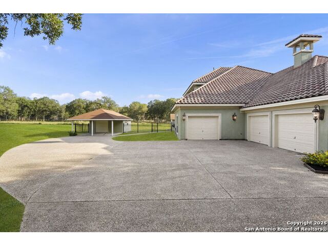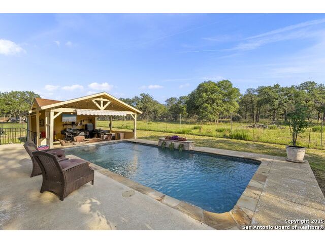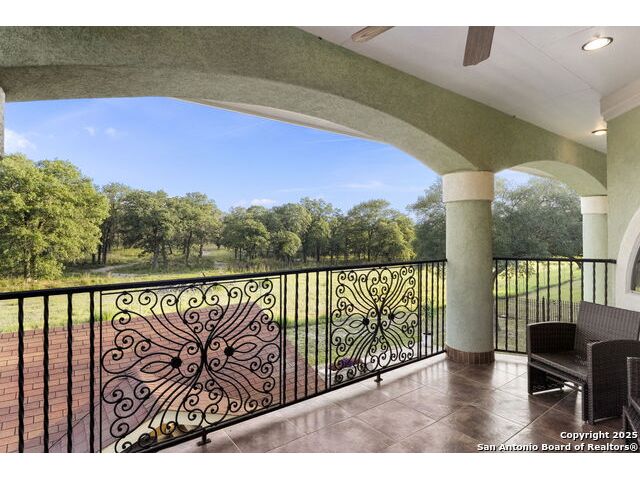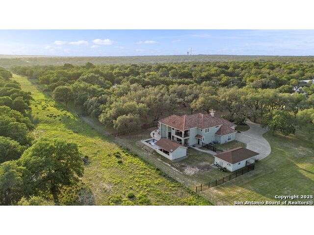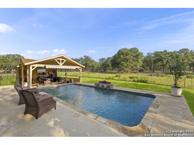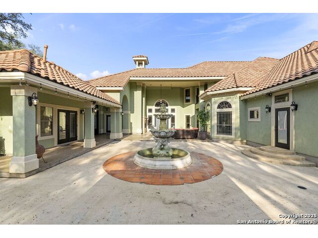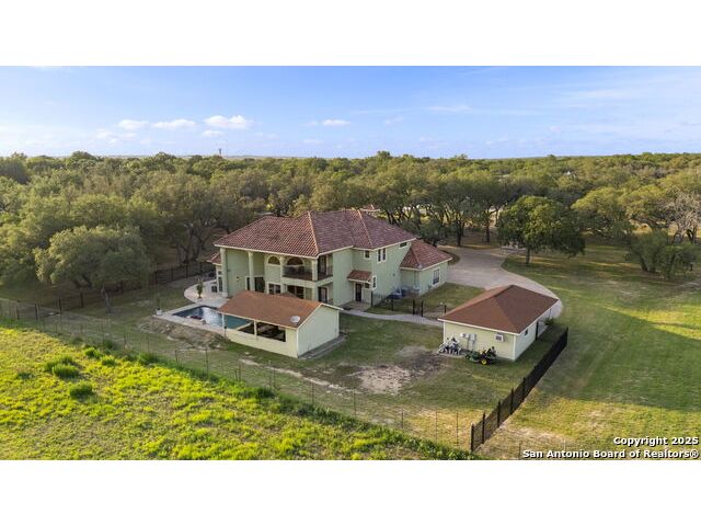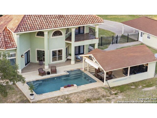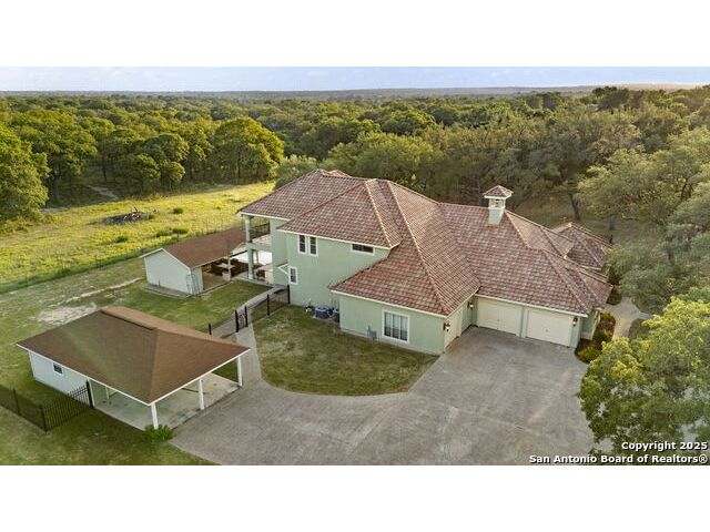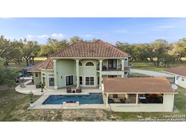 This stunning custom-designed estate offers 3 bedrooms, 2.5 baths, an attached 3-car garage, and 3,899 square feet of refined living space on 2.44 acres in the heart of La Vernia. Beautifully blending timeless elegance with Hill Country charm. From the moment you arrive, you'll be captivated by the home's exquisite craftsmanship and architectural details, including soaring 23-foot ceilings, Travertine tile, rich wood floors, and graceful arched entries. The open-concept layout features two spacious living areas and a formal dining room with French doors that open to a serene courtyard complete with a cozy fireplace and tranquil water fountain. A dedicated study with French doors provides the ideal space for a home office or can easily serve as a fourth bedroom. The spacious kitchen is a chef's dream, offering a large granite-topped center island perfect for casual dining or meal prep, barstool seating, and custom white cabinetry with ornate detailing. Warm stone tile flooring and backsplash, high-end stainless steel appliances-including a professional-grade gas range and double ovens-complement the elegant pendant lighting over the island and charming chandelier in the dining area. The seamless connection to the living room makes this the perfect home for both everyday comfort and entertaining. Retreat to the spa-like primary suite, where luxury meets tranquility. The beautifully designed bathroom showcases a dual-entry stone walk-in shower with dual shower heads, a raised whirlpool tub framed by tall windows and a decorative chandelier, and dual custom wood vanities with granite countertops and intricate detailing. Private outdoor access and an oversized walk-in closet complete this peaceful owner's retreat. Upstairs, both secondary bedrooms share a balcony overlooking the picturesque courtyard. One includes a cozy sitting area for added comfort and versatility. Step outside to your personal oasis-featuring a sparkling saltwater pool, expansive covered patio with a fully equipped outdoor kitchen, and a detached 1-bedroom, 1-bath casita with a walk-in closet-ideal for multigenerational living or guest accommodations. The fully fenced backyard, enclosed with wrought iron and high wire fencing, offers privacy and room to roam among mature trees and open skies. Additional highlights include an extra 1.5-car garage with carport, a circular driveway with ample parking, elegant iron stair railings, and upper clerestory windows that fill the formal areas with natural light. Located in a peaceful, upscale neighborhood with no HOA, this extraordinary home offers the perfect blend of custom luxury, functionality, and serene country living-just minutes from top-rated La Vernia schools, shopping, and dining.
