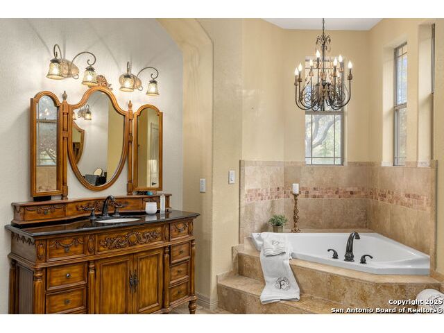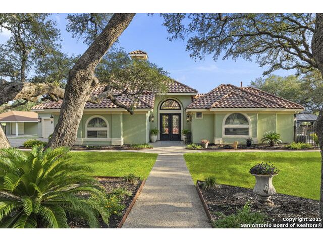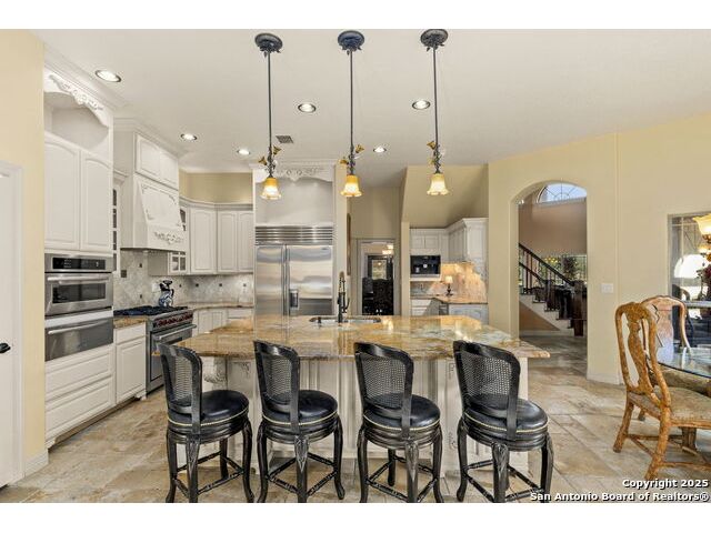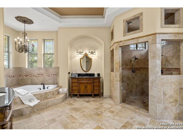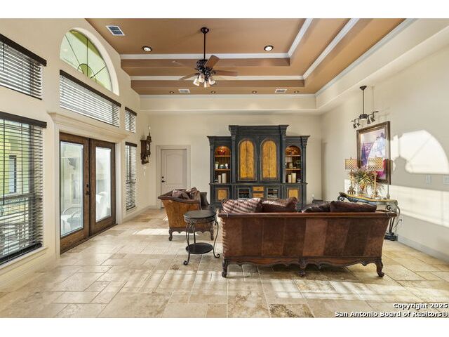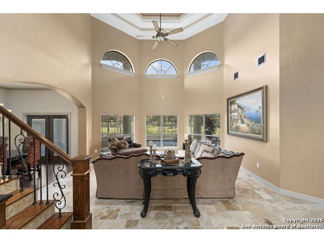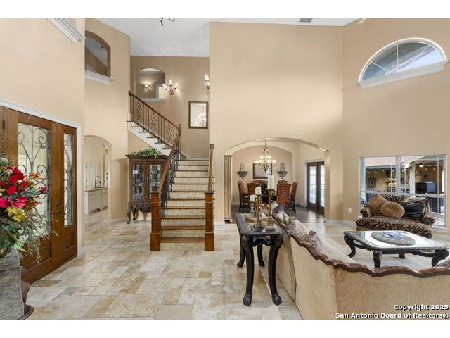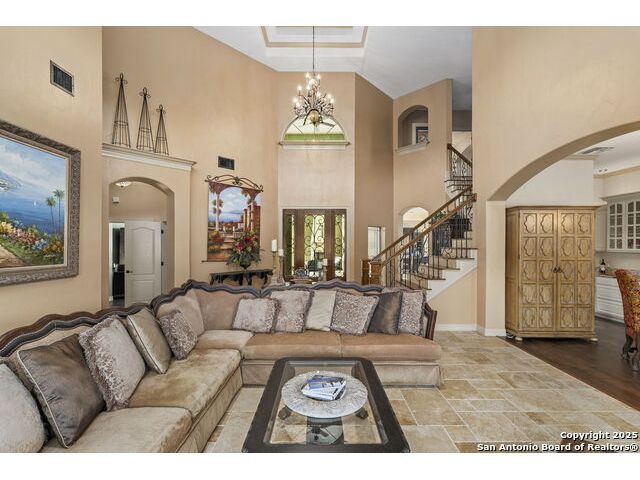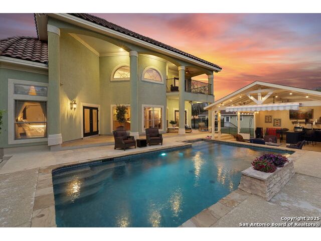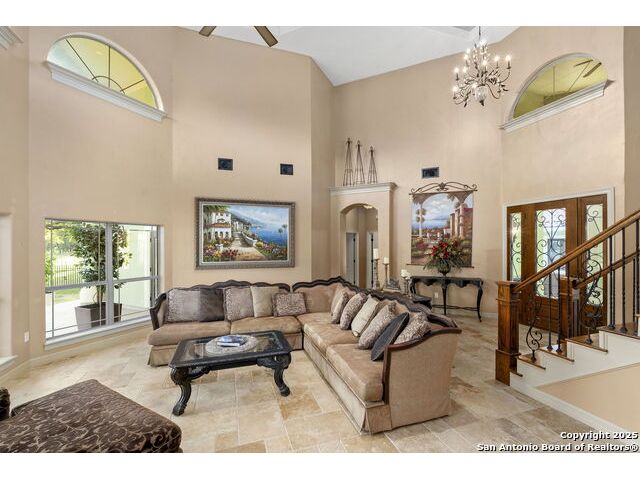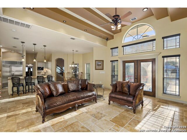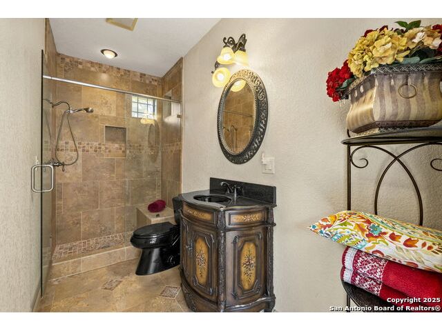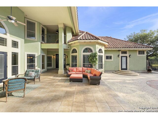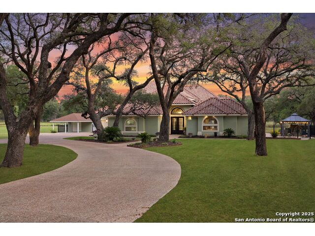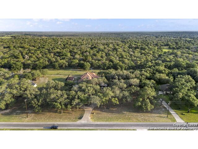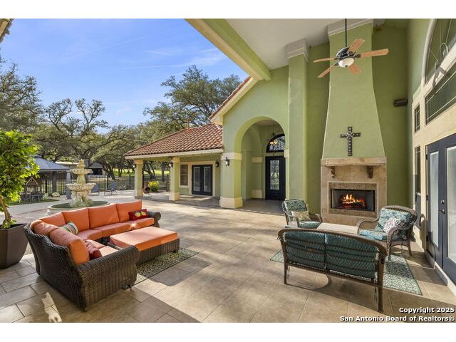 This stunning custom-designed estate offers 3 bedrooms, 2.5 baths, an attached 3-car garage, and 3,899 square feet of refined living space on 2.44 acres in the heart of La Vernia. Beautifully blending timeless elegance with Hill Country charm. From the moment you arrive, you'll be captivated by the home's exquisite craftsmanship and architectural details, including soaring 23-foot ceilings, Travertine tile, rich wood floors, and graceful arched entries. The open-concept layout features two spacious living areas and a formal dining room with French doors that open to a serene courtyard complete with a cozy fireplace and tranquil water fountain. A dedicated study with French doors provides the ideal space for a home office or can easily serve as a fourth bedroom. The spacious kitchen is a chef's dream, offering a large granite-topped center island perfect for casual dining or meal prep, barstool seating, and custom white cabinetry with ornate detailing. Warm stone tile flooring and backsplash, high-end stainless steel appliances-including a professional-grade gas range and double ovens-complement the elegant pendant lighting over the island and charming chandelier in the dining area. The seamless connection to the living room makes this the perfect home for both everyday comfort and entertaining. Retreat to the spa-like primary suite, where luxury meets tranquility. The beautifully designed bathroom showcases a dual-entry stone walk-in shower with dual shower heads, a raised whirlpool tub framed by tall windows and a decorative chandelier, and dual custom wood vanities with granite countertops and intricate detailing. Private outdoor access and an oversized walk-in closet complete this peaceful owner's retreat. Upstairs, both secondary bedrooms share a balcony overlooking the picturesque courtyard. One includes a cozy sitting area for added comfort and versatility. Step outside to your personal oasis-featuring a sparkling saltwater pool, expansive covered patio with a fully equipped outdoor kitchen, and a detached 1-bedroom, 1-bath casita with a walk-in closet-ideal for multigenerational living or guest accommodations. The fully fenced backyard, enclosed with wrought iron and high wire fencing, offers privacy and room to roam among mature trees and open skies. Additional highlights include an extra 1.5-car garage with carport, a circular driveway with ample parking, elegant iron stair railings, and upper clerestory windows that fill the formal areas with natural light. Located in a peaceful, upscale neighborhood with no HOA, this extraordinary home offers the perfect blend of custom luxury, functionality, and serene country living-just minutes from top-rated La Vernia schools, shopping, and dining.