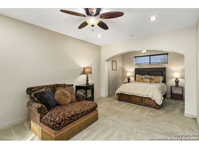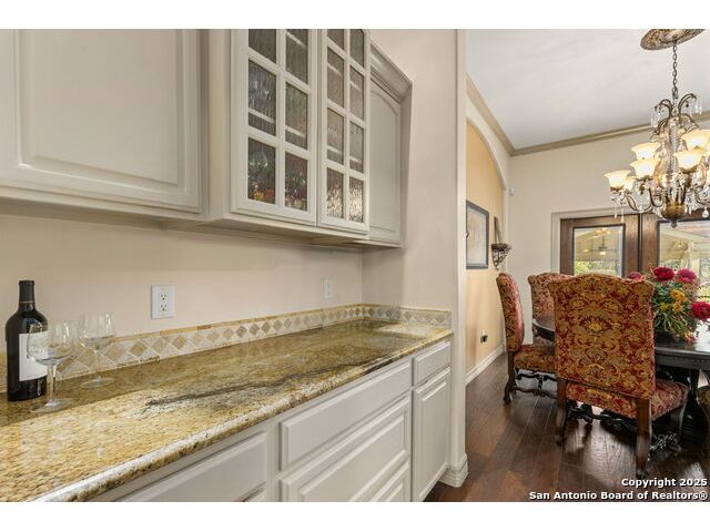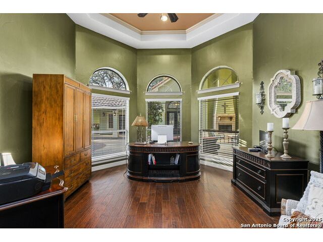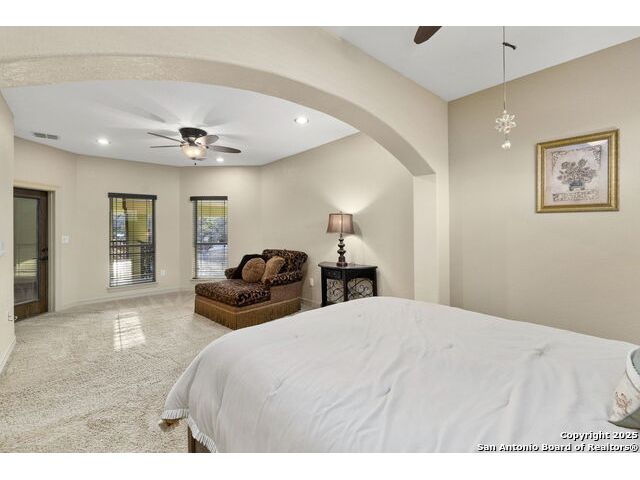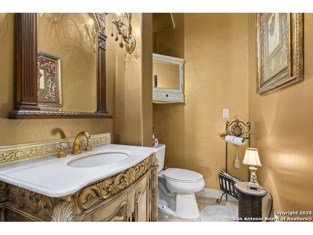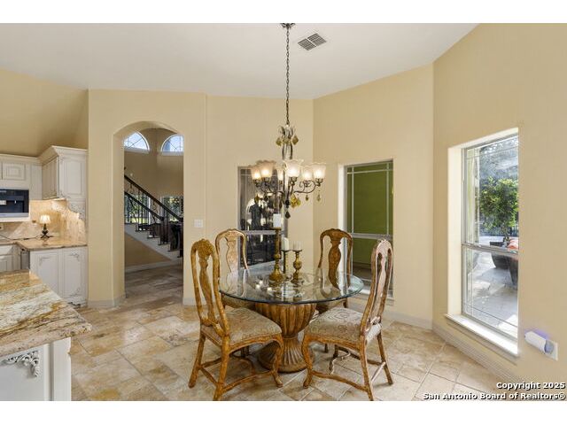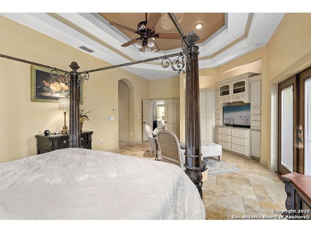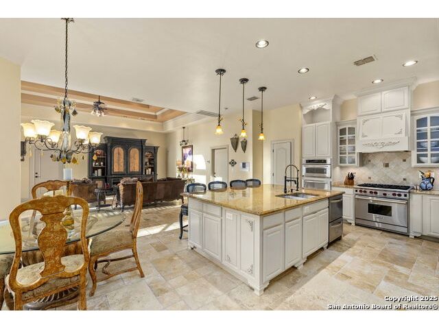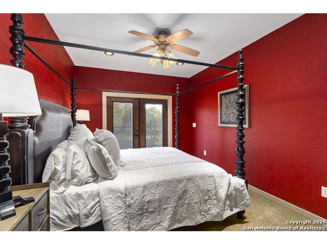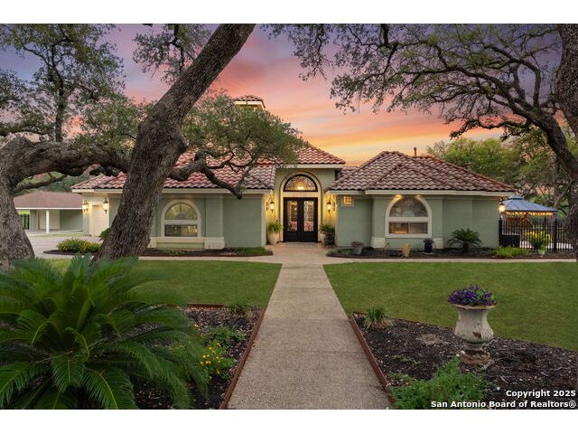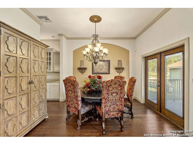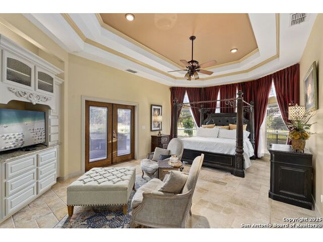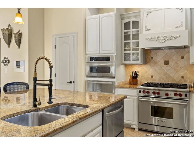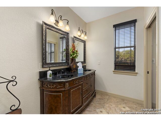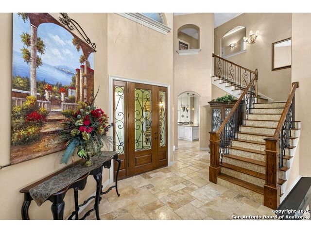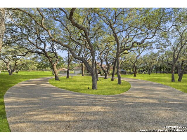 This stunning custom-designed estate offers 3 bedrooms, 2.5 baths, an attached 3-car garage, and 3,899 square feet of refined living space on 2.44 acres in the heart of La Vernia. Beautifully blending timeless elegance with Hill Country charm. From the moment you arrive, you'll be captivated by the home's exquisite craftsmanship and architectural details, including soaring 23-foot ceilings, Travertine tile, rich wood floors, and graceful arched entries. The open-concept layout features two spacious living areas and a formal dining room with French doors that open to a serene courtyard complete with a cozy fireplace and tranquil water fountain. A dedicated study with French doors provides the ideal space for a home office or can easily serve as a fourth bedroom. The spacious kitchen is a chef's dream, offering a large granite-topped center island perfect for casual dining or meal prep, barstool seating, and custom white cabinetry with ornate detailing. Warm stone tile flooring and backsplash, high-end stainless steel appliances-including a professional-grade gas range and double ovens-complement the elegant pendant lighting over the island and charming chandelier in the dining area. The seamless connection to the living room makes this the perfect home for both everyday comfort and entertaining. Retreat to the spa-like primary suite, where luxury meets tranquility. The beautifully designed bathroom showcases a dual-entry stone walk-in shower with dual shower heads, a raised whirlpool tub framed by tall windows and a decorative chandelier, and dual custom wood vanities with granite countertops and intricate detailing. Private outdoor access and an oversized walk-in closet complete this peaceful owner's retreat. Upstairs, both secondary bedrooms share a balcony overlooking the picturesque courtyard. One includes a cozy sitting area for added comfort and versatility. Step outside to your personal oasis-featuring a sparkling saltwater pool, expansive covered patio with a fully equipped outdoor kitchen, and a detached 1-bedroom, 1-bath casita with a walk-in closet-ideal for multigenerational living or guest accommodations. The fully fenced backyard, enclosed with wrought iron and high wire fencing, offers privacy and room to roam among mature trees and open skies. Additional highlights include an extra 1.5-car garage with carport, a circular driveway with ample parking, elegant iron stair railings, and upper clerestory windows that fill the formal areas with natural light. Located in a peaceful, upscale neighborhood with no HOA, this extraordinary home offers the perfect blend of custom luxury, functionality, and serene country living-just minutes from top-rated La Vernia schools, shopping, and dining.