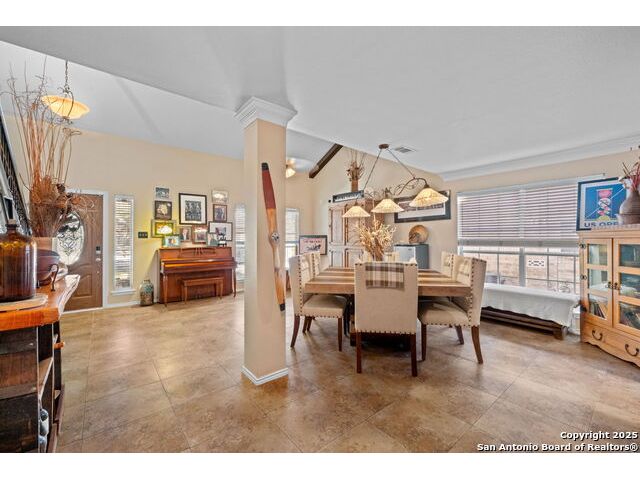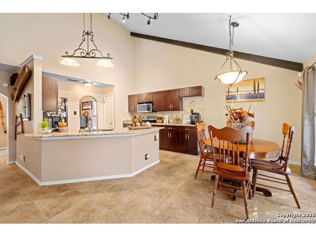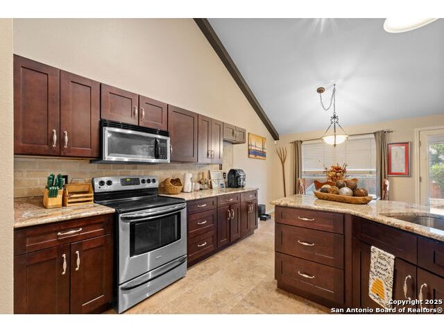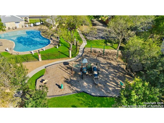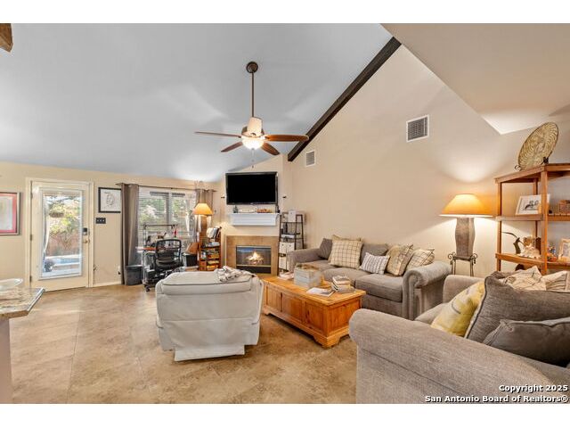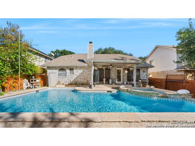 Located in the desirable Hart Ranch neighborhood, this well-maintained home features an open-concept floor plan with elegant design touches throughout. The spacious living room offers vaulted ceilings, a cozy fireplace, and architectural arch niches that add timeless character. The kitchen is equipped with quartz countertops, stainless steel appliances, and a breakfast bar that opens to the dining area, creating a seamless space for everyday living and entertaining. The primary suite is conveniently located downstairs and includes a walk-in closet, soaking tub, and separate shower. Upstairs offers a versatile loft area along with two additional bedrooms. Step outside to enjoy your private backyard retreat with a pool, hot tub, and covered stone patio surrounded by privacy walls. Additional highlights include a water softener, two-car garage, and downstairs laundry room. The neighborhood provides access to a community pool, basketball court, clubhouse, and playground, all within a community that features only one entrance and exit. Centrally located with easy access to I-10, this home offers a quick drive to the Medical Center, USAA, downtown San Antonio, and the La Cantera area.