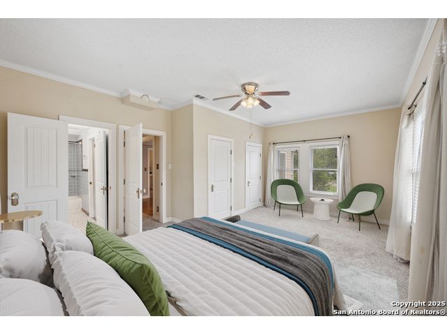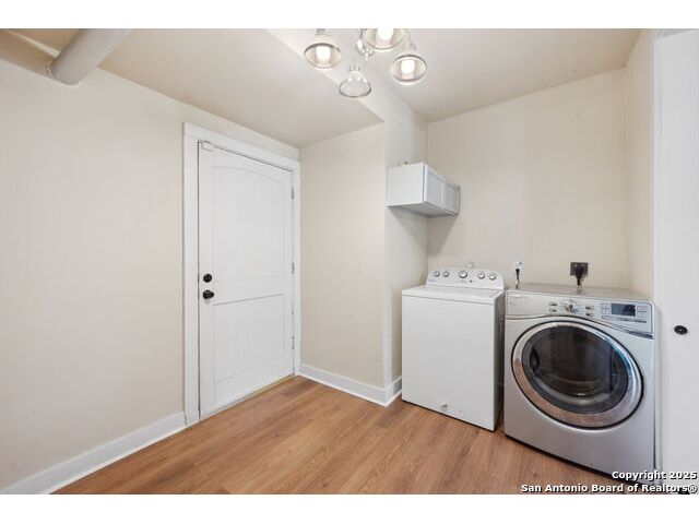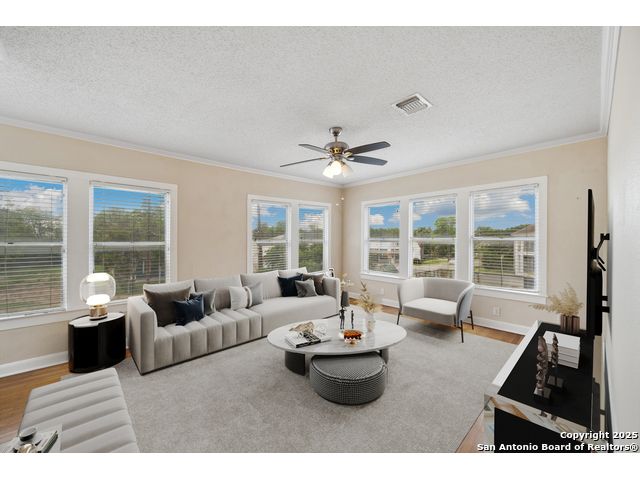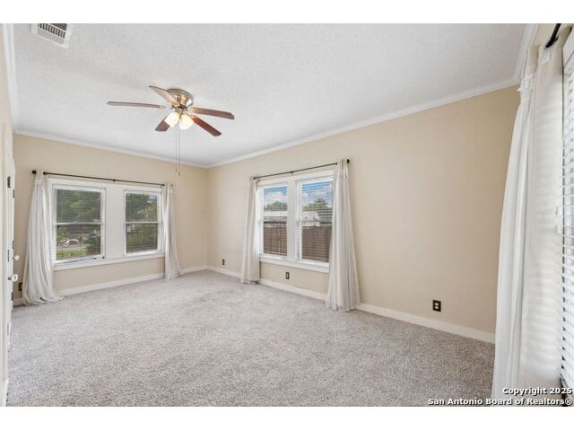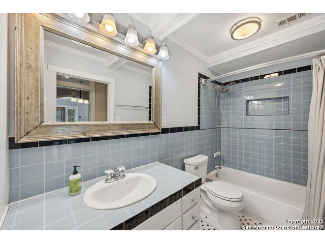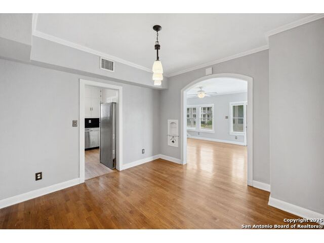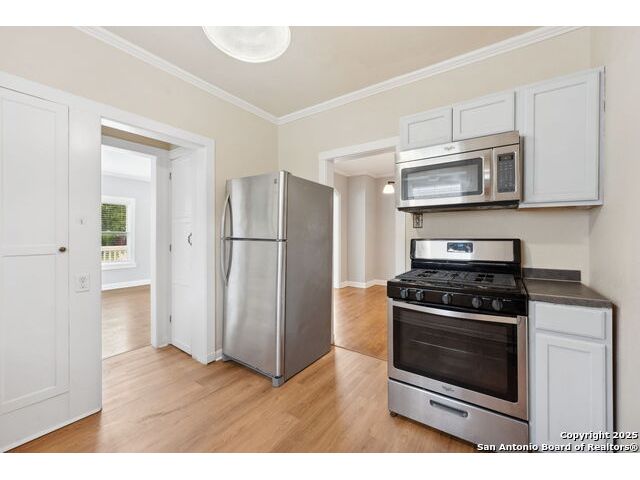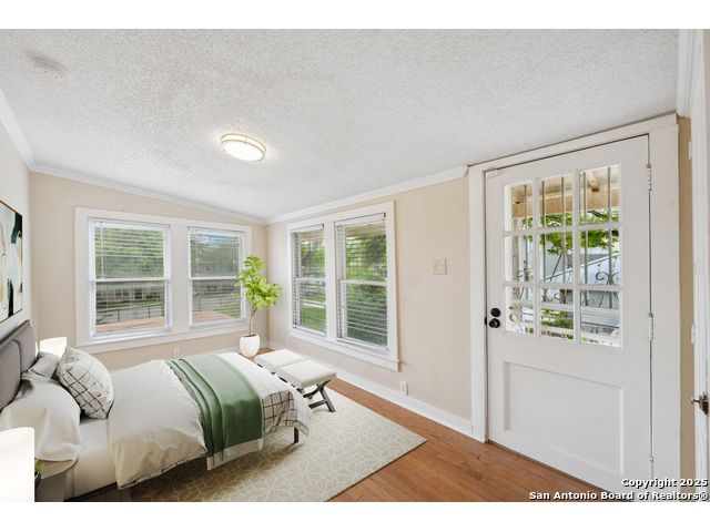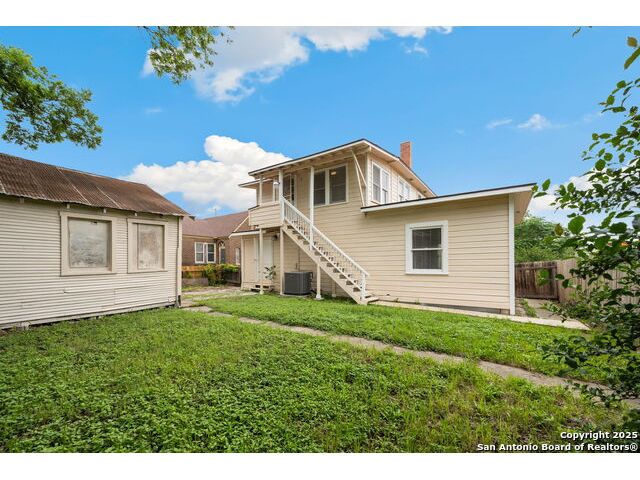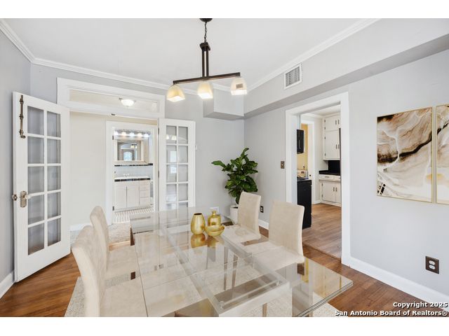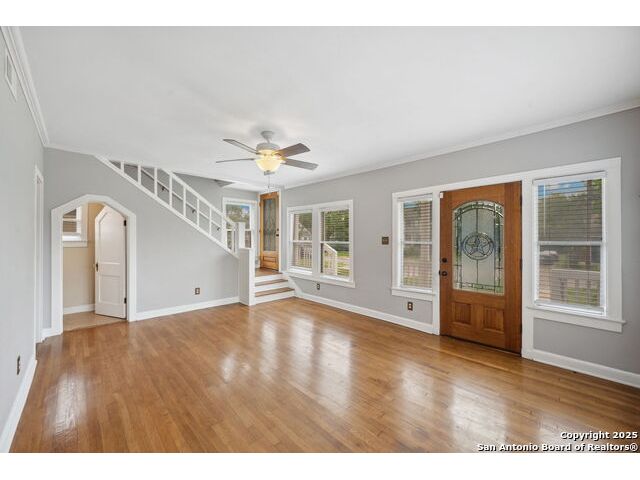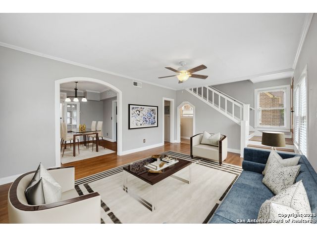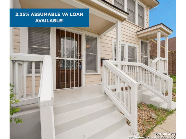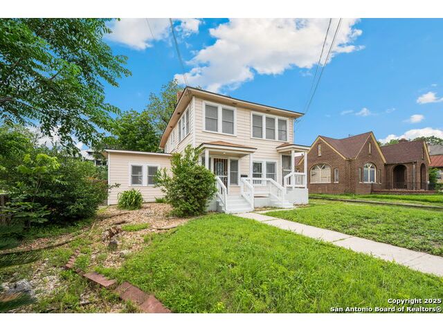 Located in the Historic District Near Downtown Landmarks with a 2.25% Assumable VA loan available! Access this beautiful home through your choice of two elegant front exterior wood doors with beveled glass, a unique architectural feature reflective of the home's 1930s construction period. You will initially be greeted by the welcoming living room filled with natural light, a ceiling fan, and warm wood flooring that continues through much of the home. Crown molding adds a refined touch throughout much of the interior. Just off the living room is a convenient half bathroom. The separate dining room, accessed through a large arched doorway, features a stylish chandelier and character-rich double glass doors with ten panes each, leading into a hallway, and there is a separate open doorway providing access to the well-appointed kitchen. You will appreciate the gas cooking range, built-in microwave, dishwasher, and plenty of cabinet space. A laundry room right off the kitchen offers outdoor access. The spacious main-level suite includes a ceiling fan, crown molding, and a full bathroom with secondary hallway access. Upstairs, another generously sized bedroom with its own full bathroom and outdoor access offers flexible living options. Two additional bedrooms complete the upper level, one of which is notably roomy. Outside, enjoy the convenience of a detached garage. The location is unbeatable- approximately a mile from the Alamo, 2.1 miles from Freeman Coliseum, 1.6 miles from The Pearl, and 1.4 miles from the Alamodome. Downtown attractions, including the Riverwalk, shopping, and hospitals, are all nearby. With a blend of historic charm and thoughtful updates, this home offers exceptional proximity to some of the city's most iconic destinations. Potential for short-term rental vacation use (subject to city approval). Come see for yourself! Some photos are virtually staged.