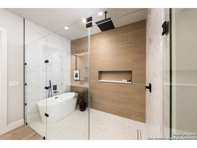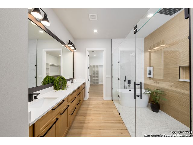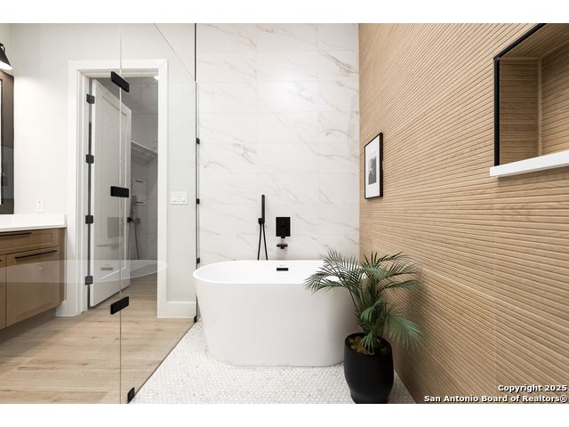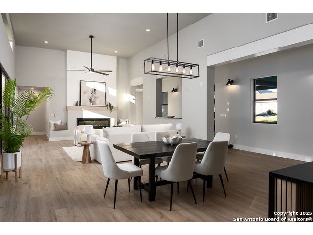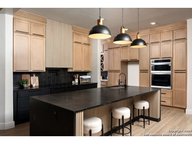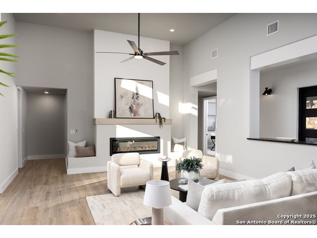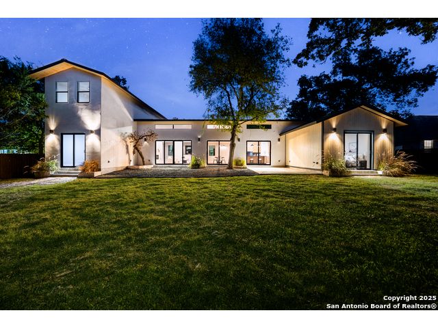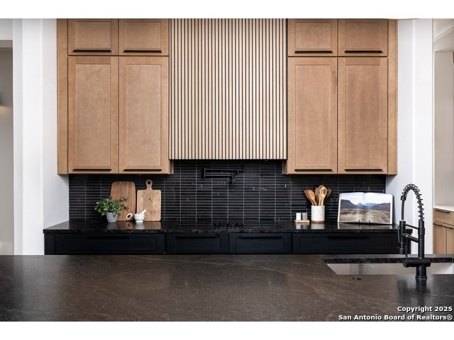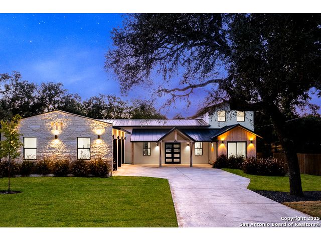 *Low Interest Rate available for qualified buyers through financing with Builder's Lender* Set on nearly half an acre beneath a canopy of mature oaks, this striking 1.5-story residence redefines Hill Country luxury. Blending stucco, stone, and warm wood accents beneath a sleek metal roof, the home's contemporary architecture feels both timeless and bold. A level driveway and 3-car side-entry garage create an impressive approach, while lush landscaping frames the modern facade in natural beauty. Inside, 3,303 square feet of light-filled living unfolds with tall ceilings, wood-like tile flooring, and an open, modern floor plan that invites connection. The heart of the home features a dramatic living area with expansive sliding glass doors, a statement electric fireplace, and views that extend effortlessly to the outdoors. The designer kitchen stuns with a waterfall-edge natural stone island, marble backsplash, custom cabinetry, and a generous walk-in pantry-crafted for both style and performance. The primary suite offers a tranquil retreat with private outdoor access, a spa-like bath featuring a soaking tub, spacious walk-in shower, and an oversized closet with built-ins. A split floor plan ensures privacy for the primary and two secondary bedrooms on the main level, while the upstairs game room and additional bedroom with full bath create the perfect space for guests or entertainment. A dedicated office framed by large windows offers the ideal work-from-home setting with views of the serene hill country. Outside, mature oak trees and privacy fencing create a peacefully backdrop for evenings under the stars or weekend gatherings. With every detail curated for comfort and style-and a builder warranty included- this Timberwood Park masterpiece combines modern design, natural serenity, and enduring craftsmanship in one breathtaking package.