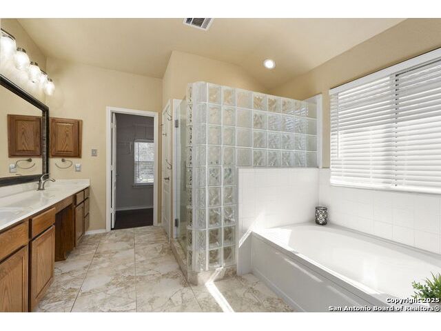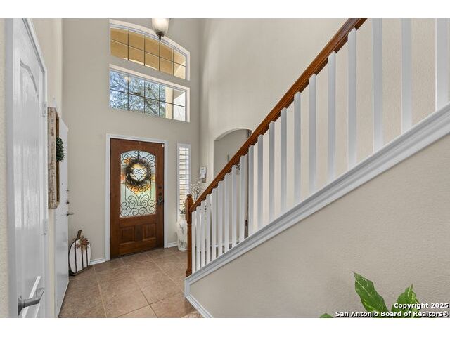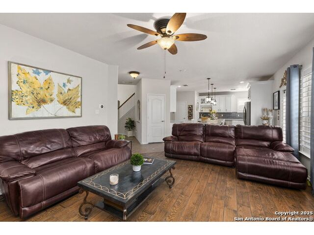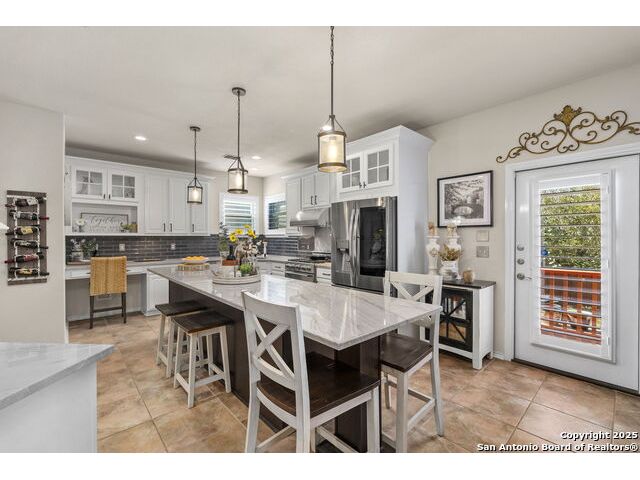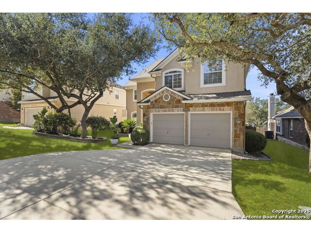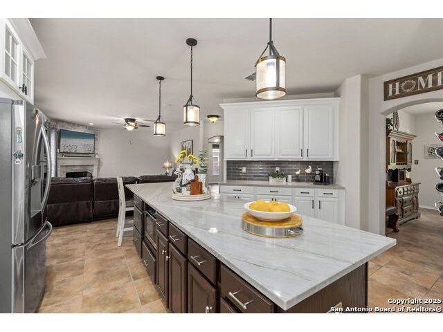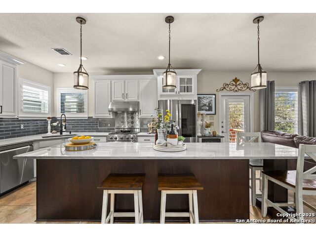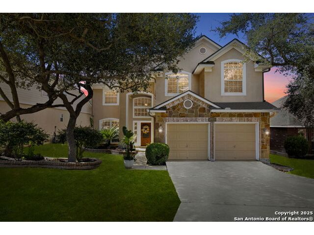 Located in the gated neighborhood of The Ridge at Lookout Canyon, this spacious 4 bedroom, 3 bathroom, 2 story home perfectly balances comfort, style, and functionality. Off the welcoming foyer, a formal dining room opens into a large living area centered around a cozy gas-log fireplace. The gourmet kitchen is a true showpiece, featuring abundant cabinetry, a walk-in pantry, and a stunning nearly 12-foot kitchen island with quartz countertops, and barstool seating, perfect for meal prep, casual dining, or hosting. A guest bedroom downstairs provides convenience, while upstairs, the primary suite offers a private retreat complete with a luxurious bath featuring a soaking tub, separate shower, and 2 expansive walk-in closets. A large media room or secondary living area adds flexible space for entertainment or relaxation and overlooks an incredible hill country view. Outside, the spacious backyard includes a welcoming patio and plenty of room for outdoor gatherings or play. Thoughtfully designed inside and out, this home offers exceptional living in where style, space, and comfort come together beautifully, all while being zoned to an acclaimed school district. Roof was replaced July 2024. House includes a water manifold.