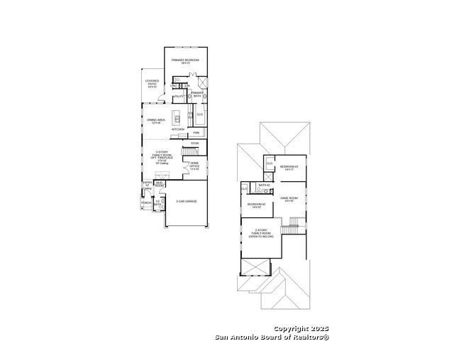 Welcoming front porch. Home office with French doors off of the family room. Two-story family room. Kitchen features an island, a 5-burner gas cooktop and a large walk-in pantry. Private primary suite with three large windows that look out to the back yard. Double doors lead to the primary bath with two vanities, a large corner glass-enclosed shower and a large walk-in closet. Second level features two secondary bedrooms and a game room. Covered backyard patio and multi-zone sprinkler system. Mud room and half bath off of the two-car garage.