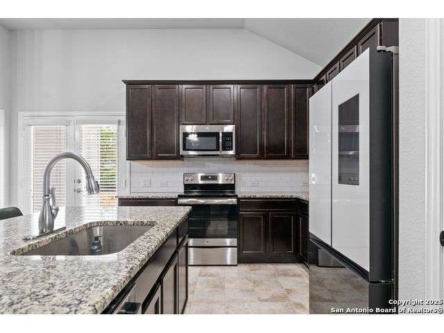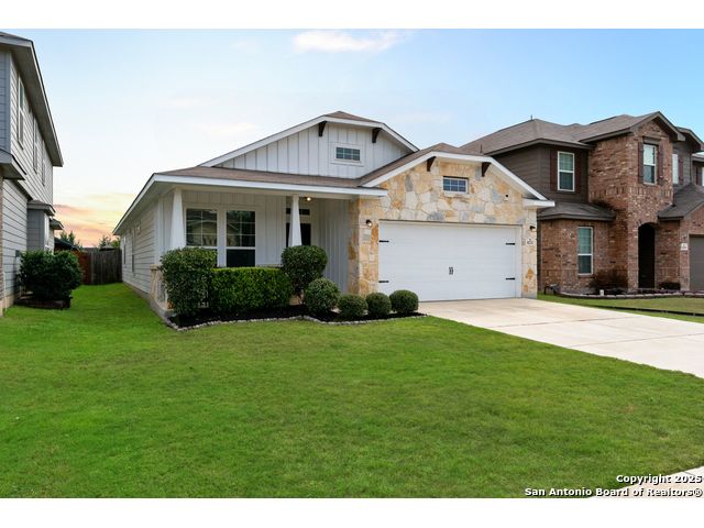Welcome to this beautifully maintained single-story home in the desirable Creekside Ridge community! Notice the distinctive curb appeal with its stunning front exterior fieldstone design and charming covered porch that welcomes you home. Designed with comfort and functionality, this home offers 3 bedrooms, 2 full bathrooms, a private office, and a bright open-concept layout featuring upgraded wood flooring in the living area, high ceilings throughout, and multiple large windows that flood the home with natural light. The kitchen boasts granite countertops, an upgraded backsplash, stainless steel appliances, ample amount of cabinets, and a large island that opens to the dining and living areas, making it perfect for entertaining family and friends. The spacious primary bedroom offers a tray ceiling, large windows, and an ensuite bath with double vanity, separate tub/shower, and a sizeable walk-in closet. Step outside through the double doors leading to the oversized covered back patio and thoughtfully landscaped leveled backyard, ideal for relaxing or hosting gatherings. This home also showcases energy efficient solar panels, ceiling fans in a majority of the rooms, updated light fixtures, freshly painted interior and a security system for peace of mind. Enjoy the convenience of being within walking distance to the brand new Selma Elementary School, while the quiet, secluded neighborhood offers a sense of privacy and community. Conveniently located near Randolph AFB, shopping and dining at The Forum, Loop 1604 and I-35. Schedule your showing today!
