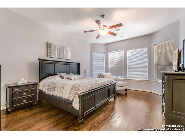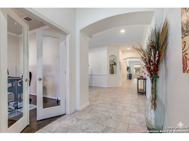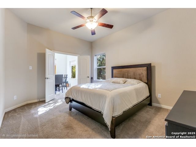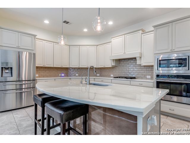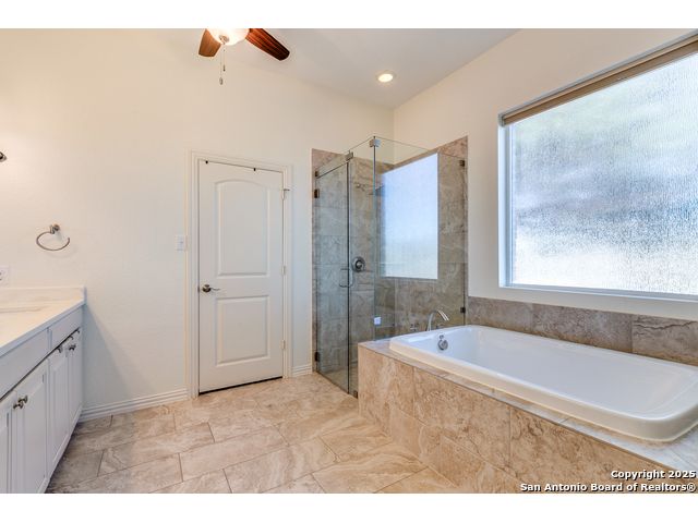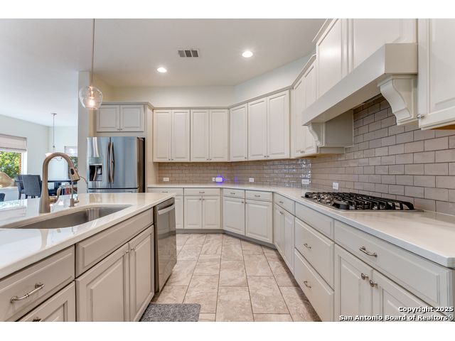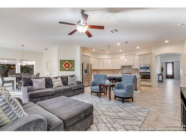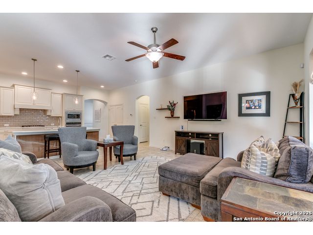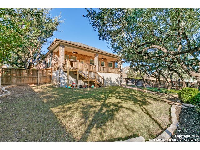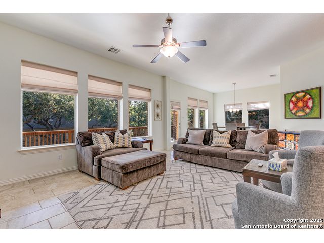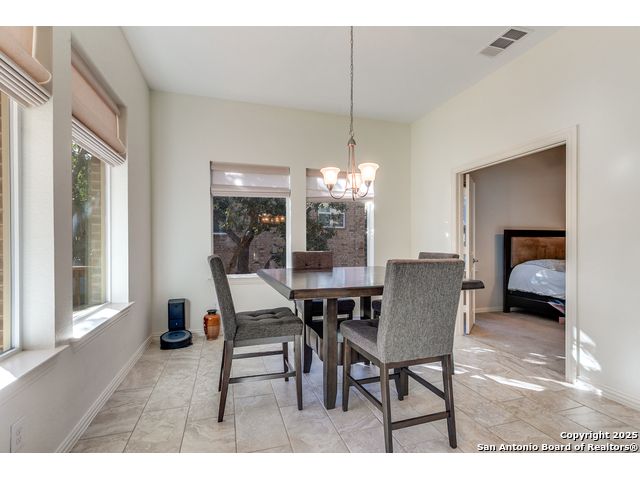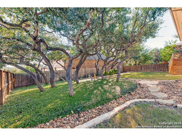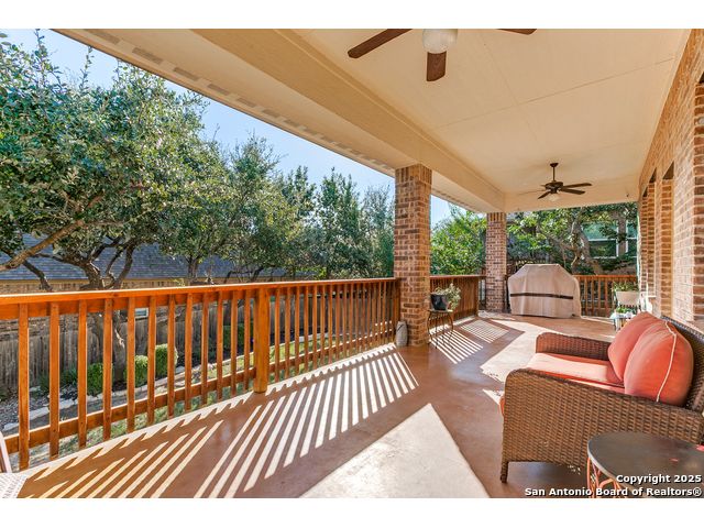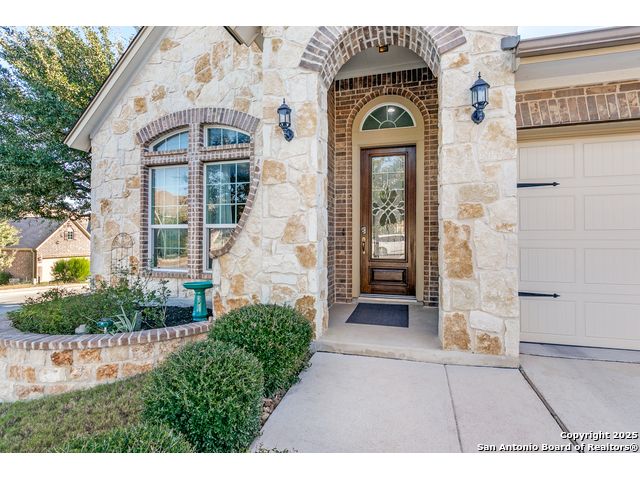 Welcome home to this stunning single-story David Weekley residence nestled in the desirable gated community of Two Creeks, within the acclaimed Northside Independent School District. Offering 2,750 sq. ft., this beautifully maintained home features 3 spacious bedrooms, 2 full bathrooms, a dedicated home office, and a formal dining area-perfect for both everyday living and entertaining. Soaring ceilings, abundant natural light, and a neutral color palette create an inviting and airy atmosphere throughout. The open-concept kitchen boasts granite countertops, a large island with breakfast bar, stainless steel appliances, and a gas cooktop. The primary suite provides a peaceful retreat with a bay window seating area, oversized walk-in shower, whirlpool tub, dual vanities, and a spacious walk-in closet. A secondary bedroom with a private en suite bath adds flexibility for guests or family. Step outside to a covered patio with built-in grill, surrounded by mature trees and crape myrtles-the perfect space for morning coffee or outdoor gatherings. Additional features include a three-car tandem garage, sprinkler system, water softener, and gutters. Enjoy resort-style amenities including a community pool, clubhouse, playground, park, and basketball court, all within walking distance to Aue Elementary and close to shopping and dining. This home blends luxury, comfort, and convenience in one of San Antonio's most sought-after communities.