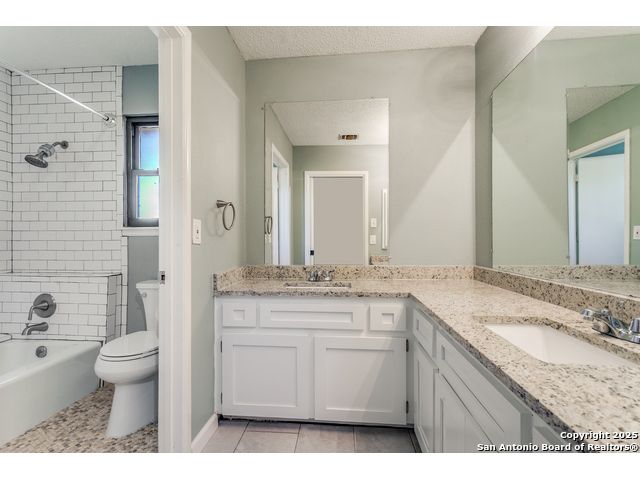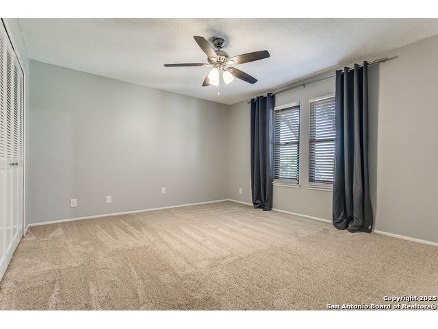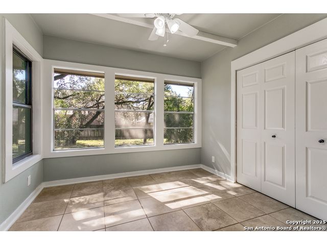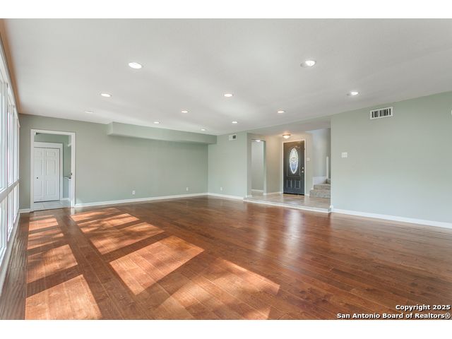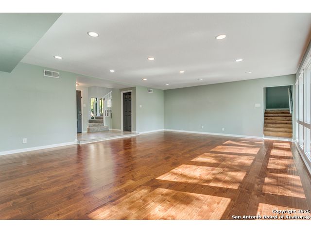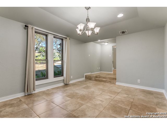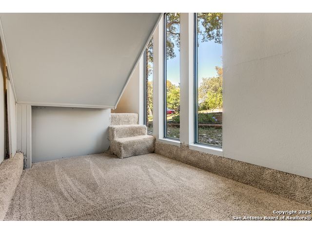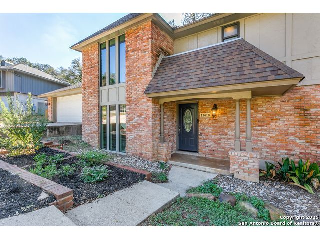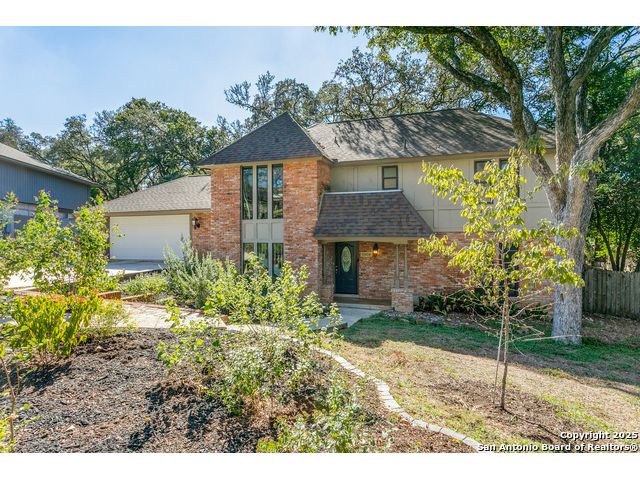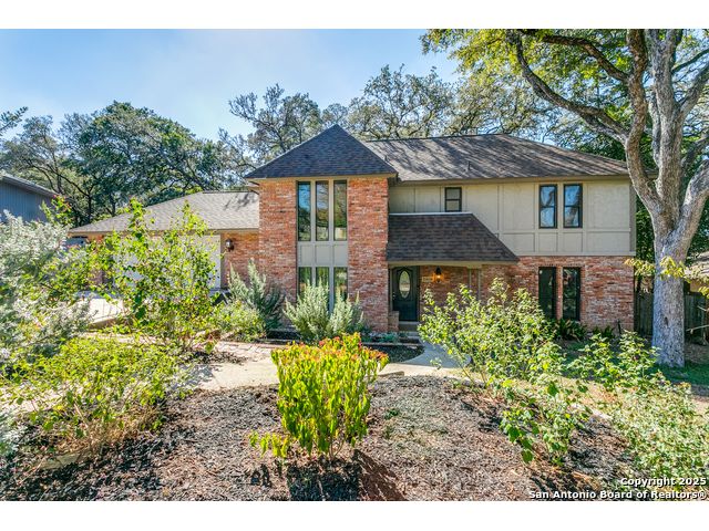This beautifully maintained comfortable and spacious home offers character and convenience in a community-rich neighborhood. Step into a spacious living room with recessed lighting, engineered wood floors, and a wall of windows overlooking a serene backyard with mature oak trees, a pergola, and a brick paver patio. The two-story front windows illuminate a cozy nook tucked under the curved staircase-perfect for reading, playtime, or a plant haven. No carpet downstairs, with tile and engineered wood throughout. The kitchen features trendy green cabinetry, stainless steel appliances, and opens to both a breakfast area and a flexible formal dining space that can double as a home office. The oversized owner's suite boasts cathedral ceilings and a wall of windows with backyard views. The fully renovated 2023 ensuite bath includes a double vanity and a walk-in shower with rain head, spray wand, bench, product alcove, window, frameless glass, and stylish tilework. Generously sized secondary bedrooms and a well-designed hall bath with double vanity and privacy door make mornings easy. The oversized garage fits Texas-sized trucks and offers bonus storage. Located steps from the community playground, this home is part of a friendly neighborhood with voluntary HOA and optional swim, tennis, and garden clubs. Enjoy small-town charm with events like Easter egg hunts and 4th of July bike parades-all while being centrally located near everything San Antonio has to offer. Recent updates include roof & water heater (2016) and upstairs HVAC (2020).