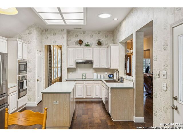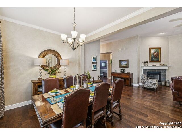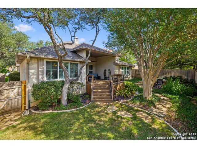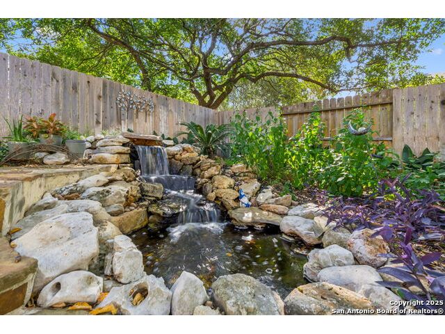 Welcome to this beautifully maintained former model home, situated on a quiet cul-de-sac within the desirable gated community of Springs of Stone Oak. This 3-bedroom, 2.5-bath residence offers sophistication, comfort, and thoughtful upgrades throughout. Step inside to soaring high ceilings, a cozy fireplace, and plantation shutters that add timeless elegance. A dedicated office provides the perfect work-from-home space, while a separate dining room is ideal for gatherings and entertaining. The spacious kitchen features an island, upgraded Shelf Genie storage, and ample counter space for cooking and hosting. The remodeled primary bathroom and updated secondary baths create a fresh, modern feel. Additional upgrades include a water softener, tankless water heater, irrigation system, new windows, and a custom deck perfect for outdoor dining or relaxing. Outside, the serene backyard becomes your private oasis with a tranquil waterfall feature. Residents of Springs of Stone Oak enjoy access to a private neighborhood park and playground, along with the convenience of nearby shopping, dining, and top-rated schools. A rare opportunity to own a former model home with exceptional care and improvements-move-in ready.