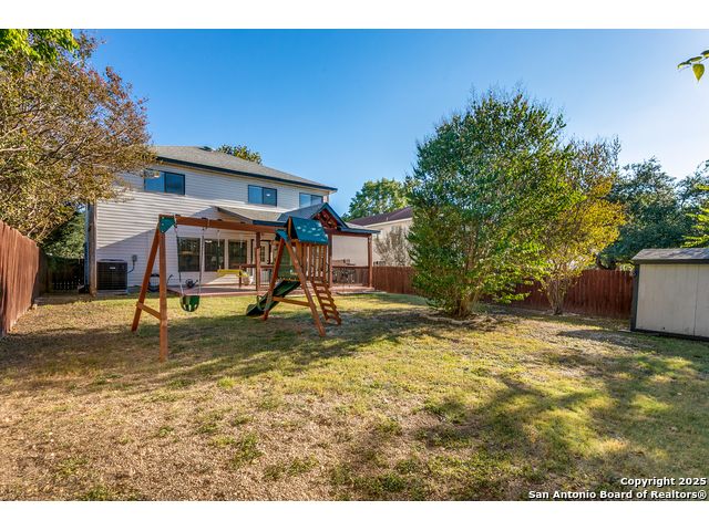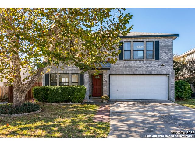 Welcome to this beautiful and spacious two-story home, featuring a charming brick facade and perfectly situated on a charming, tree-lined street. The main level is dedicated to communal spaces, offering a seamless flow from the living room to an expansive dining and kitchen area. This space is complemented by a well-appointed half bath, ensuring privacy for all bedrooms located upstairs. The island kitchen is perfect for gatherings, equipped with abundant cabinetry, recessed lighting, and a large island. Its open-concept design connects effortlessly to the dining area, ideal for serving family meals and enjoying game nights with friends and loved ones. Upstairs, a bonus room provides versatility for a secondary living area, a game room, a home office, or even a hobby/craft space. Generously sized, the primary bedroom offers the flexibility to create an owner's private sanctuary with separate sleeping and lounging areas. It also includes an ensuite bath and a walk-in closet. The secondary bedrooms enjoy a beautifully reimagined full bath, featuring a soaking tub and impressive glass doors. Stepping outside to your private backyard oasis, you'll find an expansive yard accompanied by an inviting covered patio with an al fresco extension, all framed by views of the surrounding mature trees. A convenient storage shed allows the garage to remain available for vehicle parking. The home enjoys added privacy similar to a corner lot, as it is bordered by a common walking path on the west side, ensuring no shared fence line with the adjacent neighbor. This convenient path leads directly to Stahl Elementary, with Harris Middle School just 1.5 miles away, and Madison High School about half a mile away. Enjoy added convenience of HEB only 1.5 miles down the road, and a quick 7-minute drive to Rolling Oaks Mall, Walmart, and numerous dining options. The home also offers easy access to 1604, I-35, and Loop 410, with the airport just 15 minutes away making commuting and traveling a breeze. Your dream home awaits - schedule a showing to experience the beauty, functionality, and convenience this home offers!