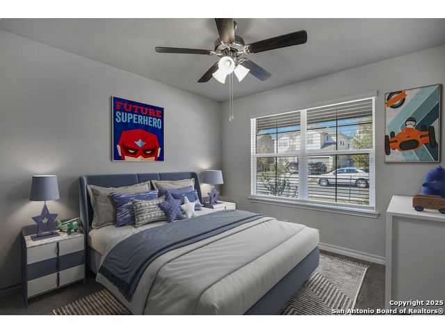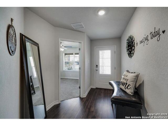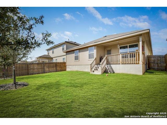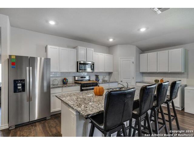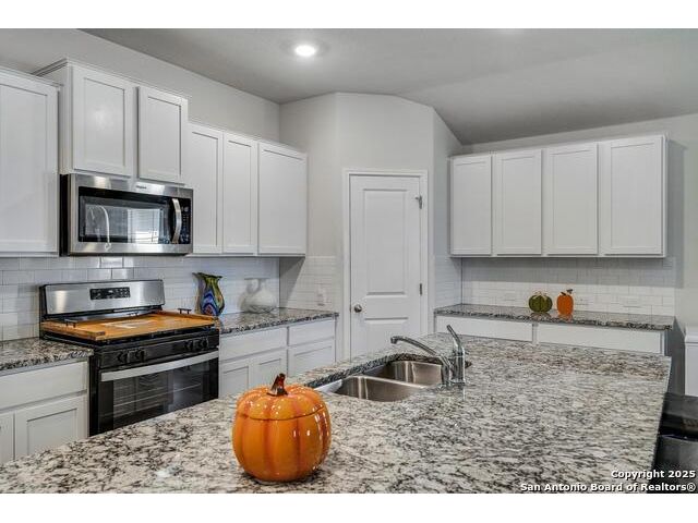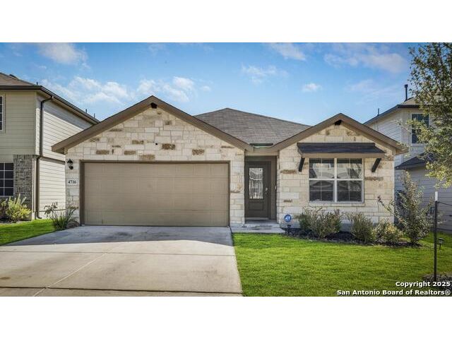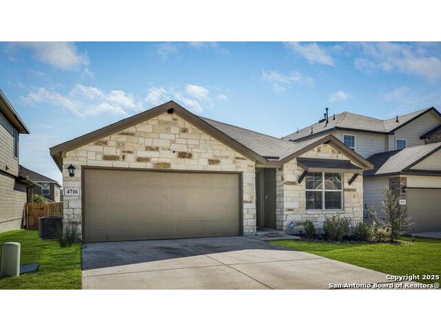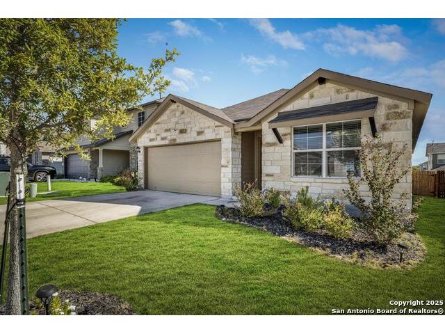 PRICED TO SELL! MOVE-IN READY! This nearly new DR Horton "Bryant" plan is a single-story home, offering 4 bedrooms, 2 baths, and 1,707 sq. ft. of comfortable, open-concept living. A welcoming foyer with a decorative nook leads into the spacious kitchen and family room-perfect for everyday living or entertaining. The kitchen features a big island, corner pantry, granite countertops, subway tile backsplash, stainless steel appliances, and a gas range. The private primary suite sits at the back of the home and includes double vanities, a separate tub and shower, and a roomy walk-in closet. One front bedroom works great as a home office, while two others and a full bath are just off the kitchen. You'll also find a convenient laundry room close to the main living area. Highlights include 9-foot ceilings, faux wood blinds, luxury vinyl plank flooring, ceramic tile in wet areas, and pre-plumbing for a water softener. Relax on the covered patio and enjoy the fully landscaped, irrigated yard. Also, do not overlook the roomy two car garage with lots of storage space. This 2023 D.R. Horton-built "Bryant" is ready for new owners and full of modern comfort and style. Riverstone at Westpointe is a highly desirable master-planned community offering something for everyone. Residents enjoy an impressive lineup of amenities, including a fully equipped fitness center, park, elevated playscape, basketball and pickleball courts, and a resort-style lazy river complete with waterslides, splash pad, and swimming areas. Enjoy easy access to Loop 1604, major west-side employers, and all the shopping, dining, and entertainment this exciting part of San Antonio has to offer.