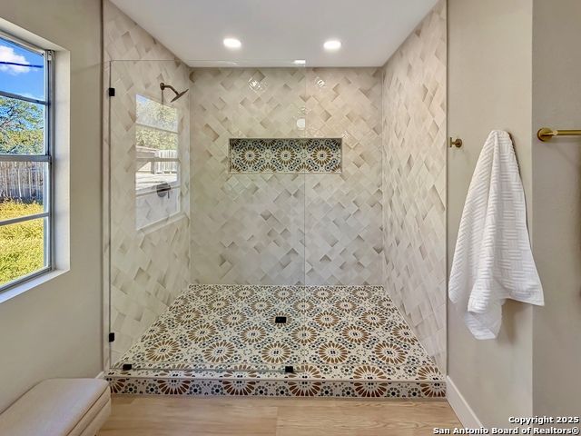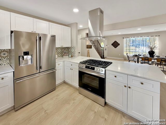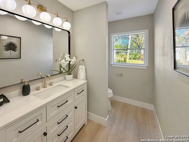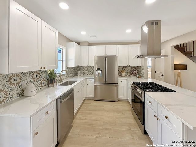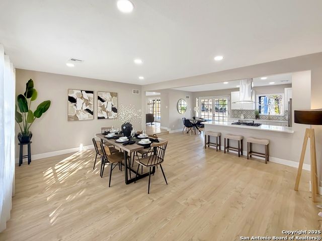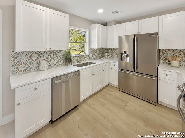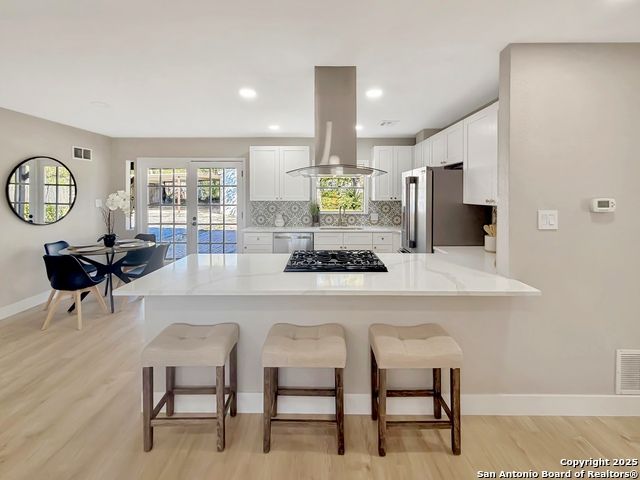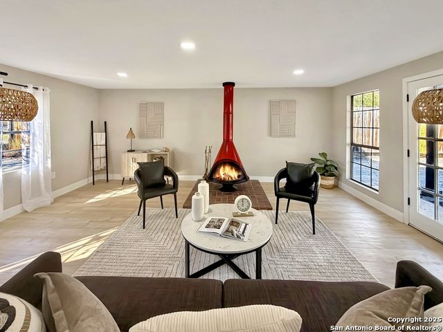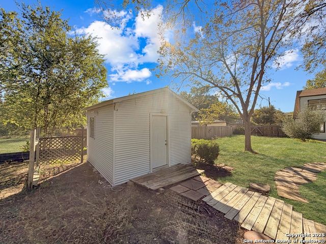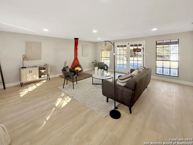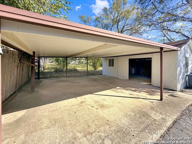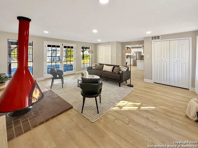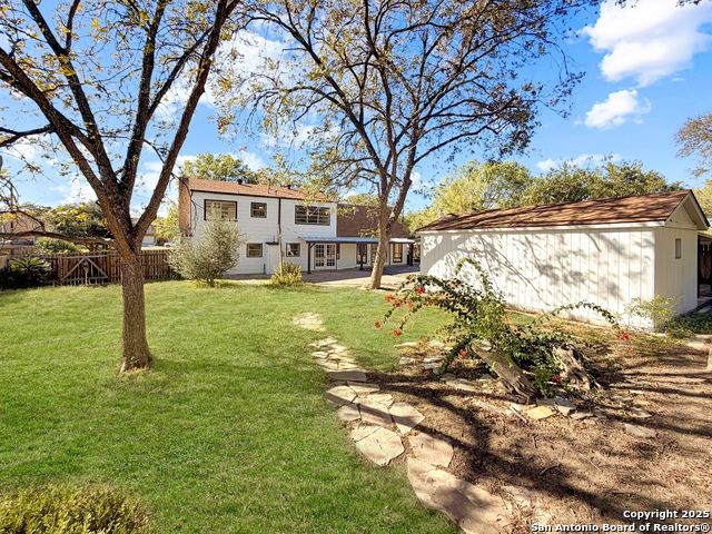 Designer Home on .5 Acre Lot Near the Quarry! Beautifully remodeled and designed with luxury finishes, this 3 bedroom, 2.5 bath home sits on a .507 acre lot with colorful landscaping, mature trees, and no HOA. Enjoy an open concept layout filled with natural light, a stunning kitchen with quartz countertops, gas cooking, stainless steel appliances, and luxury flooring throughout. The primary suite offers a spa-style shower and double vanities, while the second living area features a red Mid-Century fireplace and French doors leading to a private backyard retreat. A three-car carport, workshop, and cooled shed add versatility and value. Located near the Quarry, North Star Mall, top restaurants, and major highways for easy access to everything San Antonio has to offer. Move-in ready and priced to sell-schedule your showing today!
