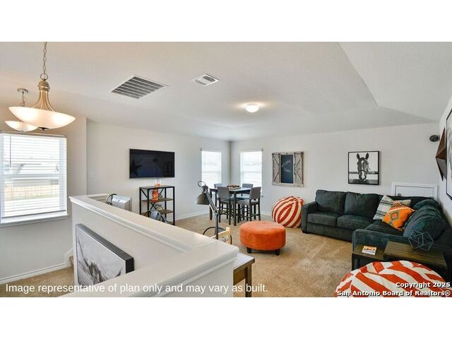Welcome to The Walsh, a stunning two-story home located at Riverstone at Westpointe in San Antonio, TX. This floor plan offers 4 classic exteriors, a 2-car garage, and a full yard landscaping and irrigation package, ensuring that your home has instant curb appeal. A spacious covered front porch (per plan) welcomes you inside this 4 bedroom, 2.5 bathroom home where you'll find 2323 square feet of living space. Follow the entry hallway past a beautiful formal dining room and into the open kitchen featuring stainless steel appliances, quartz countertops, stylish white subway tile backsplash, spacious corner pantry, tons of cabinet space and a large eat-in breakfast bar. The kitchen opens to a spacious living room, complete with a stunning vaulted ceiling and easy-maintenance hard surface flooring. The living room extends to a lengthy covered back patio (per plan), perfect for outdoor dining or just simply keeping an eye on the kids while they play outside. The private main bedroom suite is located downstairs off the family room and offers dual vanities, a separate tub and walk-in shower, ceramic tile flooring, and a storage-friendly walk-in closet with shelving. Head upstairs to find a spacious game room or office area, a second full bath, and three large secondary bedrooms with quality carpet and walk-in closets. Additional features of The Walsh include 2-inch faux wood blinds throughout the home, luxury vinyl plank flooring in entryway, family room, kitchen, and dining room, ceramic tile at all bathrooms and utility room, and pre-plumb for water softener loop. You'll enjoy added security in your new home with our Home is Connected features. Using one central hub that talks to all the devices in your home, you can control the lights, thermostat and locks, all from your cellular device.