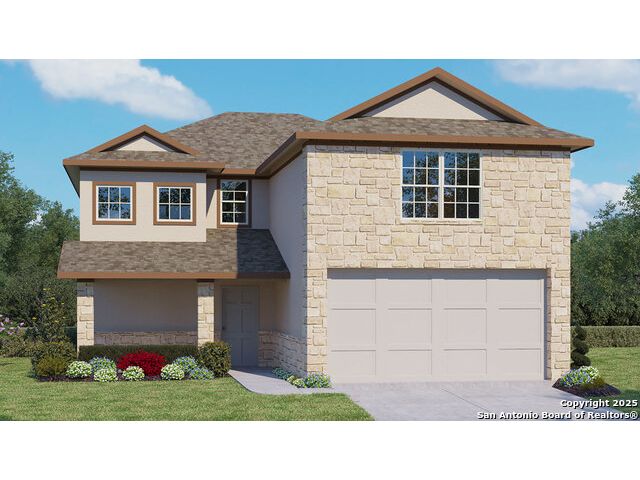 The Bowen is a 2-story home featured at Riverstone at Westpointe in San Antonio, TX. The Bowen is sure to stand out with three classic front exterior, 3 bedrooms, 2.5 bathrooms and 2-car garage spread across 2241 square feet of living space. Usher guest through a covered front porch (per plan) and into a front foyer which leads into a grand, open-concept living, dining, and kitchen with tons of cabinet storage and quartz countertop space. Your kitchen also includes a spacious kitchen island, stainless steel appliances, classic white subway tile backsplash, and a deep single basin kitchen sink that faces a large window overlooking your fully landscaped and irrigated backyard. The second story opens into a large and versatile loft space with plenty of natural light, an upstairs utility room, a full bath, and all three bedrooms. A decorative nook located off the stairway guides you to the large main bedroom and ensuite bathroom, secluded from the other bedrooms. Your main bedroom features a semi-vaulted ceiling, a separate garden tub, a tiled walk-in shower, double vanity sinks, and a spacious walk-in closet. The Bowen floor plan is perfect if you want a place to entertain downstairs and a private retreat to relax in upstairs. Additional features include, 9-foot ceilings, 2-inch faux wood blinds throughout the home, luxury vinyl plank flooring in entryway, living room, kitchen, and dining area, ceramic tile at all bathrooms and utility room, pre-plumb for water softener loop, and a relaxing covered back patio (per plan) located off the living room. You'll enjoy added security in your new home with our Home is Connected features. Using one central hub that talks to all the devices in your home, you can control the lights, thermostat and locks, all from your cellular device.