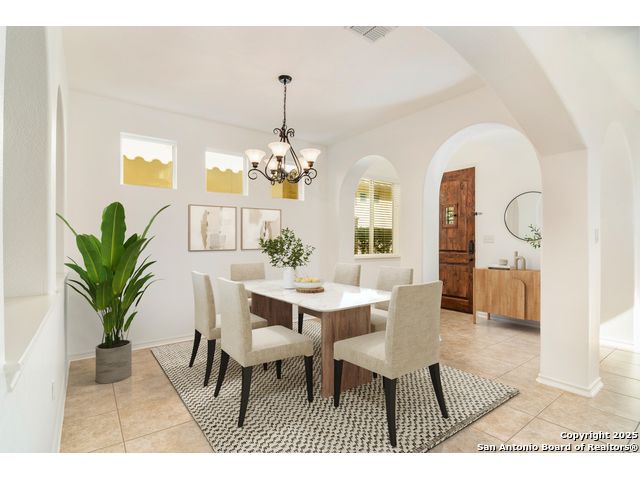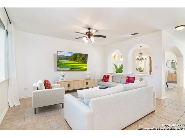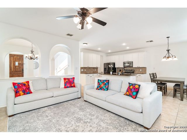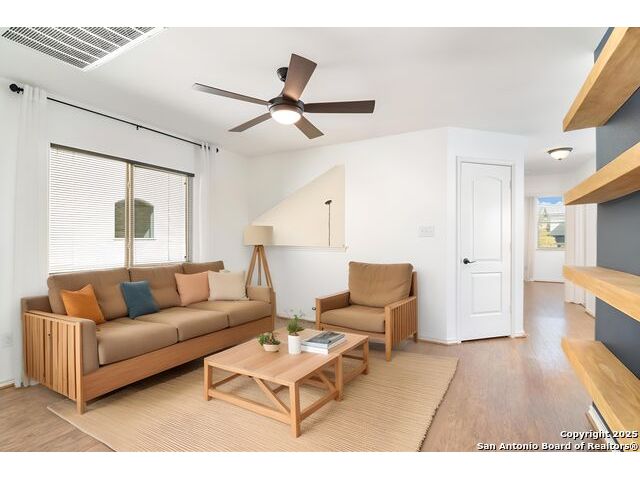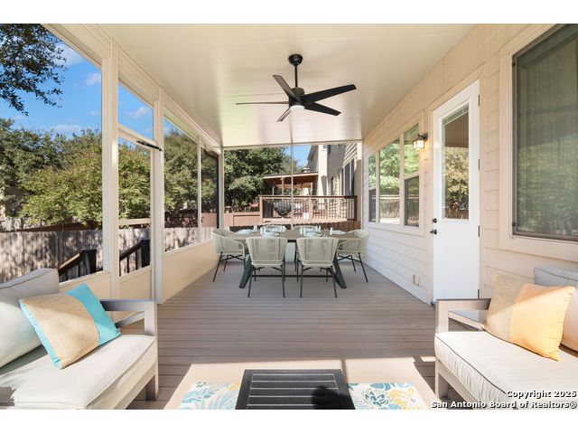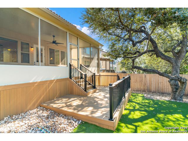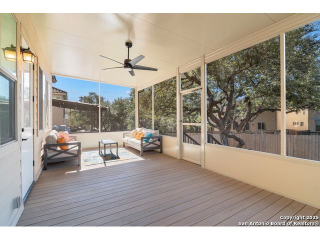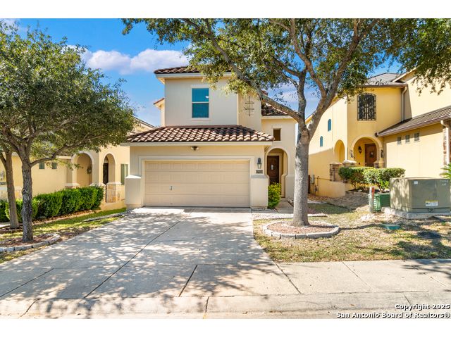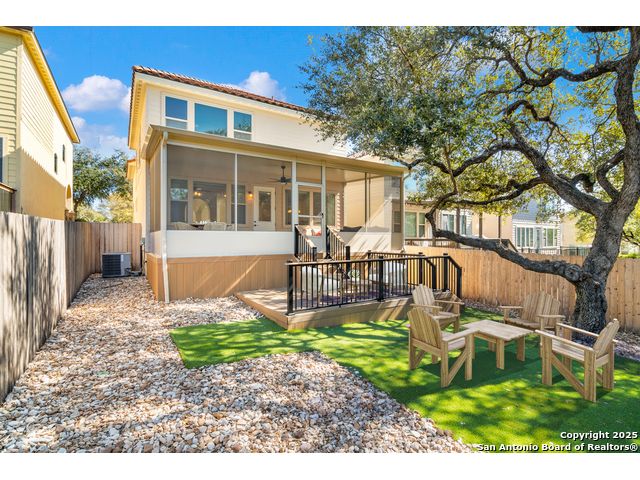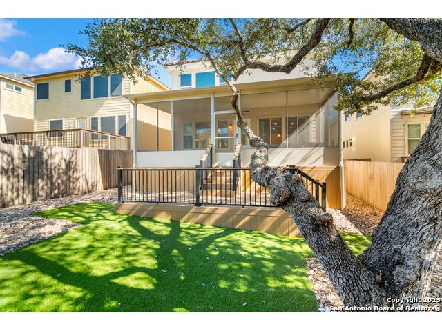 This beautifully refined two-story residence in Presidio Heights blends warm Spanish-inspired design with thoughtful modern updates. The inviting main level features an open layout anchored by a bright kitchen equipped with new stainless steel appliances and freshly updated cabinetry. Generous living and dining spaces create a comfortable flow for everyday use and hosting. Upstairs, the primary suite offers a peaceful setting with a spacious layout and a well-appointed bath that includes a soaking tub and dual vanities. Two secondary bedrooms provide ideal flexibility for guests, family, or a home office. The outdoor living space is a standout feature. A fully screened-in porch with durable decking allows you to enjoy the outdoors in comfort, free from seasonal pests. Fresh turf enhances the backyard's usability and creates a low-maintenance, private retreat. Convenience is unmatched. The home sits minutes from Loop 1604, I-10, The Rim, La Cantera, and a wide range of restaurants, shops, and everyday amenities. The neighborhood pool is located just across the street for added enjoyment. Enjoy style, comfort, and exceptional access to the best of San Antonio.