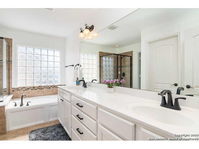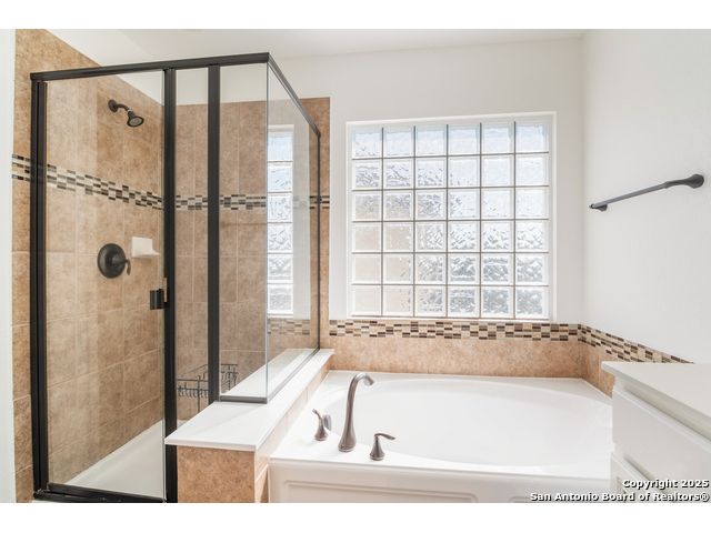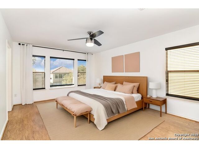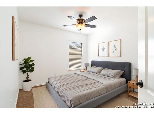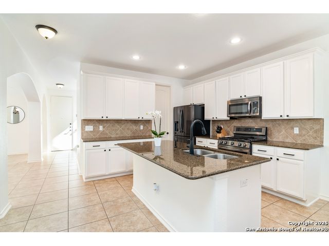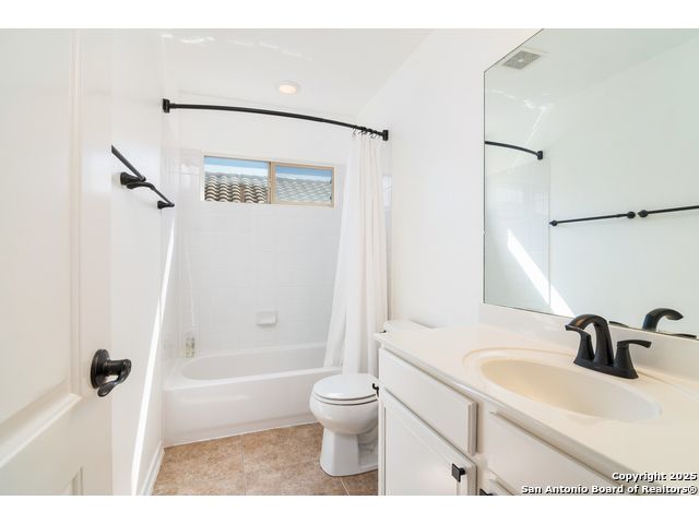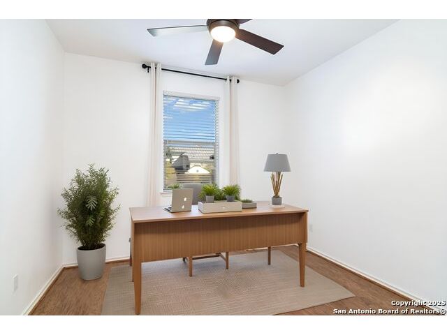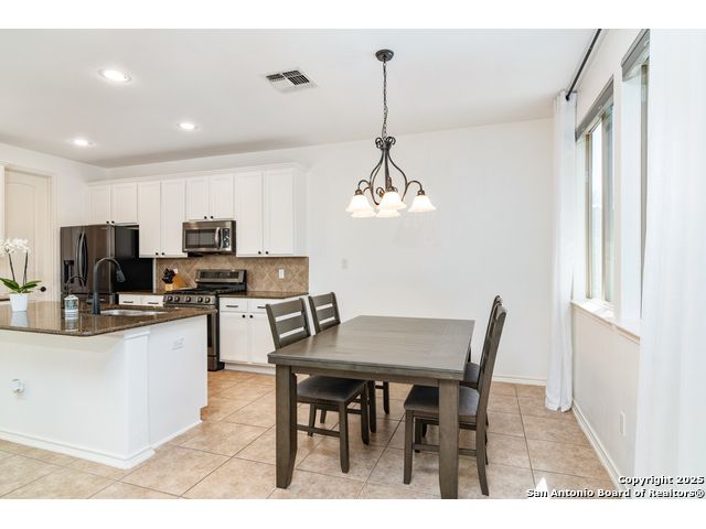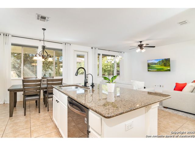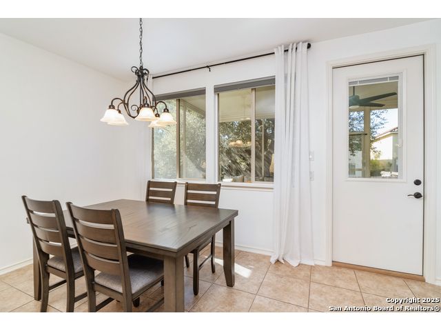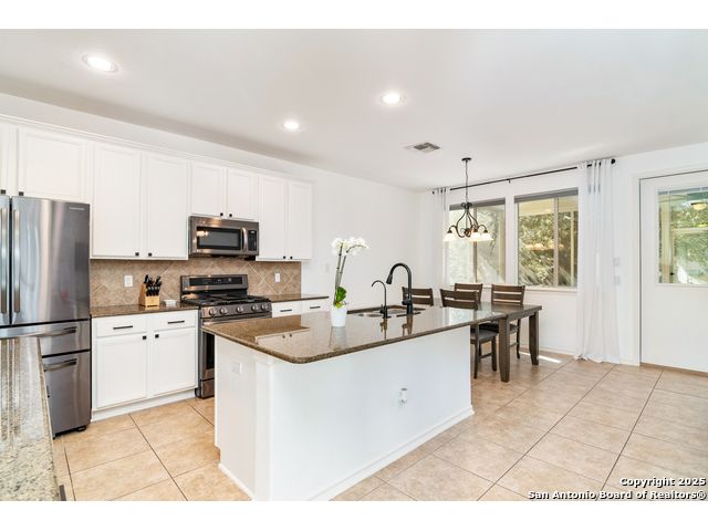 This beautifully refined two-story residence in Presidio Heights blends warm Spanish-inspired design with thoughtful modern updates. The inviting main level features an open layout anchored by a bright kitchen equipped with new stainless steel appliances and freshly updated cabinetry. Generous living and dining spaces create a comfortable flow for everyday use and hosting. Upstairs, the primary suite offers a peaceful setting with a spacious layout and a well-appointed bath that includes a soaking tub and dual vanities. Two secondary bedrooms provide ideal flexibility for guests, family, or a home office. The outdoor living space is a standout feature. A fully screened-in porch with durable decking allows you to enjoy the outdoors in comfort, free from seasonal pests. Fresh turf enhances the backyard's usability and creates a low-maintenance, private retreat. Convenience is unmatched. The home sits minutes from Loop 1604, I-10, The Rim, La Cantera, and a wide range of restaurants, shops, and everyday amenities. The neighborhood pool is located just across the street for added enjoyment. Enjoy style, comfort, and exceptional access to the best of San Antonio.