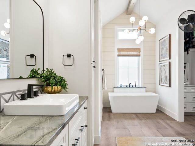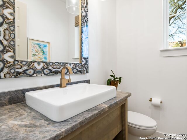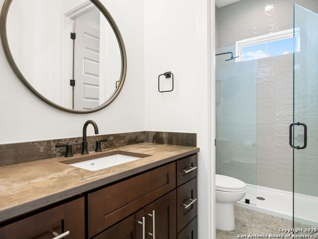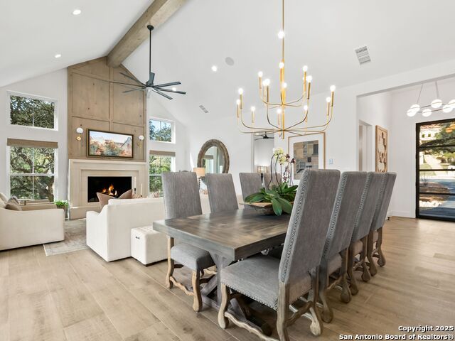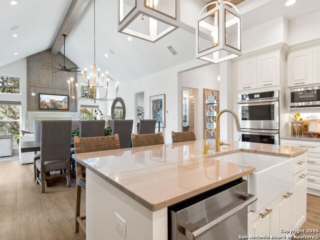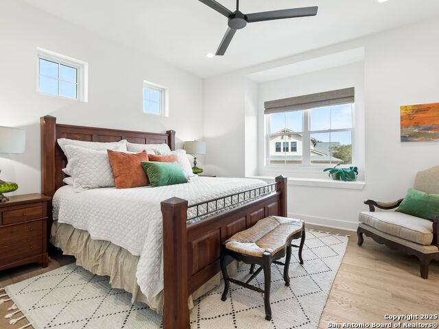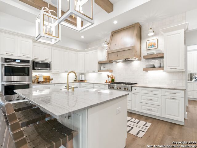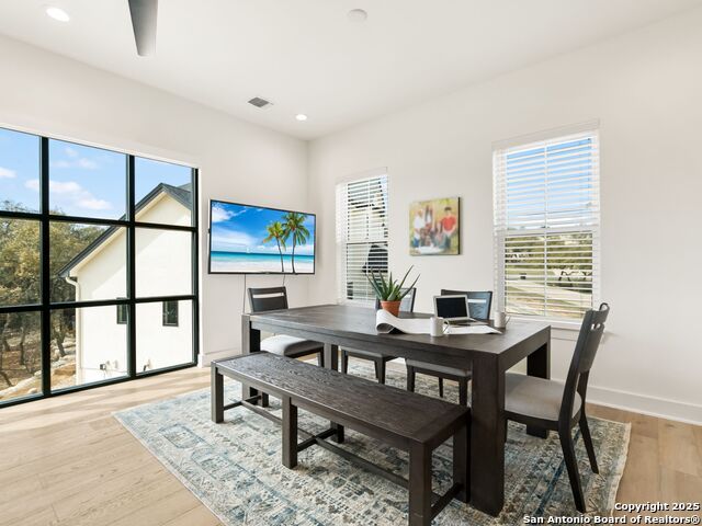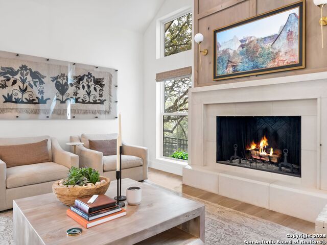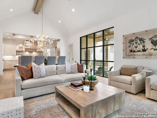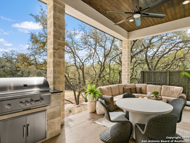 This beautifully designed home captures the essence of modern Hill Country elegance, offering expansive living spaces and a warm, timeless character throughout. Soaring cathedral ceilings and oversized windows fill the interior with natural light, seamlessly blending indoor comfort with outdoor serenity. At the heart of the home, the gourmet kitchen impresses with custom solid wood cabinetry, an oversized vent hood, designer backsplash, and stainless steel appliances with gas cooking-a perfect balance of form and function for both everyday living and entertaining. The primary suite is a peaceful retreat, highlighted by a trayed ceiling, custom wood-paneled accent wall, and a spa-inspired bathroom drenched in natural light. Dual closets feature custom built-ins and a generous walk-in design for elevated organization and luxury. The downstairs media room provides a dedicated space for entertainment, while upstairs bedrooms include private en-suite bathrooms, ensuring comfort and privacy for family and guests. Above the secondary detached garage with full bathroom this property offers additional flexibility for a home office, guest quarters, or creative studio, adding to the home's versatility. Outdoors, enjoy year-round living on the oversized covered patio, featuring wood-paneled ceiling accents and a built-in gas grill-perfect for relaxing or entertaining. Set on a .62-acre lot, this property offers exceptional privacy and space within the highly sought-after Village Green community. Experience the perfect blend of modern design and Hill Country charm-welcome home.