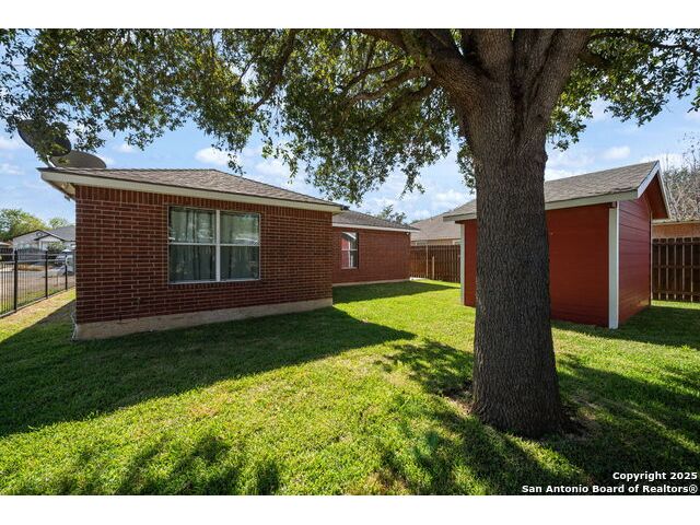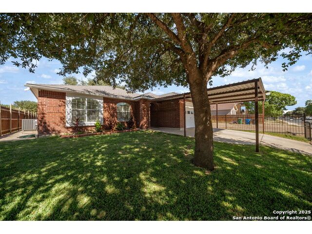 Check out this sharp ONE STORY Move In Ready Home in the Palo Alto Subdivision. 3 Bedrooms, 2 Full Baths and one Car Garage. Open Family Room, Spacious Kitchen has breakfast bar and generously sized eating area. Primary Suite (15' x 12') with well appointed Primary Bath has walk in shower, double sinks & solid surface countertop. 8' x 6' walk in primary closet. No carpet in the home. 21' x 12' finished out Garage could become 4th Bedroom or Flex Space if HVAC were added by Buyer. Excellent curb appeal. 4 sided brick exterior. Covered car port along with wrought iron slide gate for added security across the front driveway. New St. Augustine grass sod added to front and rear yards. 12' x 10' Storage Shed at rear stays with home. Property is fully fenced. Convenient location only 1.4 miles to Palo Alto College. Walking distance to Community Park, playground, basketball court, baseball/softball field and Hope Elementary School.