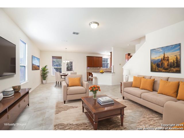 Step inside 8219 Victory Point and feel right at home. As you enter, you're greeted by an oversized living area filled with natural light-an open and airy space that flows seamlessly into the dining area and kitchen, perfect for entertaining or everyday living. The kitchen welcomes you with beautiful countertops, a large eat-at bar, and plenty of cabinetry, offering the ideal spot to gather for morning coffee or casual meals. Upstairs, a spacious second living area provides flexibility for a media room, playroom, or cozy retreat-perfect for movie nights or quiet weekends in. All three bedrooms are tucked away on this level for added privacy. The oversized primary suite feels like a true escape, featuring a comfortable sitting area ideal for reading or relaxing, a walk-in shower, and generous closet space to keep everything organized. A large laundry room downstairs with built-in shelving adds convenience, while thoughtful updates like an upgraded water heater offer peace of mind. Step out back to a covered patio overlooking a well-kept yard-perfect for grilling, relaxing, or enjoying the evening breeze-with front and back sprinklers making lawn care effortless. Set in a walkable neighborhood lined with sidewalks, you'll love spending time outdoors and connecting with neighbors. Enjoy the community pool, playground, and basketball court just a short stroll away-offering fun, fitness, and relaxation right outside your door.