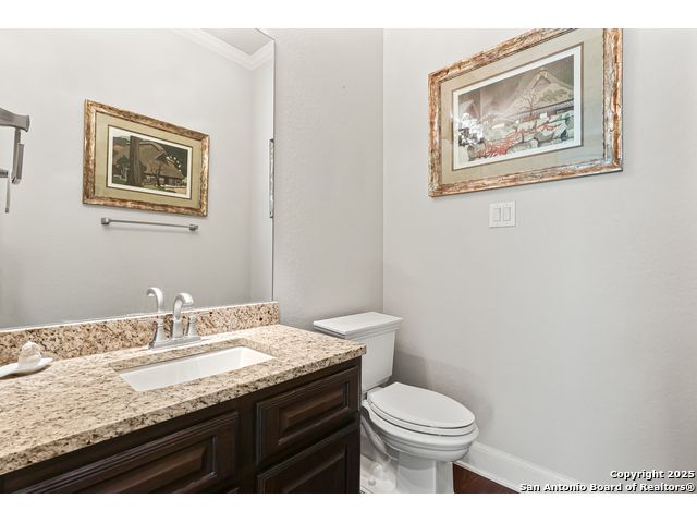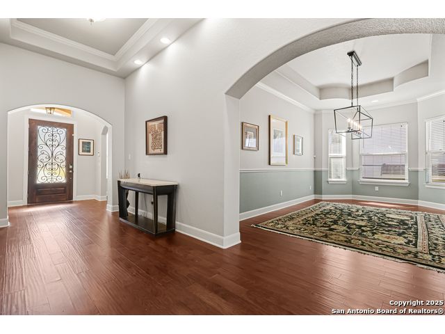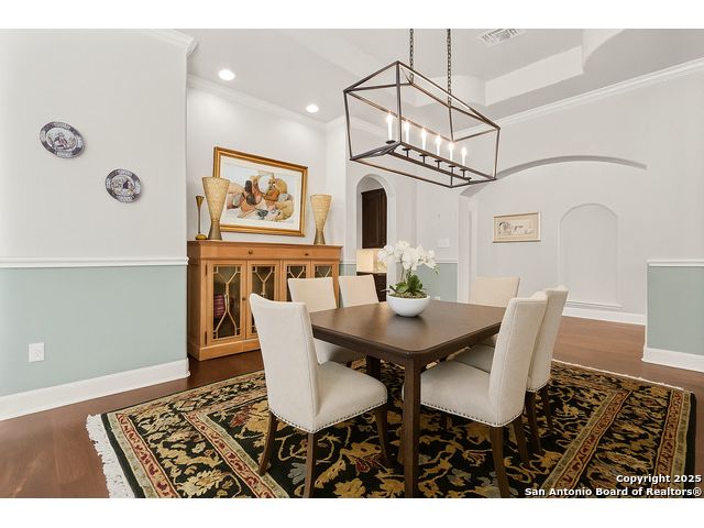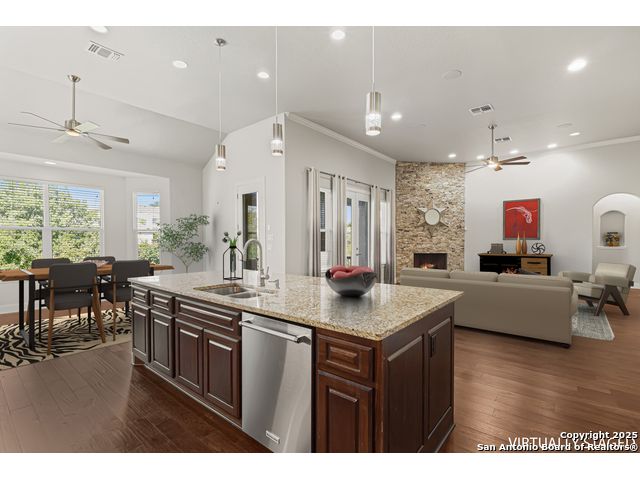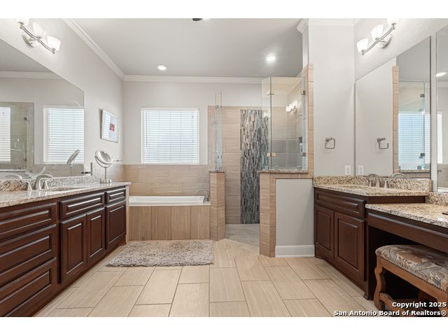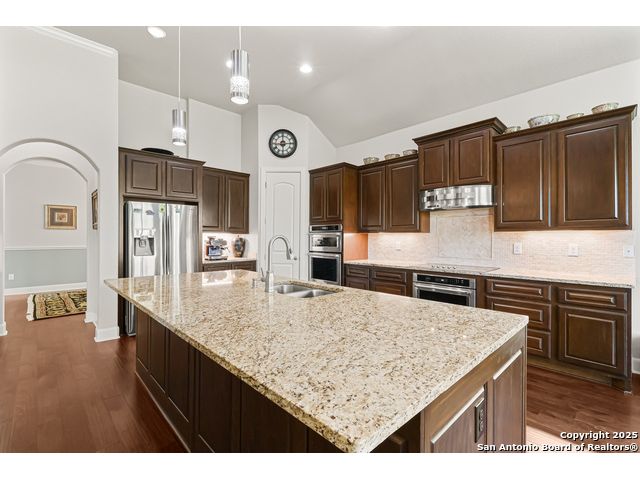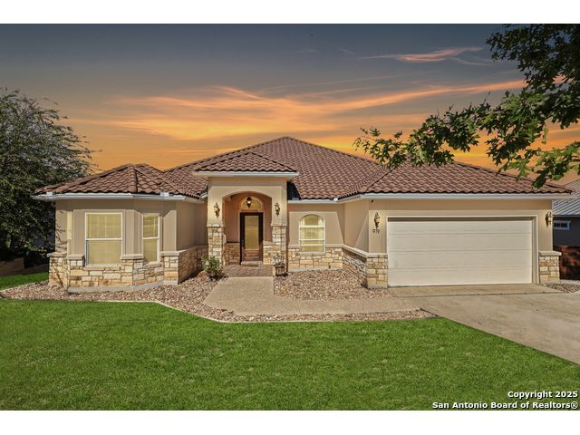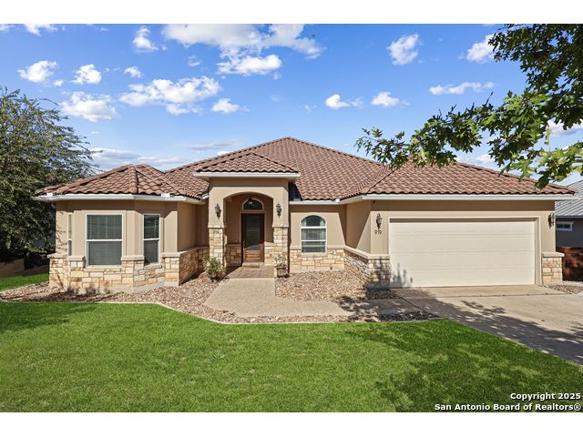 Discover the perfect blend of luxury, comfort, and timeless design in this remarkable custom home. Designed for Refined LivingExperience exceptional craftsmanship and sophistication in this stunning 3-bedroom, 2.5-bath residence, featuring a private study, media room, and formal dining area. The open-concept layout showcases soaring 14-foot ceilings, expansive windows, and abundant natural light, creating an inviting and elegant ambiance throughout. The gourmet kitchen is a culinary masterpiece, complete with cooktop, double ovens, built-in microwave, and an expansive granite island, perfectly complemented by a butler's pantry leading to the dining room. The adjoining living room centers around a beautiful stone fireplace, offering the ideal setting for both intimate gatherings and grand entertaining. Step outside to an impressive 600+ sq. ft. of outdoor living space, featuring a covered patio, outdoor kitchen, deck, flagstone patio and fireplace-an entertainer's dream for year-round enjoyment. The luxurious primary suite is a private retreat boasting a spa-inspired bath and a custom dream closet with direct access to the utility room for ultimate convenience. Every detail exudes quality, from wood and tile flooring and granite surfaces throughout, to built-in speakers in the living area. Additional highlights include a stone and stucco exterior, tile roof, foam insulation, and energy-efficient design. Located in the desirable NEISD within the sought-after Reagan High School zone, residents also enjoy access to exceptional community amenities, including a resort-style pool, tennis and basketball courts, playground, and clubhouse.