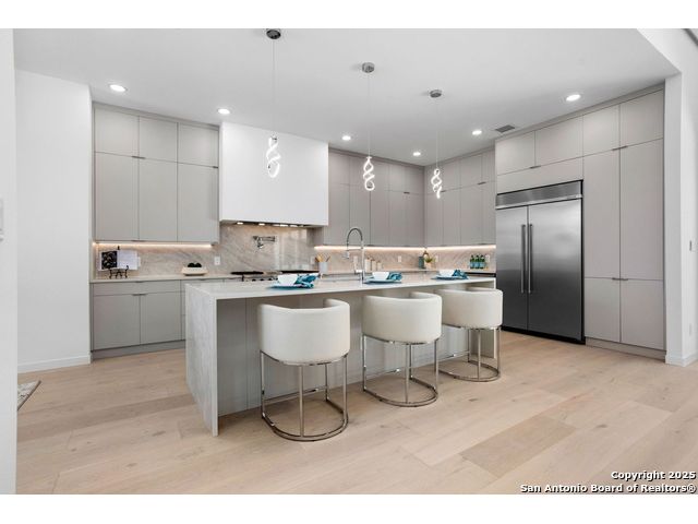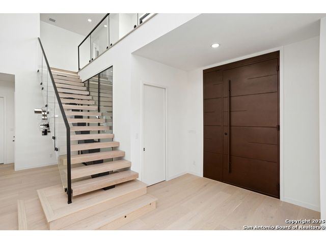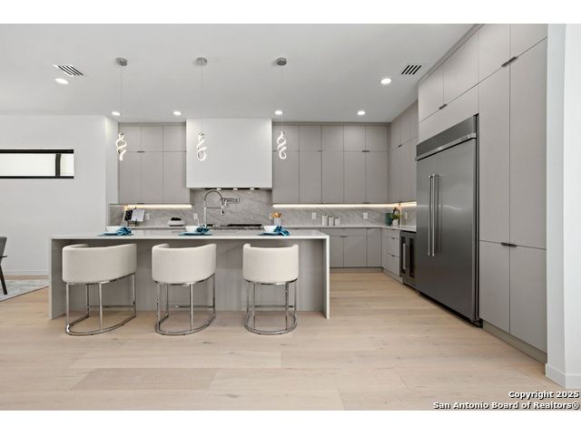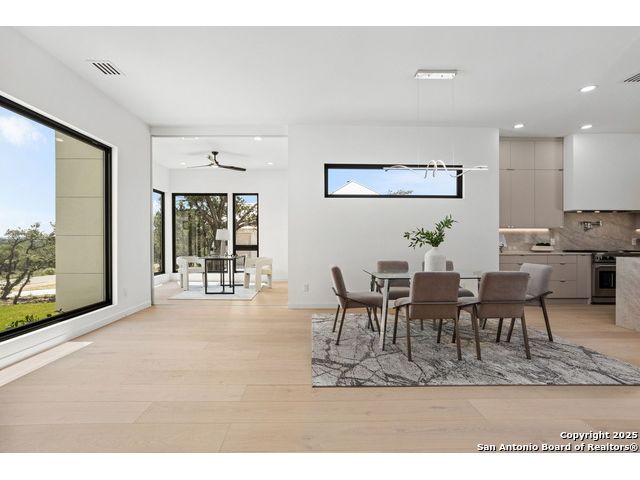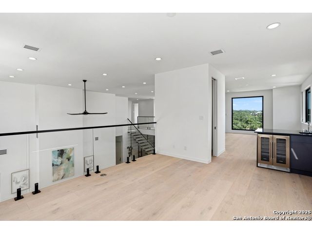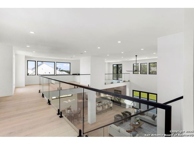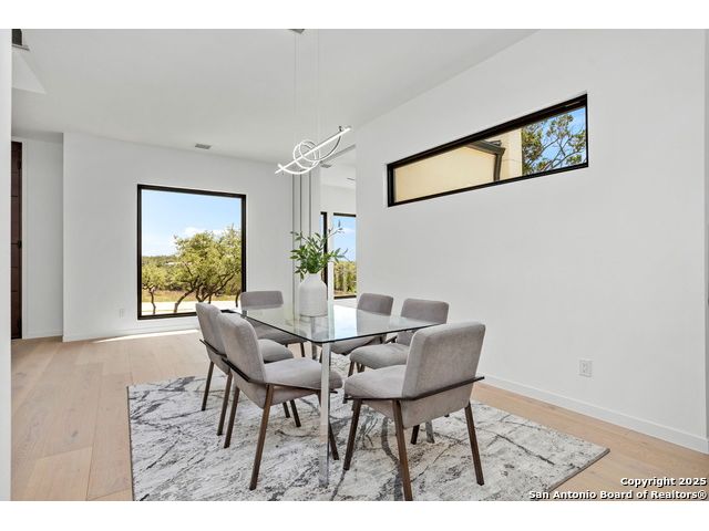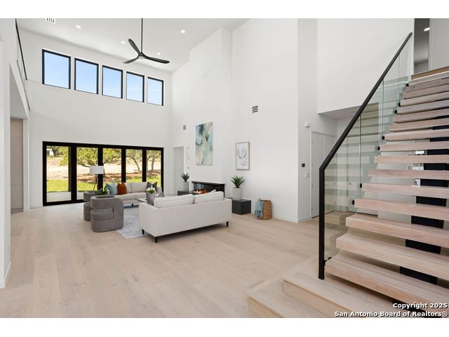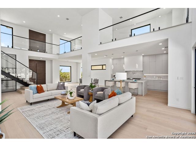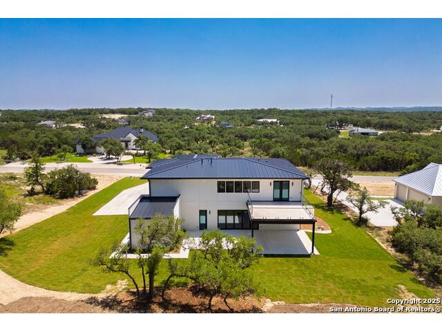 Welcome to your ultimate dream home, a modern masterpiece with luxury details. The home's contemporary appeal is highlighted by its distinctive floating front steps. This exceptional 2-story is nestled on an 1 acre lot, and offers beautiful views of the Texas Hill Country. The open concept design flows seamlessly into the gourmet kitchen, equipped with a 48-inch KitchenAid refrigerator, gas range with double oven, and a convenient microwave drawer. Culinary enthusiasts will appreciate the pot filler that enhances the cooking experience. The ground floor also features a dedicated office space with telescopic 10ft. doors, offering an inspiring work-from home environment. Ascend the floating stairs with glass railing to a second living area that leads out to a glass balcony inviting you to unwind in style. The wine cellar, complete with a self contained cooling system, is ideal for connoisseurs looking to savor their collection in perfect conditions. This home also includes features like an oversized garage with EV plug, and a doggie shower to pamper your furry family members. The fully landscaped exterior is both beautiful and low maintenance offering more time to enjoy the community's amenities. Swimming pool, basketball courts, park, all with controlled access. Don't miss this opportunity to own a luxurious retreat.