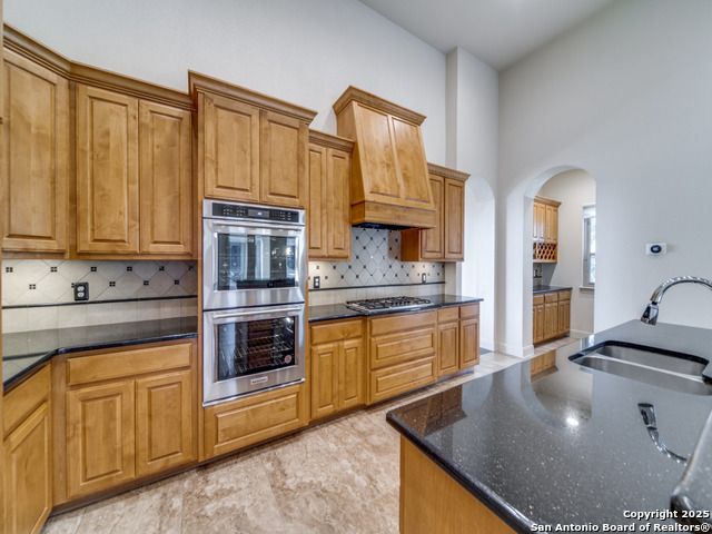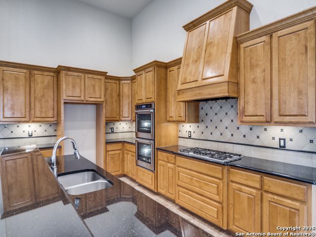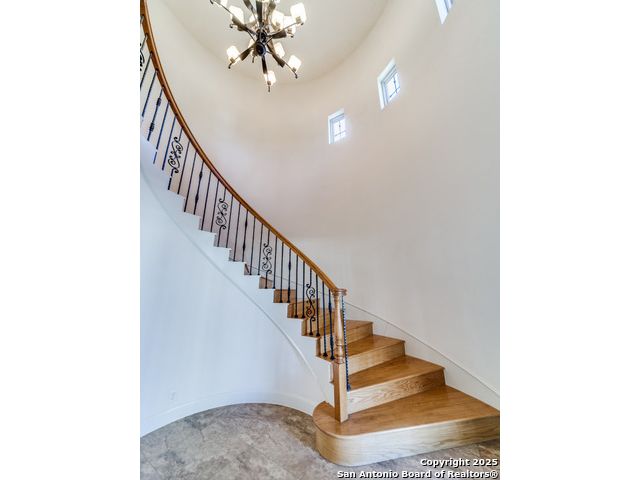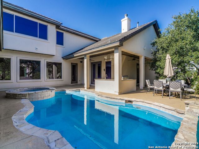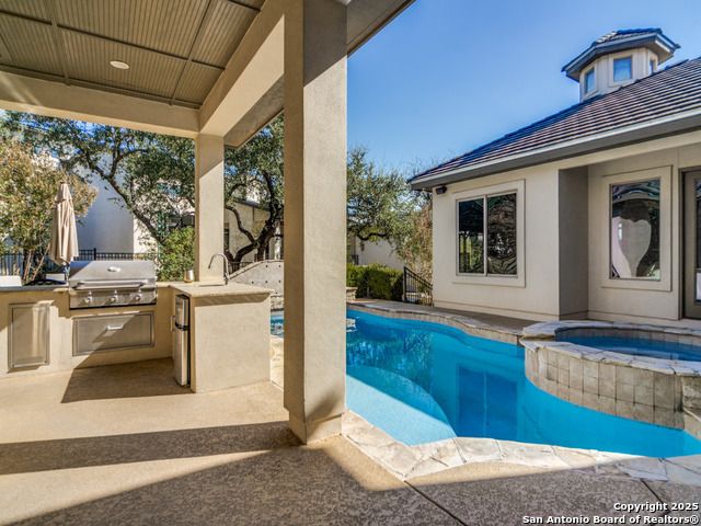 Welcome to 16 Liser Glen, a standout custom home on a double lot-nearly half an acre-in the exclusive, guarded community of The Dominion, home to one of San Antonio's premier country clubs and golf courses. From the moment you step inside, the circular entry with its striking chandelier sets the tone-elegant, inviting, and thoughtfully designed. The open layout wraps around a sparkling heated pool and spa, offering peaceful views and effortless indoor-outdoor living that's perfect for entertaining. The gourmet kitchen features Bosch stainless steel appliances and a direct view of the pool, so you're always connected to the heart of the home. The spacious primary suite includes a bonus room ideal for a private retreat, home office, or second closet. A secondary bedroom and full bath are also on the main level, along with a game room that opens to the large side yard. Upstairs, a huge bonus room makes a great media or playroom, while two additional bedrooms and a cozy living area create the perfect space for kids or guests. Outside, mature trees and the expanded lot provide a private, resort-like setting complete with pool, spa, and outdoor kitchen. With 3,710 square feet, four bedrooms, three baths, a three-car garage, no carpet, and Energy Star certification, this home blends luxury, comfort, and peace of mind.
