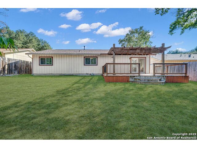 Welcome to this charming 4-bedroom, 2-bath home located in the desirable Valley Forge neighborhood! Step inside to a spacious open layout featuring a cozy fireplace, perfect for relaxing evenings with family and friends. The kitchen and dining provide ceramic tile in both areas which flow seamlessly for easy entertaining. Retreat to the primary suite offering comfort and privacy. Enjoy outdoor living year-round with an oversized patio and pergola, ideal for gatherings or quiet mornings with coffee. Conveniently located minutes from IKEA, San Antonio International Airport, Morgan's Wonderland and Randolph AFB. This home offers the perfect blend of comfort and convenience. Schedule your showing today!