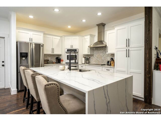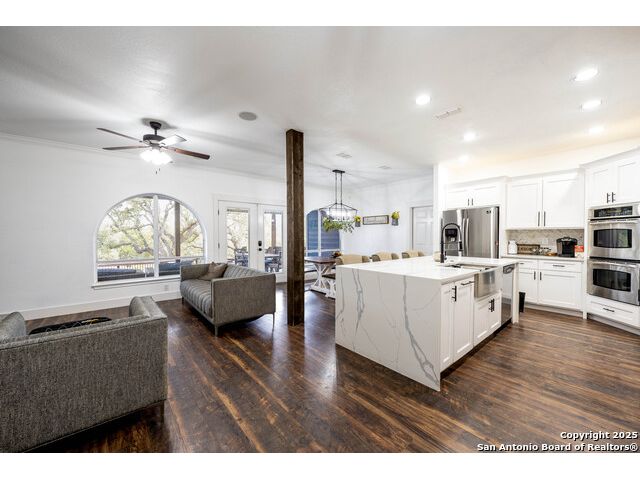 Fully remodeled waterfront home built in 2005, approx. 2568 sqft*2 beautiful oak trees. Lot approximately .84ac. Custom wood cabinets, quartz countertops, tile backsplash, 8ft island, stainless steel appliances, built-in double ovens, microwave, dishwasher, refrigerator + black smooth cooktop, 2 huge arched windows w/view of lake, utility room with washer and dryer connections, High garage for a boat, covered patio with fans to block the sun and enjoy the outside view.
