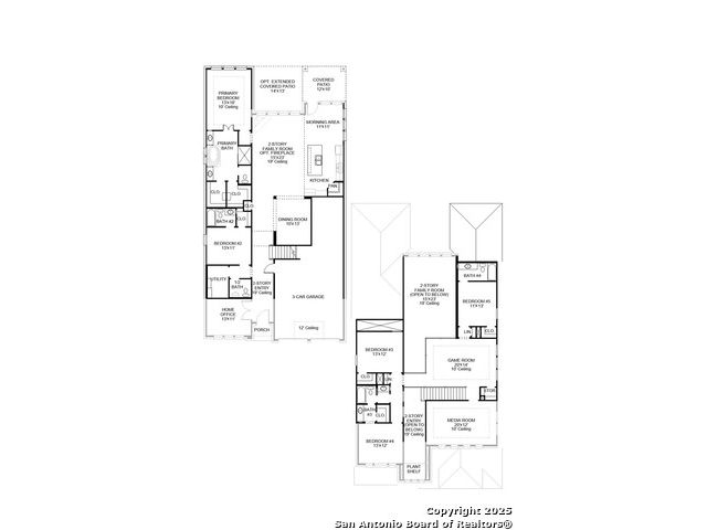 Home office with double doors frame the entry. The two-story entry extends past the dining room to the kitchen and family room. Island kitchen offers built-in seating space, a 5-burner gas cooktop and a corner walk-in pantry. Formal dining room. Two-story family room with 19-foot ceiling and a wall of windows. Morning area just off the kitchen offers a beautiful view of the backyard. Primary suite with three large windows. Primary bathroom features a French door entry, dual vanities, garden tub, separate glass enclosed shower and two walk-in closets. Guest suite with a full bathroom and a walk-in closet on first level. Second floor hosts a large game room, media room, an additional guest suite and secondary bedrooms with a Hollywood bathroom. Additional storage space, half bathroom, linen closet and a utility room completes this generous design. Extended covered backyard patio and a 5-zone sprinkler system. Three-car garage.