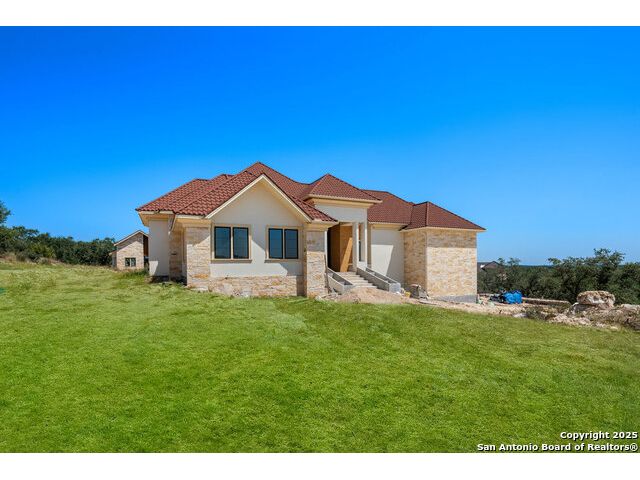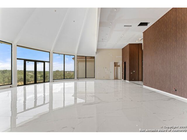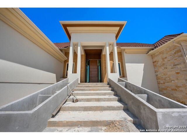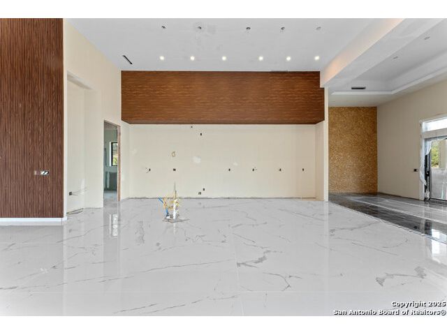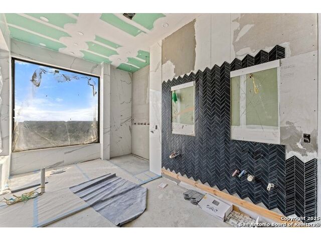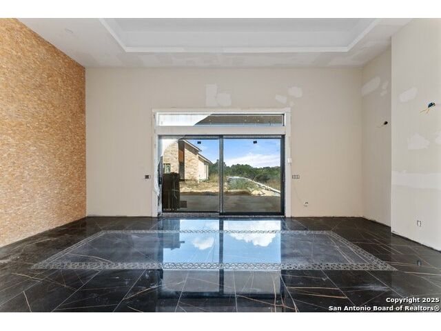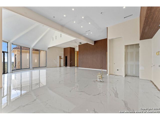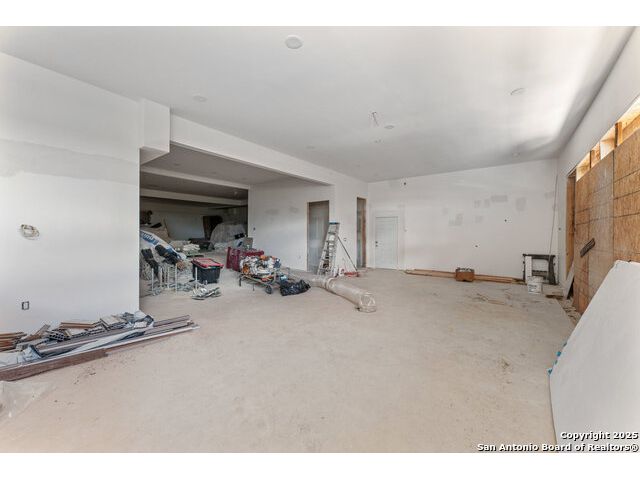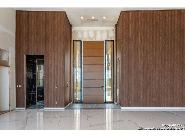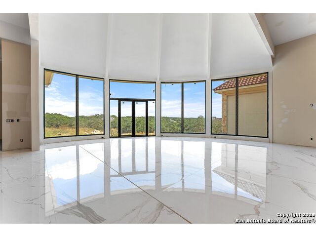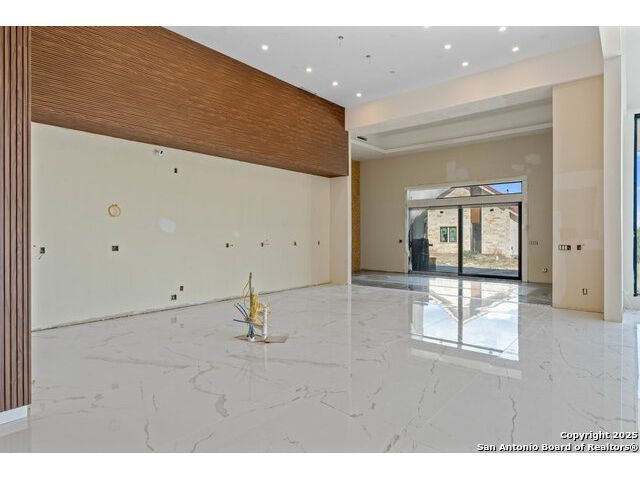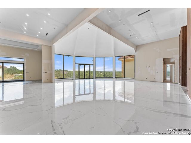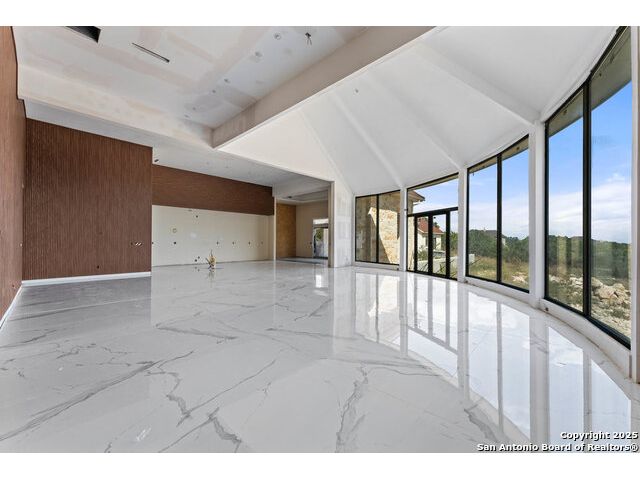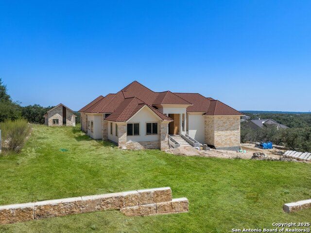 Located in the exclusive gated community of Cooper Ridge in New Braunfels, this nearly complete luxury estate offers over 5,500 sq ft in the main home plus a 1,000 sq ft guest house on almost two acres of Hill Country land. Currently about 80 done complete and projected to be worth around $2.3 million once finished, this property presents an incredible opportunity for an investor seeking strong profit potential or a homeowner looking to customize their forever home with built-in equity already in place. Designed with both elegance and lifestyle in mind, it features a four-car garage with flex or man cave potential, a wellness level downstairs with a gym, jacuzzi, sauna, steam room, and ample storage. High-end finishes include 120x240 cm ceramic tile floors, wood accents, and custom wall paneling. The living room impresses with a soaring 32-foot ceiling and 12-foot glass facade panels that open seamlessly to the backyard and pool area, anchored by a stunning 9 ft x 14 ft custom front door. Every detail from the tile roofing to the interior craftsmanship has been executed at a high standard, making this as-is offering a rare chance to complete a masterpiece in one of New Braunfels' most desirable communities.