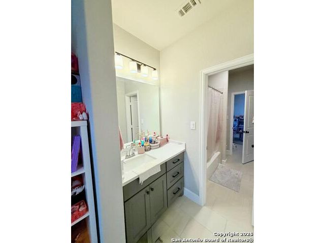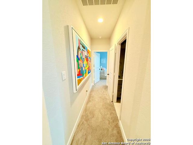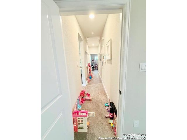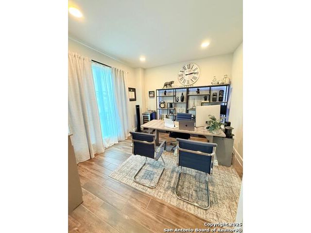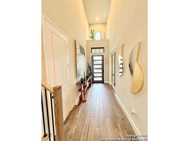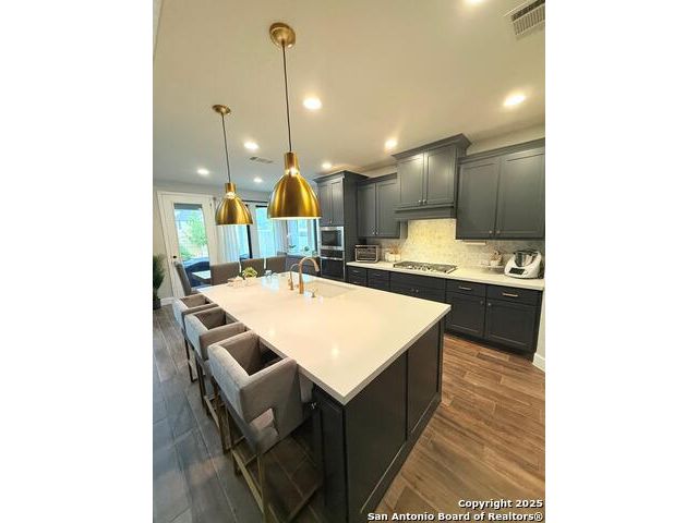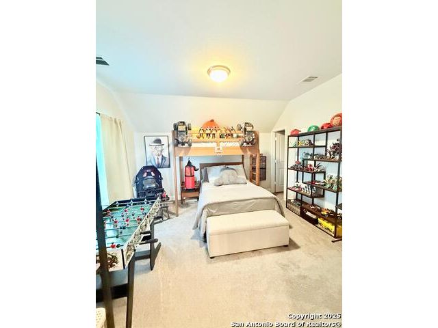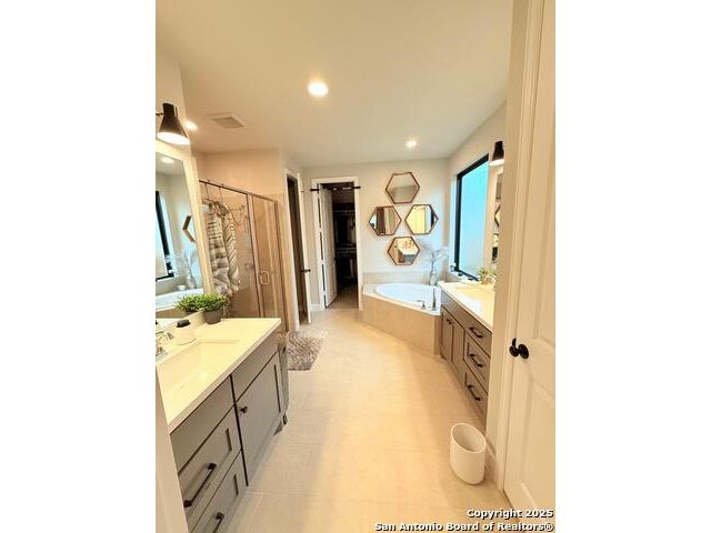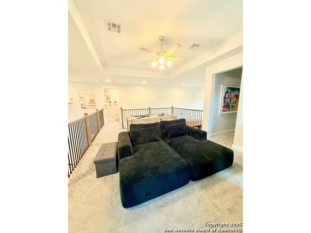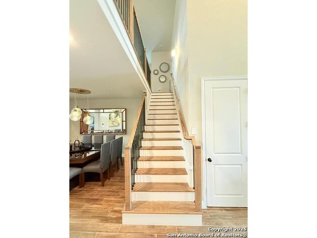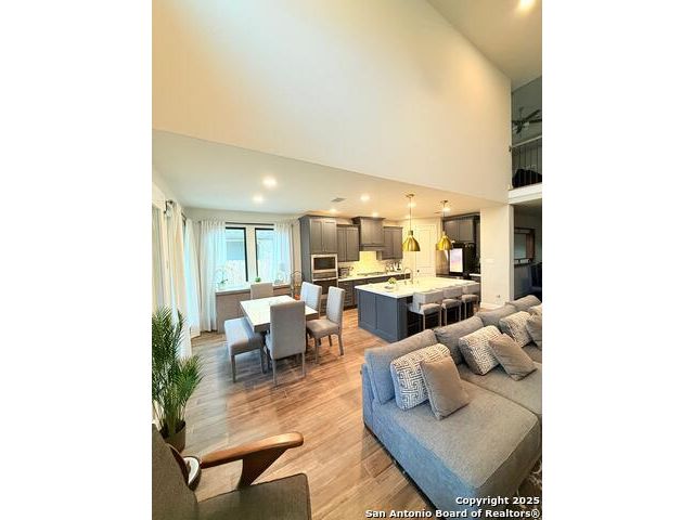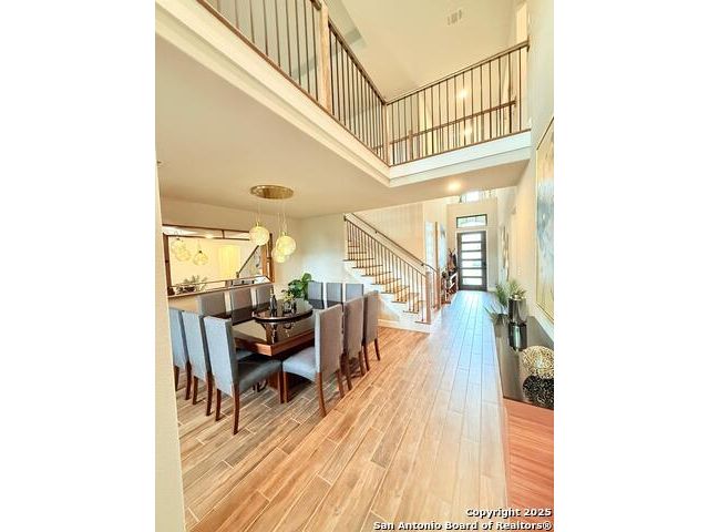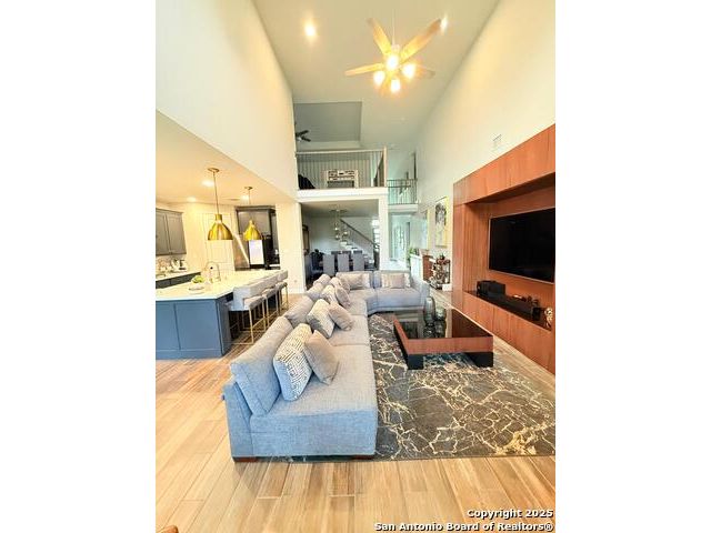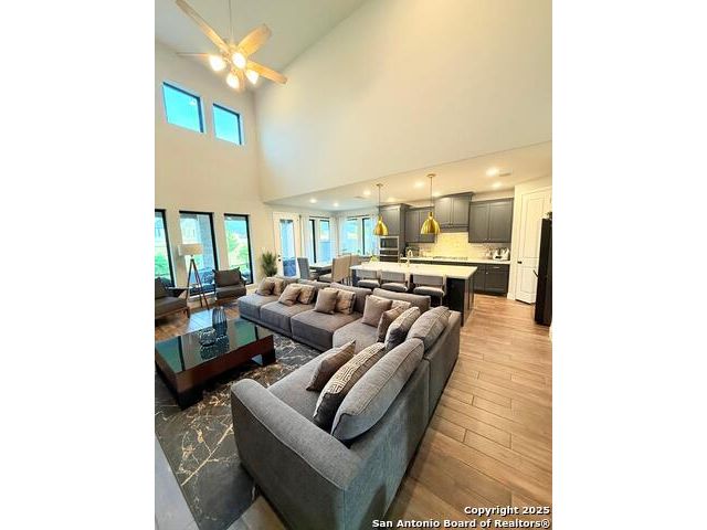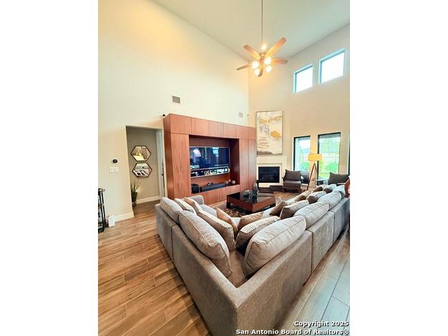 Stunning two-story home in the desirable Fox Grove community near Boerne. Features a grand entry with French doors leading to a private home office, and an open formal dining area that connects seamlessly to the gourmet kitchen with a large island, 5-burner gas cooktop, walk-in pantry, and bright morning area. The spacious family room offers 19-foot ceilings, a cast stone fireplace, and a wall of windows for abundant natural light. The primary suite provides a relaxing retreat with two vanities, garden tub, separate glass-enclosed shower, and an oversized walk-in closet. Upstairs includes a large game room, secondary bedrooms, and a Hollywood bath. Enjoy outdoor living on the extended covered patio overlooking a low-maintenance backyard with artificial grass. This property includes a three-car garage with ample storage. Community amenities include a pool, pickleball courts, playground, barbecue areas, and event tables-perfect for gatherings and recreation.