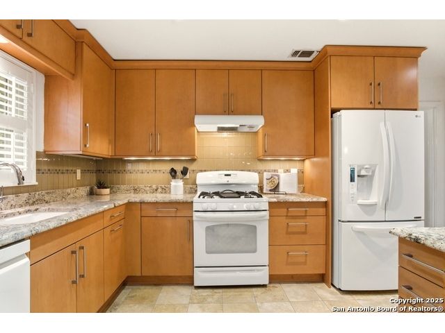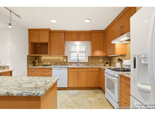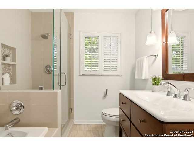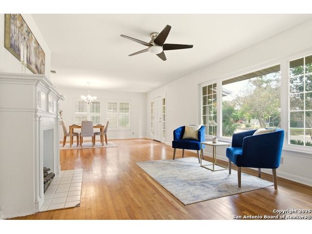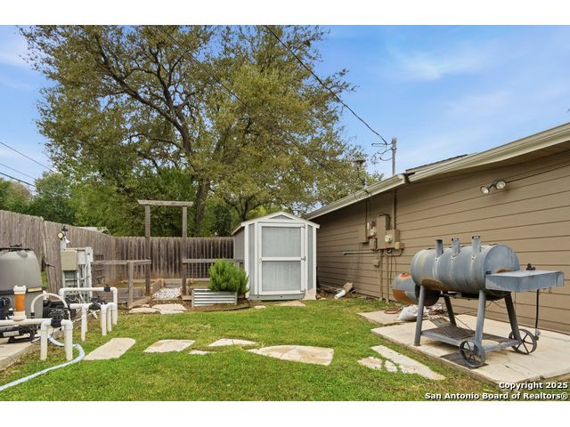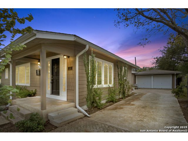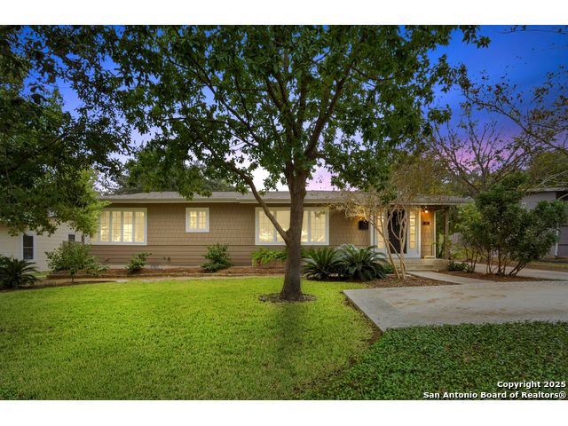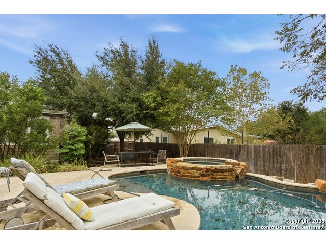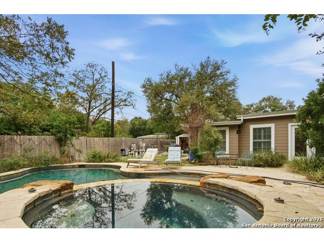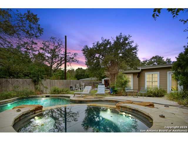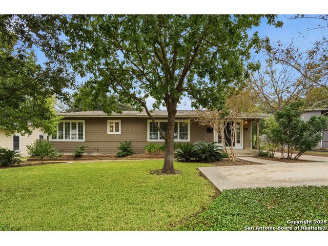 Stunning one-story residence nestled in the heart of coveted Terrell Hills - this bespoke 3-bedroom, 2-bath home delivers upscale living with thoughtful upgrades and outdoor resort-style amenities. An open floor plan flows effortlessly through two spacious living zones, one anchored by a cozy gas-burning fireplace - ideal for relaxed evenings or entertaining guests. The functional office/bonus room adds versatile space for work or play. The chef's kitchen is outfitted with premium gas range, full-size refrigerator & dishwasher, solid surface countertops and abundant cabinetry. A dedicated laundry room with washer and dryer hookups enhances everyday convenience. The primary suite features a spa-inspired ensuite bath with walk-in shower, garden tub, double vanity and large walk-in closet - your private retreat. Step outside to your own backyard oasis: lush mature trees define the fenced yard, where a heated inground pool and adjacent hot tub/spa invite seasons-long enjoyment. A storage shed offers extra utility and the fenced garden area is perfect for cultivating organic vegetables, fruits and herbs. The two-car garage includes a dedicated Tesla charger and the home is equipped with paid solar panels, significantly enhancing energy efficiency and long-term value. Located on a generous 10,600+ sq ft lot in Terrell Hills, this home blends modern amenities with outdoor luxury. Don't miss the opportunity to own a turnkey sanctuary that checks every box for comfort, style and smart investment.