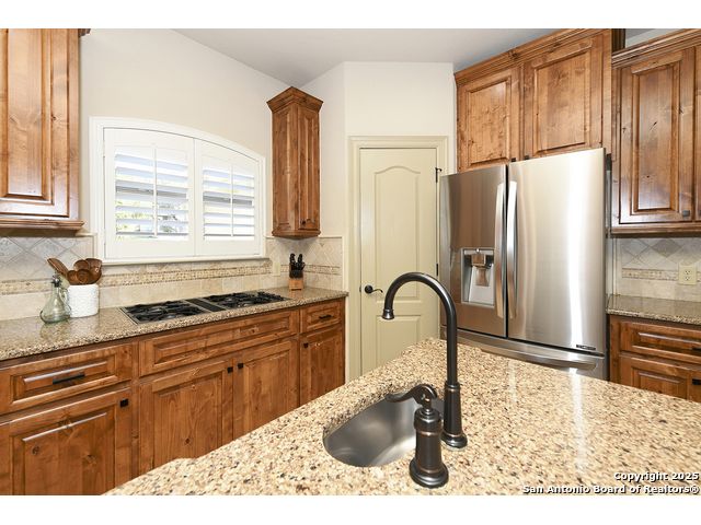 Rare opportunity for Hill Country living on 2.67 acres in The Heights at Comal Trace! Homes in this section rarely come on the market, making this a unique chance to own a custom single-story home in one of Comal County's most desirable locations. Nestled at the back of the community, the property offers exceptional privacy while keeping you close to shopping and dining. Surrounded by mature oaks and a wooded greenbelt, the setting feels like a Hill Country retreat with abundant wildlife including deer and turkey. The open-concept layout features 4 bedrooms plus an office, 3.5 baths, and abundant natural light. The chef's kitchen is a true centerpiece with an oversized island, gas cooktop, double ovens, and walk-in pantry, flowing into a spacious living area with Austin stone accents and a wood-burning fireplace with gas starter. Elegant finishes include polished travertine tile, plantation shutters, and large windows framing serene views. The primary suite offers porch access and a spa-inspired bath with jetted tub, walk-in shower, and dual walk-in closets. Secondary bedrooms provide generous storage, including two walk-ins, and one features bamboo flooring ideal for a craft or art space. The laundry room includes a utility sink, built-in ironing board, space for an extra refrigerator or freezer, and a walk-in storage closet. Outdoor living shines with a covered porch, composite deck, oversized flagstone patio, and a large deer-proof fenced garden with raised beds and timed irrigation. The whimsical flagstone drainage feature adds charm. The 3-car garage includes a workbench, and the extended, widened driveway offers extra parking and RV-friendly features including a 30-amp outlet for convenient trip preparation. Plenty of room to add a pool, RV garage, or casita (subject to ACC approval). This property blends Hill Country charm with modern convenience-a rare find in Comal County!