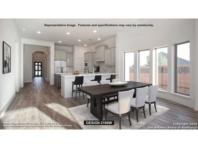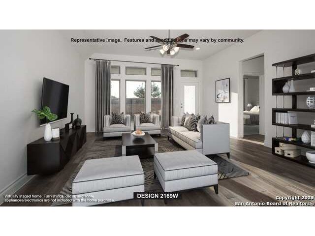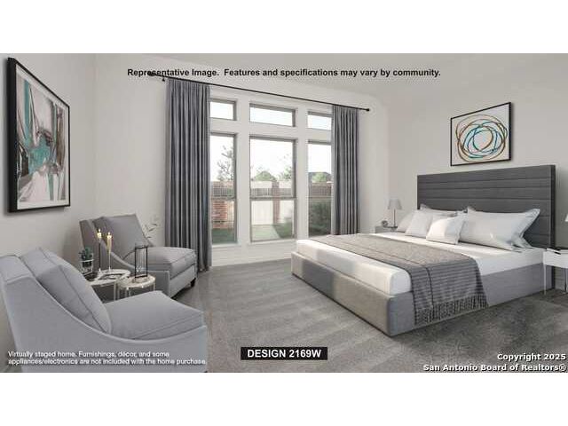 Extended entry with 12-foot ceiling leads to open kitchen, dining area and family room with 10-foot ceilings throughout. Kitchen features center island with built-in seating and a 5-burner gas cooktop. Family room features wall of windows. Primary suite with 10-foot ceiling and wall of windows. Dual vanities, garden tub, separate glass-enclosed shower and large walk-in closet in primary bath. A guest suite with private bath adds to this four-bedroom home. Covered backyard patio. Mud room off two-car garage.